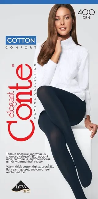 Теплые матовые колготки COTTON связаны из мягких, согревающих нитей хлопка. Колготки безупречно облегают, согревают и сохраняют тепло, оставаясь непрозрачными по всей длине ноги. Классическая модель для очень холодной погоды. LYCRA®: прочные, устойчивые к зацепкам и облегающие словно "вторая кожа" - именно такими свойствами обладают колготки, в состав которых включено волокно LYCRA.