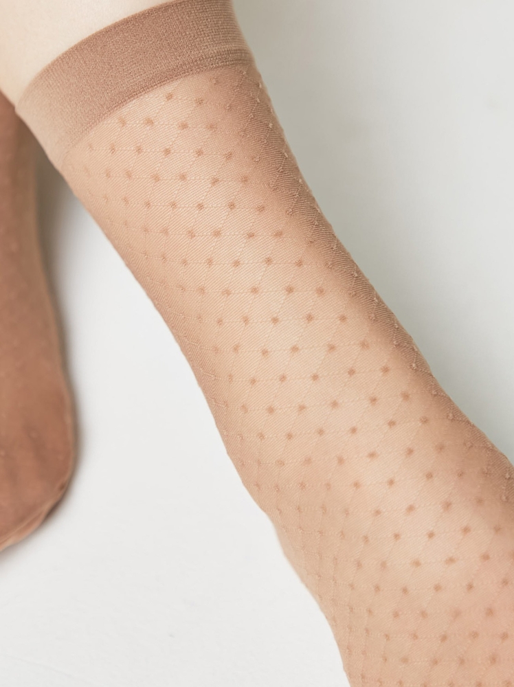 Эластичные полупрозрачные носки в горошек станут стильным акцентом вашего модного образа. Вы оцените удобный эластичный борт и комфортную облегающую посадку на ноге.