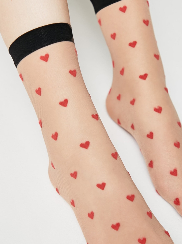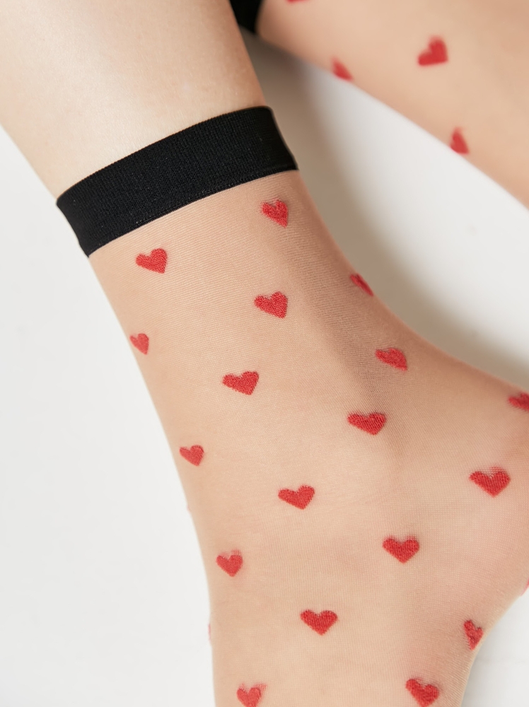 Тонкие фантазийные носки с рисунком «сердечки», выполненном из красной полипропиленовой нити – идеальное дополнение к романтичному образу современной девушки. Носки эластичные, легкие, безупречно облегающие ногу, поэтому в них будет комфортно на протяжении всего дня.