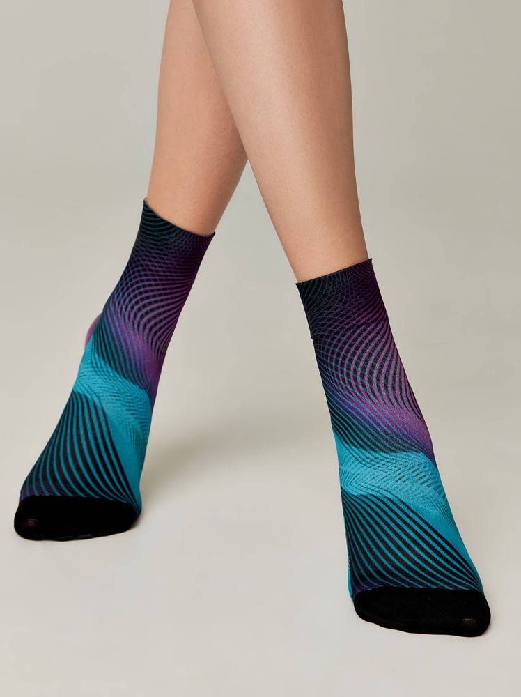 Плотные носки с особенно устойчивым рисунком, нанесенным с помощью термотрансферной печати, станут стильным и индивидуальным акцентом в повседневных образах. Термотрансферная печать - процесс, при котором специальная краска на бумажном носителе резко нагревается, переходит из твердого состояния в газообразное и переносится с бумаги на носки, глубоко проникая в волокна и создавая устойчивое изображение. · 70 den· плотные и эластичные· рисунок, нанесенный с помощью термотрасферной печати· использование черной полиамидной нити для контрастности рисунка· мысок выделен черной полиамидной нитью· эффект 3D· c бортом· без пятки· стиль начинается с индивидуальности.
