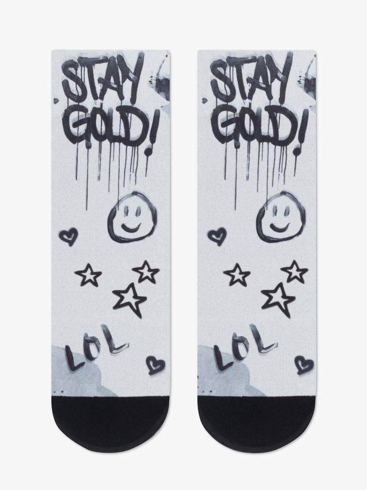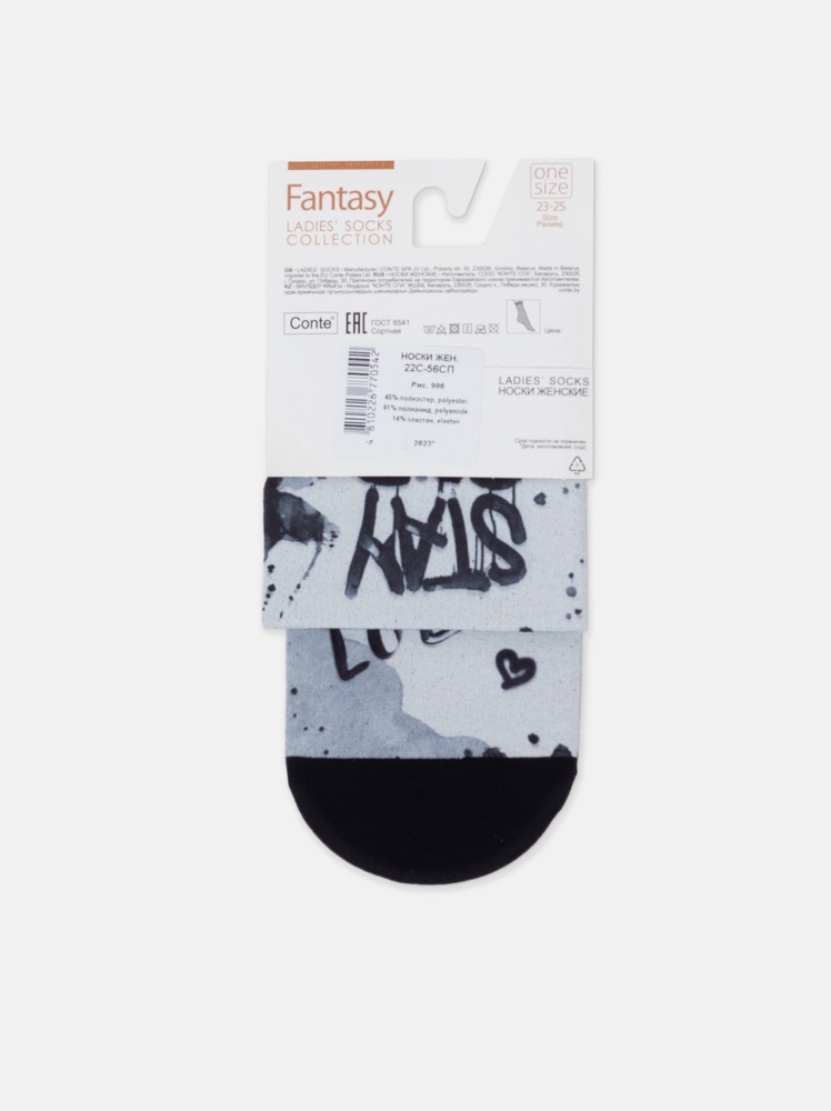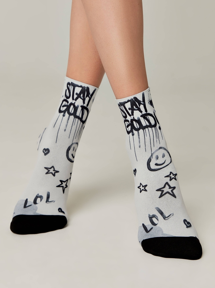 Плотные носки с особенно устойчивым рисунком, нанесенным с помощью термотрансферной печати, станут стильным и индивидуальным акцентом в повседневных образах. Термотрансферная печать - процесс, при котором специальная краска на бумажном носителе резко нагревается, переходит из твердого состояния в газообразное и переносится с бумаги на носки, глубоко проникая в волокна и создавая устойчивое изображение. · 70 den· плотные и эластичные· рисунок, нанесенный с помощью термотрасферной печати· использование черной полиамидной нити для контрастности рисунка· мысок выделен черной полиамидной нитью· эффект 3D· c бортом· без пятки· стиль начинается с индивидуальности.