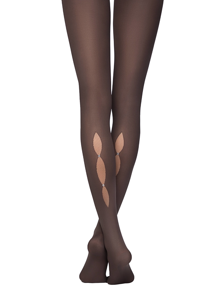Плотные женские фантазийные колготки с рисунком пробивка и стразами, расположенными зада на ноге, плоский шов, хлопковая ластовица.