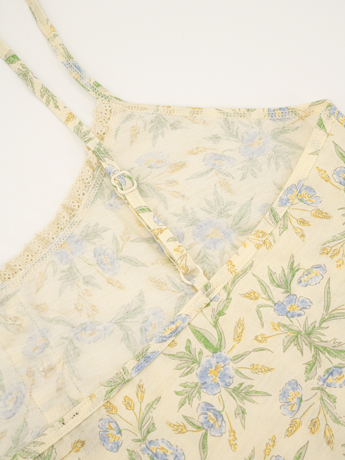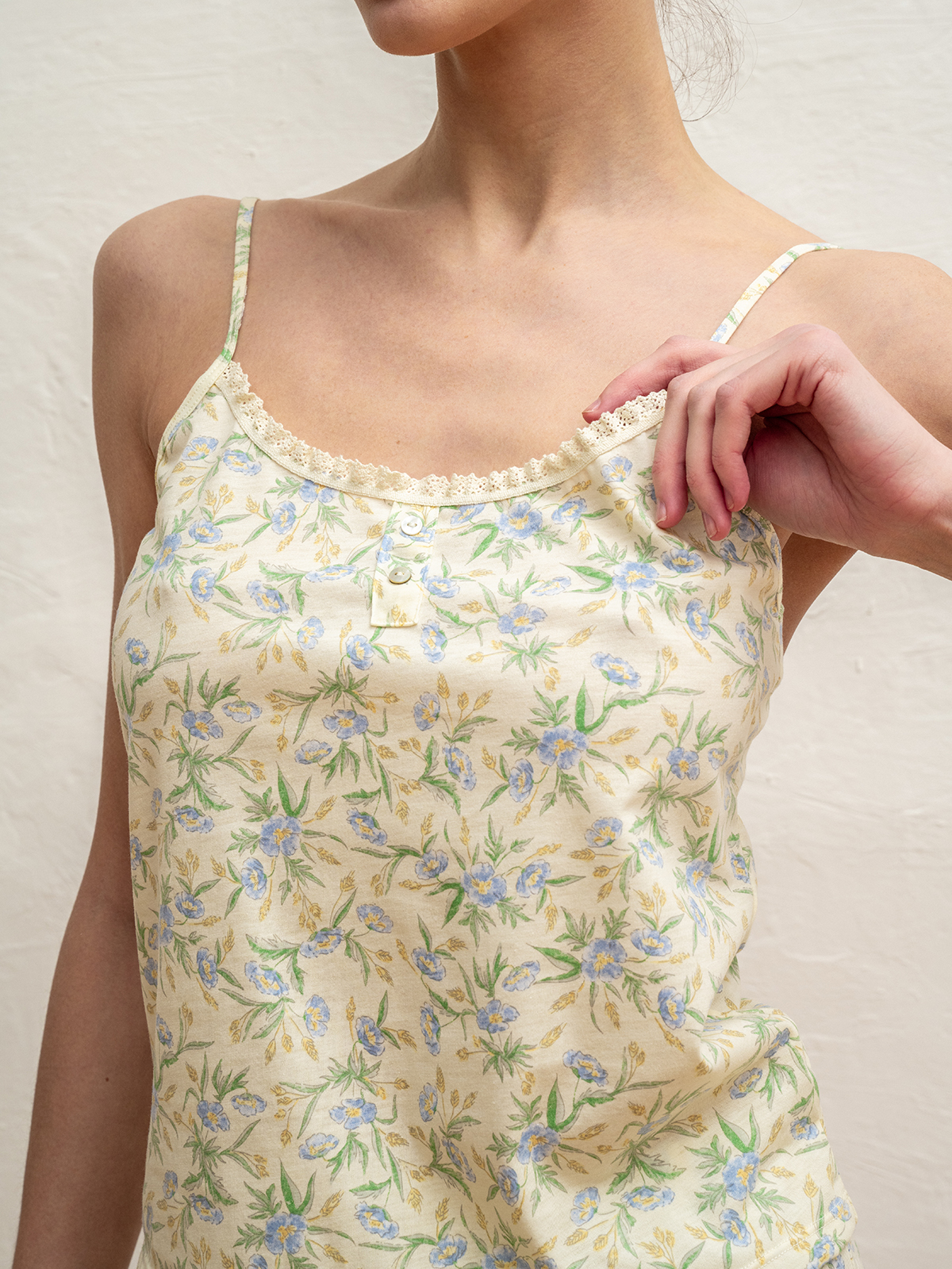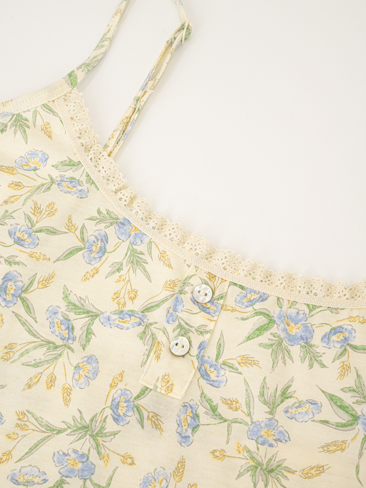 Майка на тонких регулируемых бретелях имеет две декоративный пуговицы в зоне декольте.