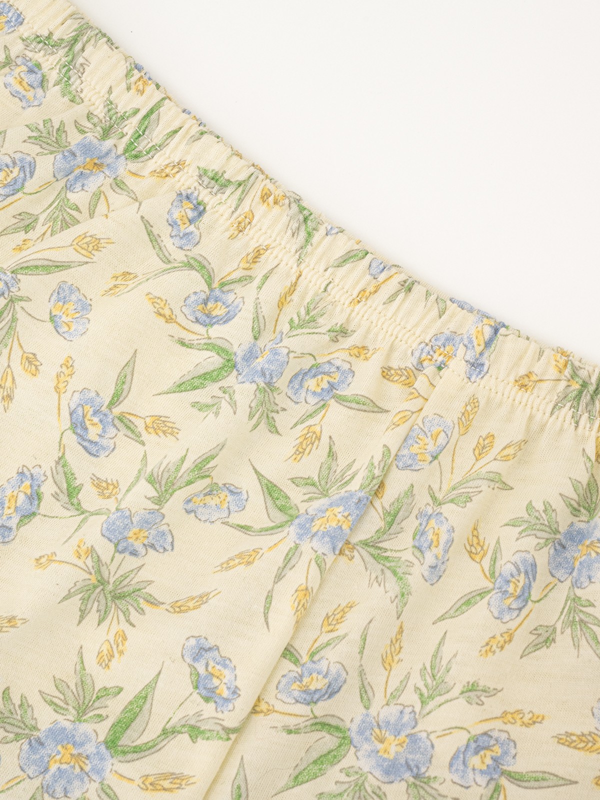 Пижама выполнена в молочным цвете с нанесённым на неё цветочным принтом.