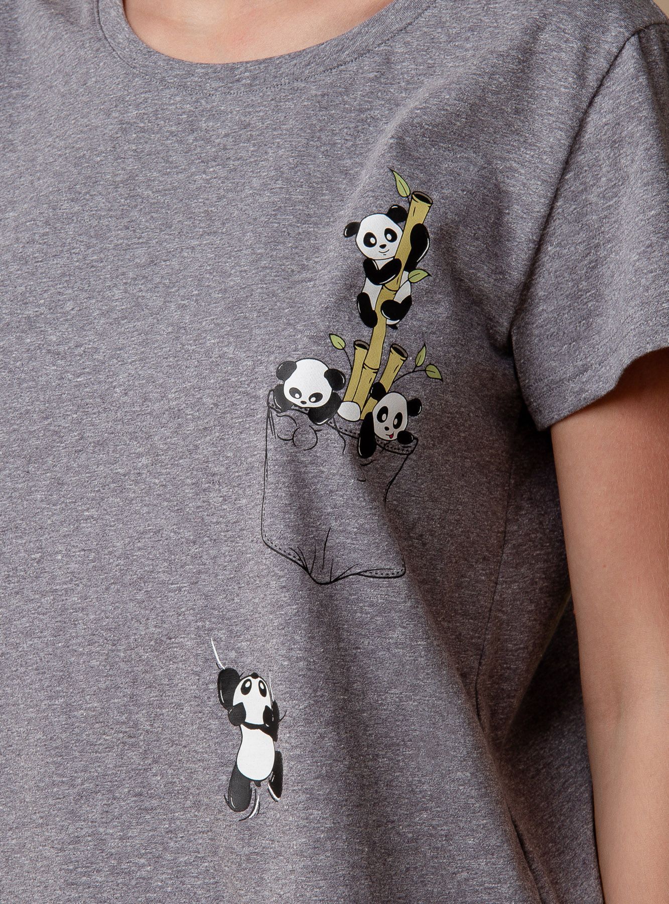 Женская пижама состоит из шорт и футболки. Футболка выполнена из смеси полиэстера и хлопка, а шорты изготовлены из хлопка, что делает данную пижаму мягкой и приятной к телу. Футболка имеет короткие рукава и круглый вырез, что обеспечивает свободу движений. Принт в виде панд добавляет женственности и романтичности этой пижаме.