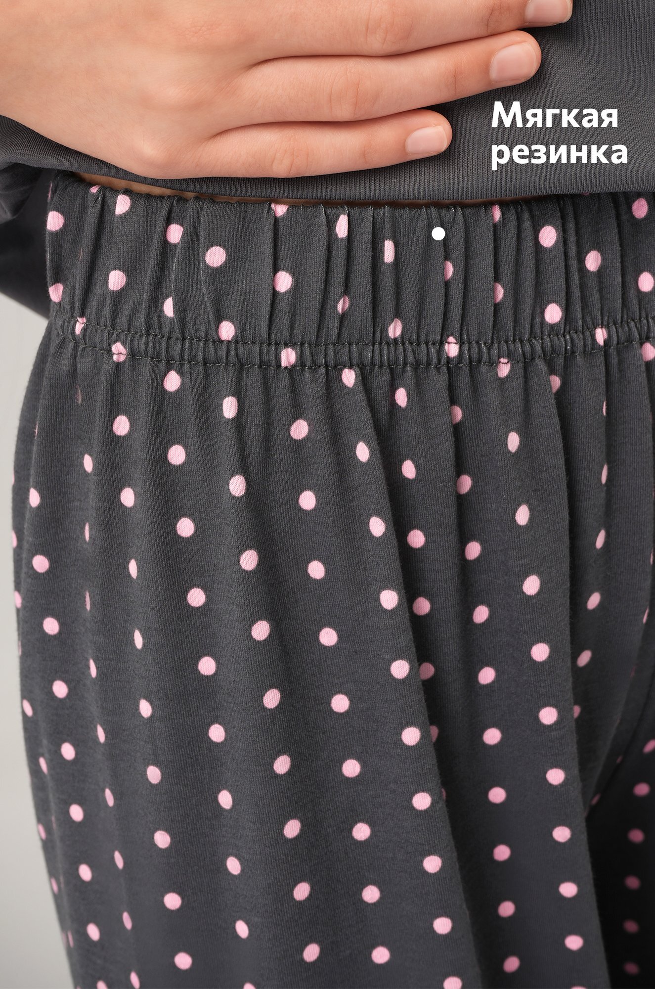 — брюки в горох на мягкой резинке в поясе.
