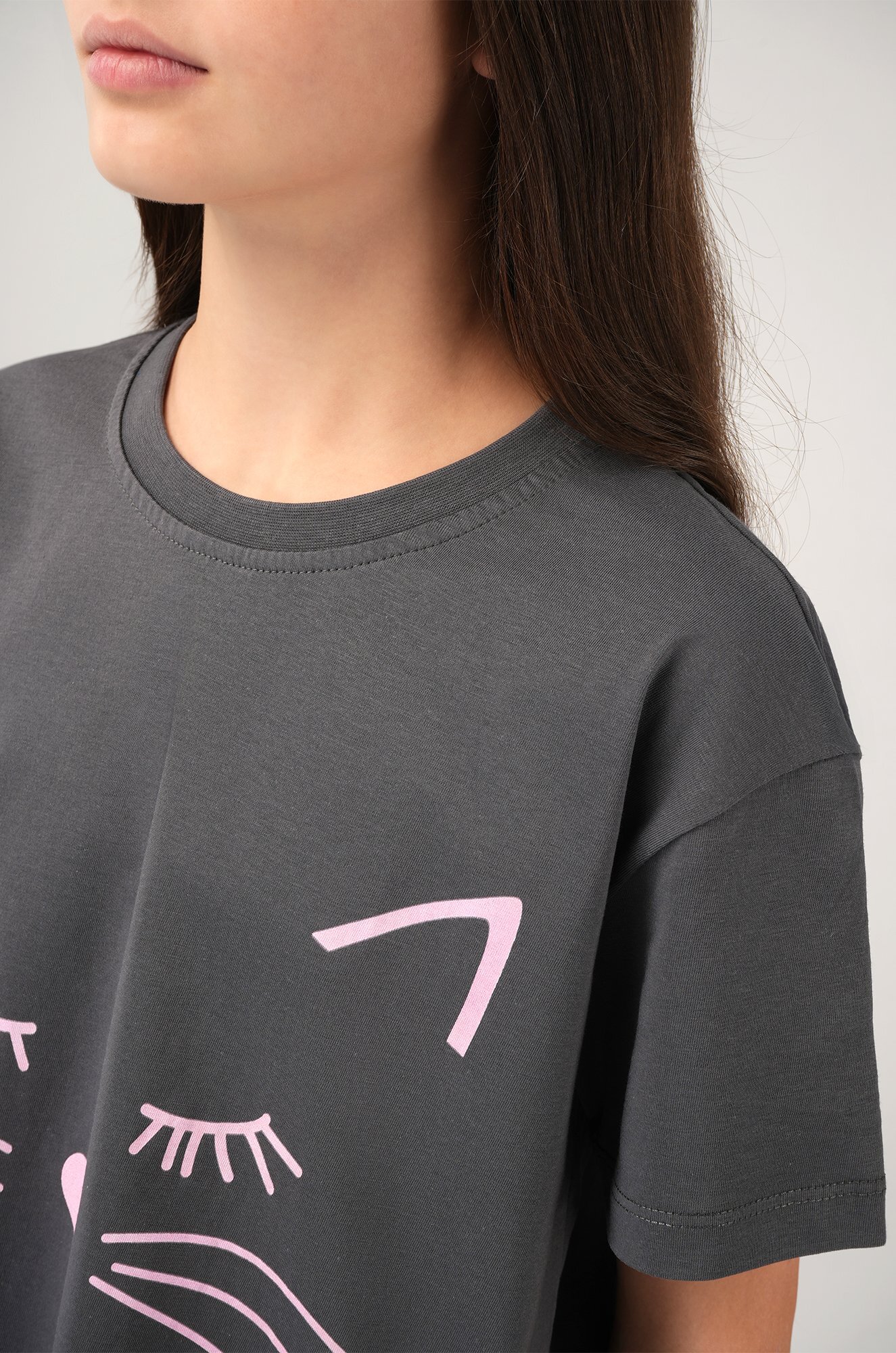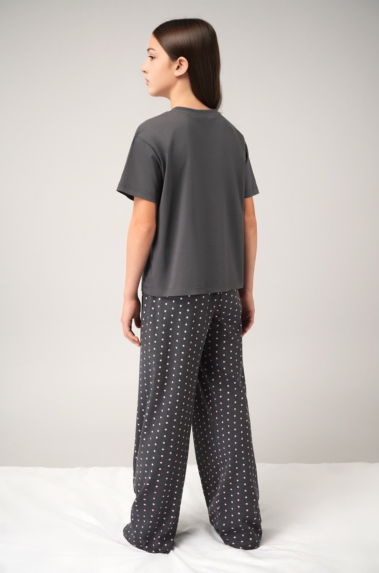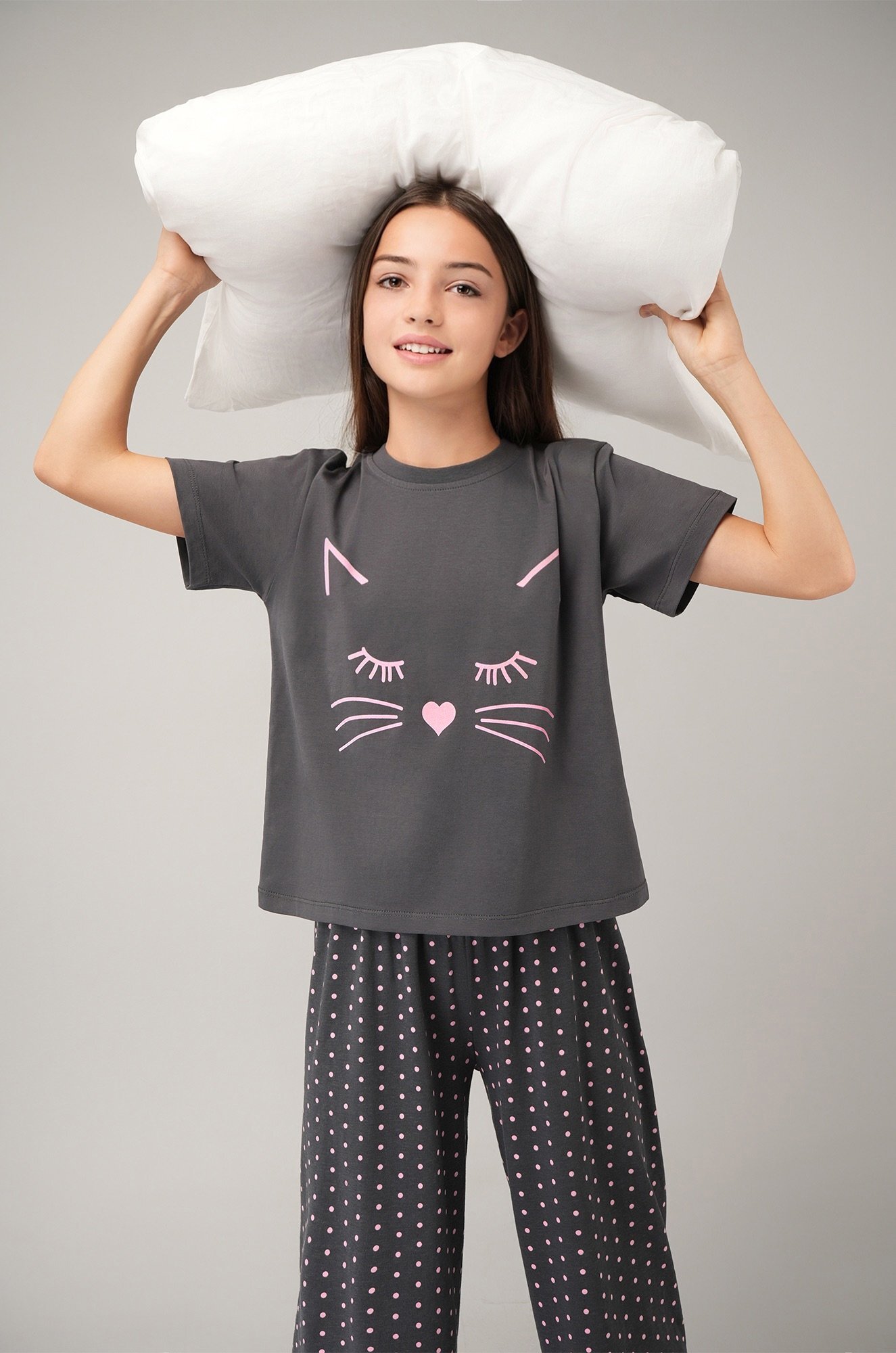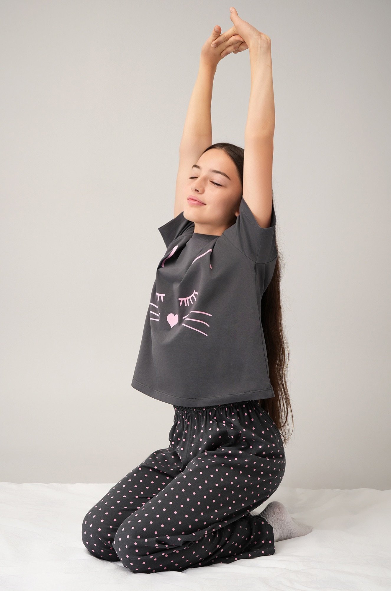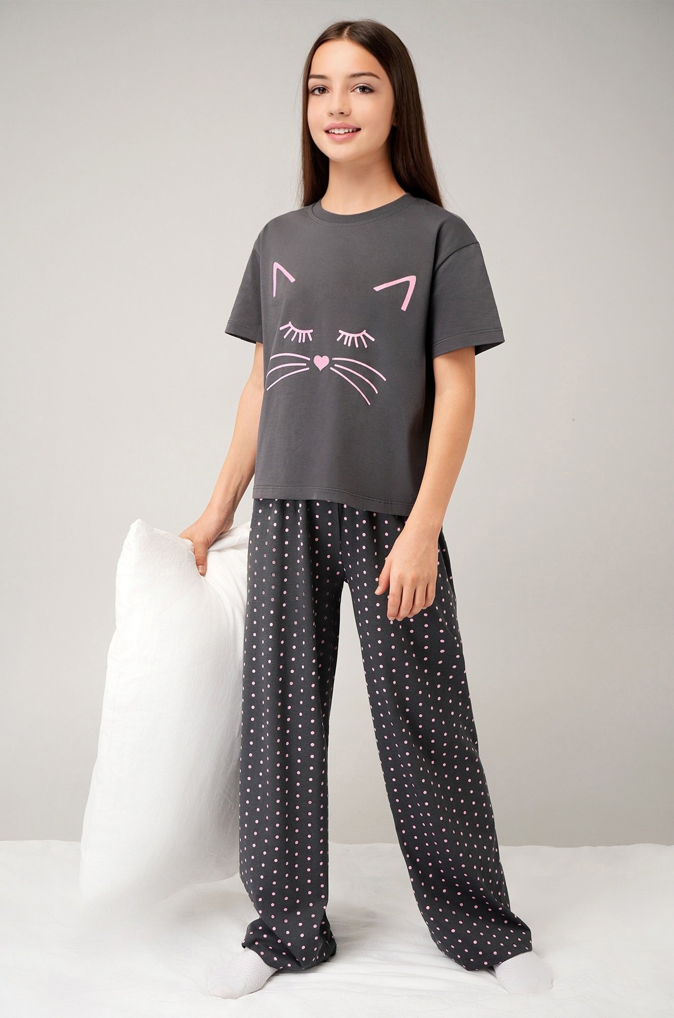 Детская пижама для девочки и девочки подростка — отличный выбор для сна и отдыха. Свободная футболка со спущенным плечом украшена принтом Котик, а широкие штаны на резинке дополнены атласным бантом на поясе и рисунком в горошек.
