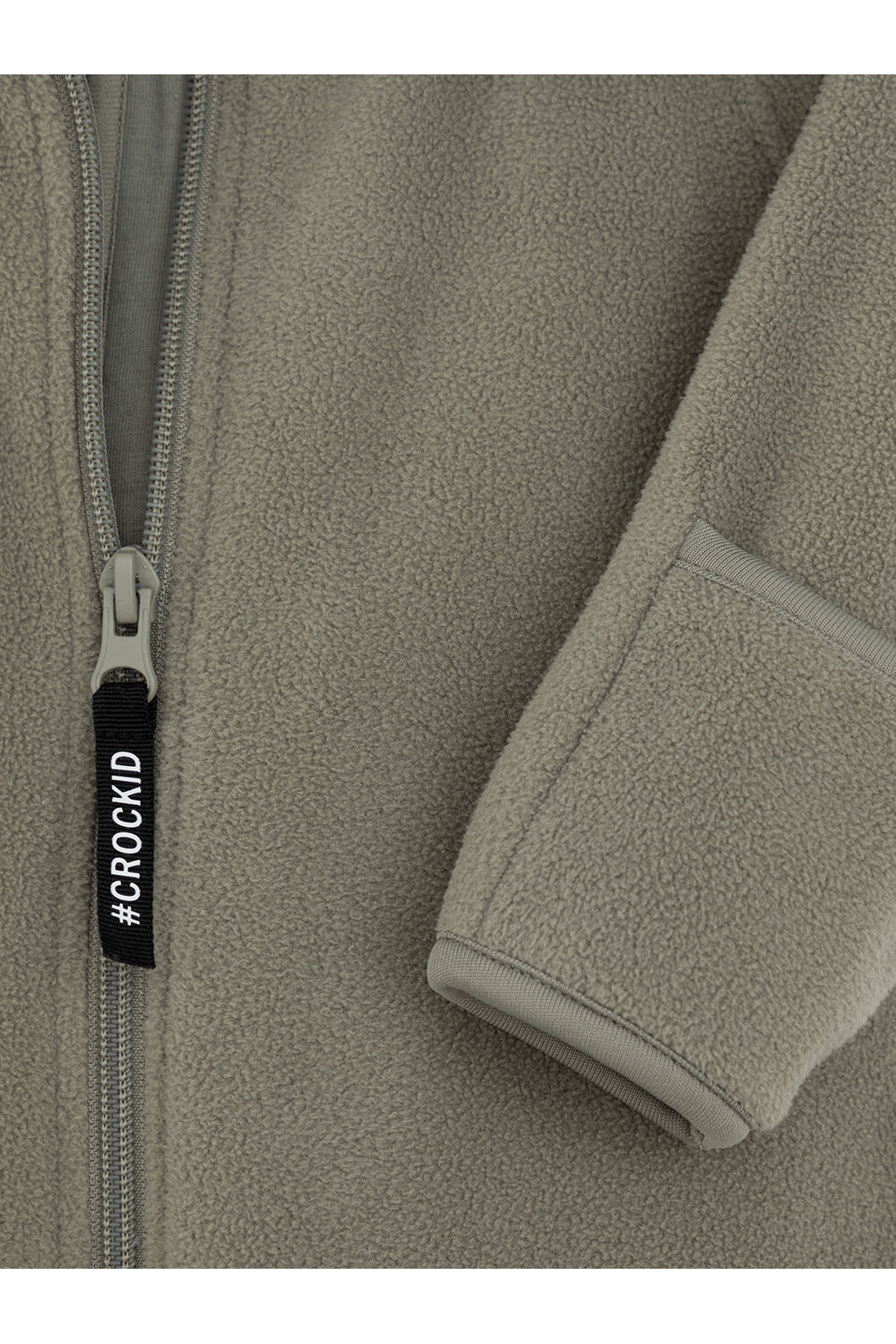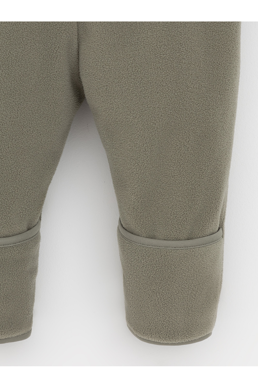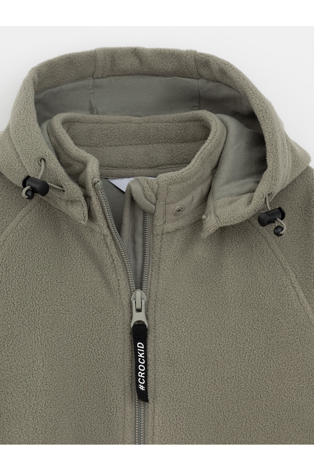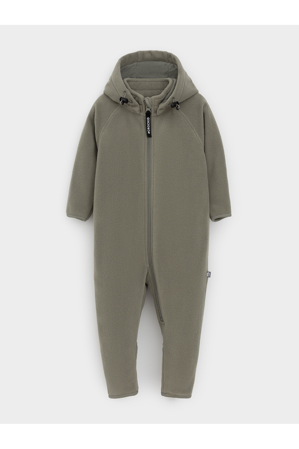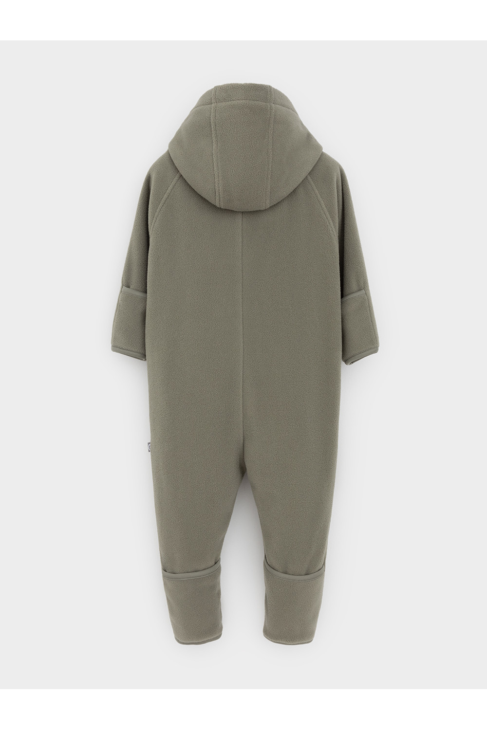 Флисовый комбинезон для мальчика со съёмным капюшоном. Капюшон регулируется по ширине с помощью эластичной утяжки со стопперами. Подклад выполнен из гладкого трикотажа супрем, произведённого из высококачественного натурального хлопка. Застёгивается на удлинённую молнию с мягкой защитой шеи и подбородка. В размерах 62, 68 и 74 на рукавах и ножках есть отвороты. Комбинезон сохраняет цвет и форму после многократных стирок.