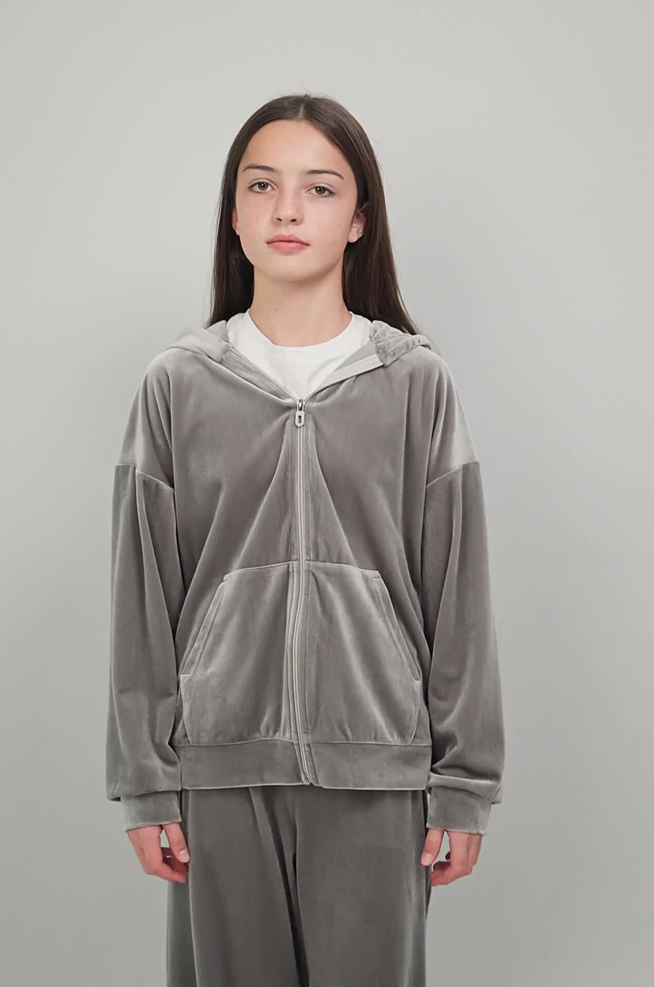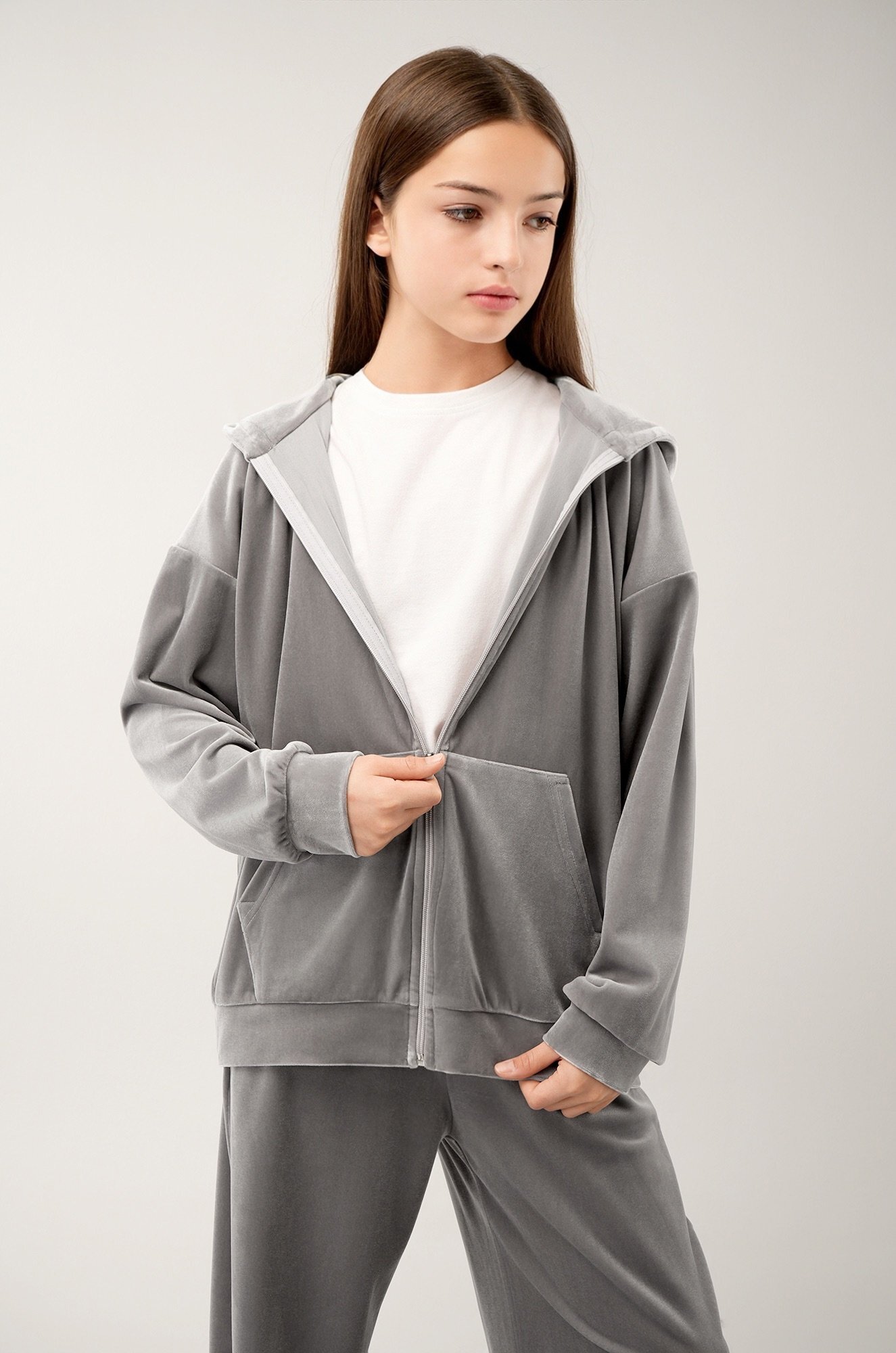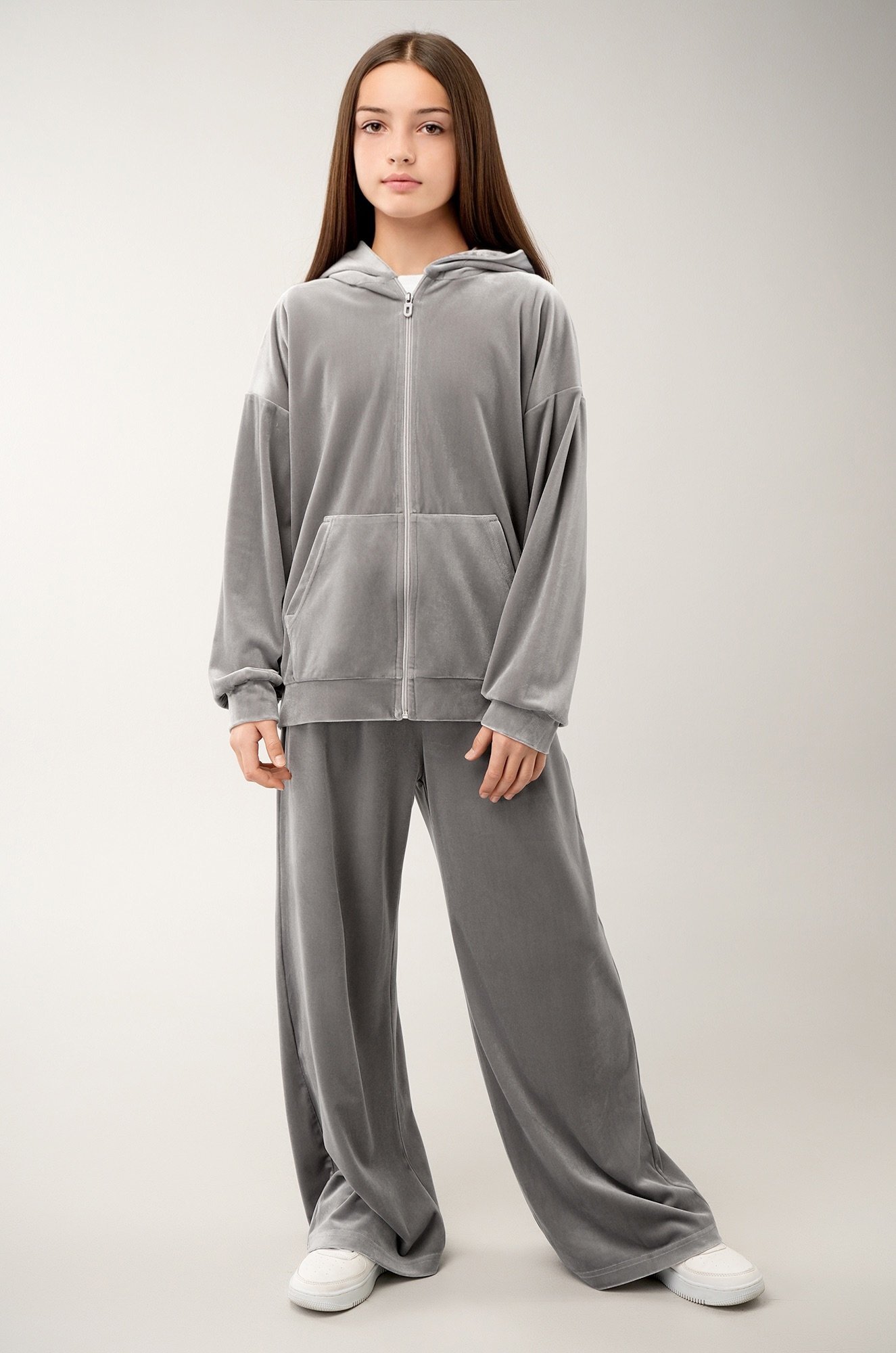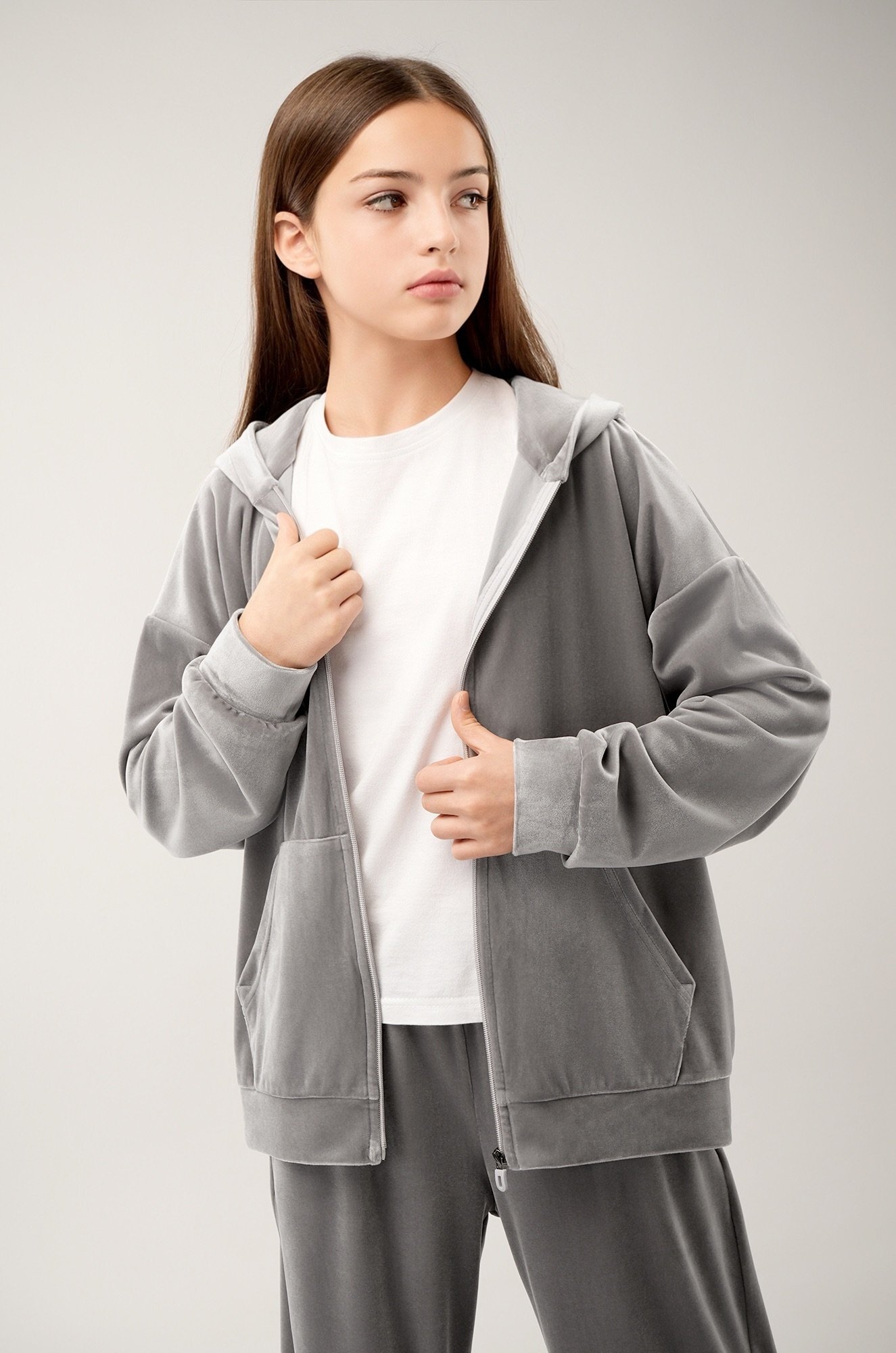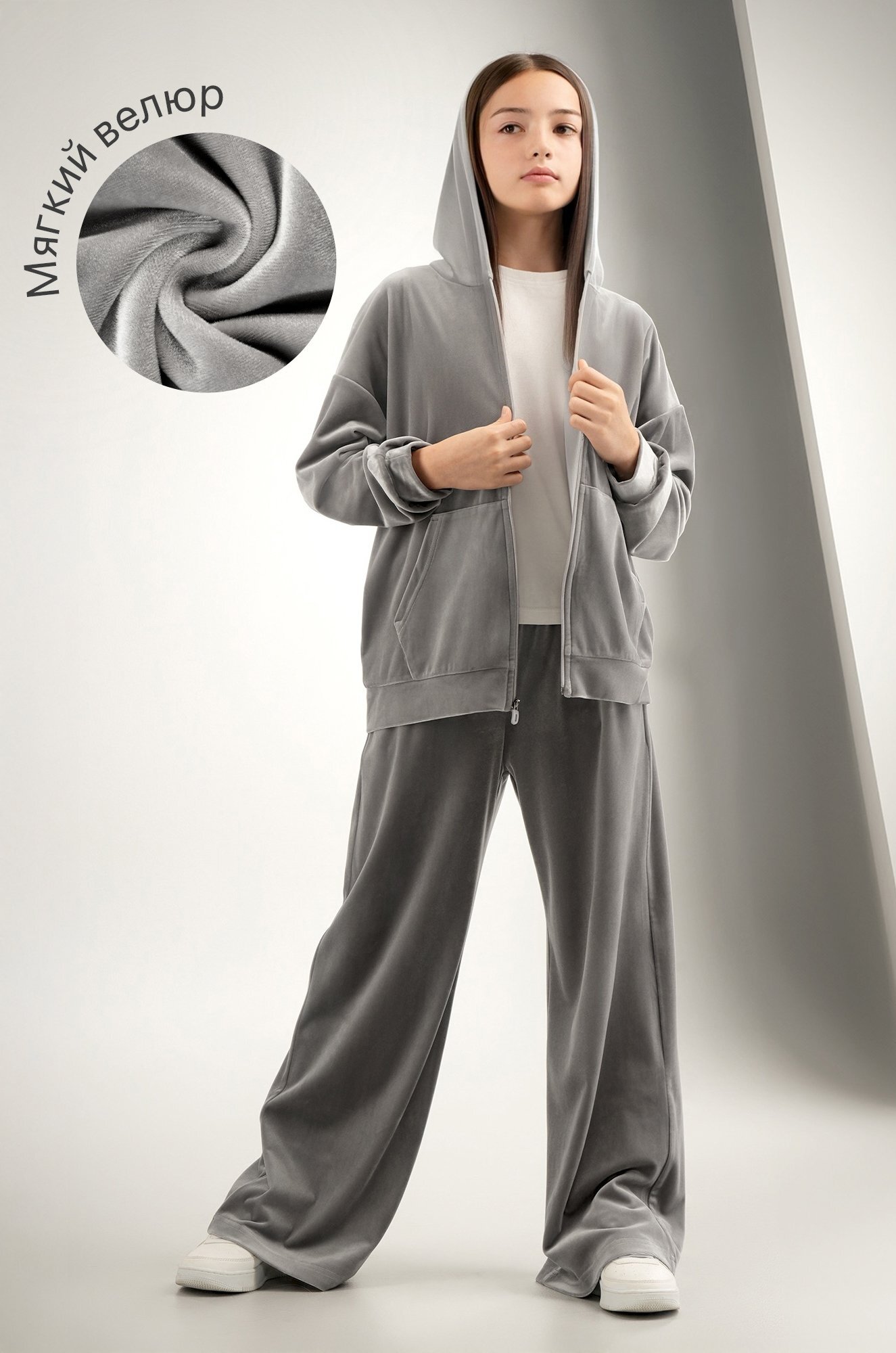Светло-серый костюм для девочки из мягкого трикотажного велюра дарит комфорт и уверенность в движении. Универсальный базовый комплект — отличный выбор для прогулок осенью и весной, отдыха и ярких моментов в спортивном стиле.