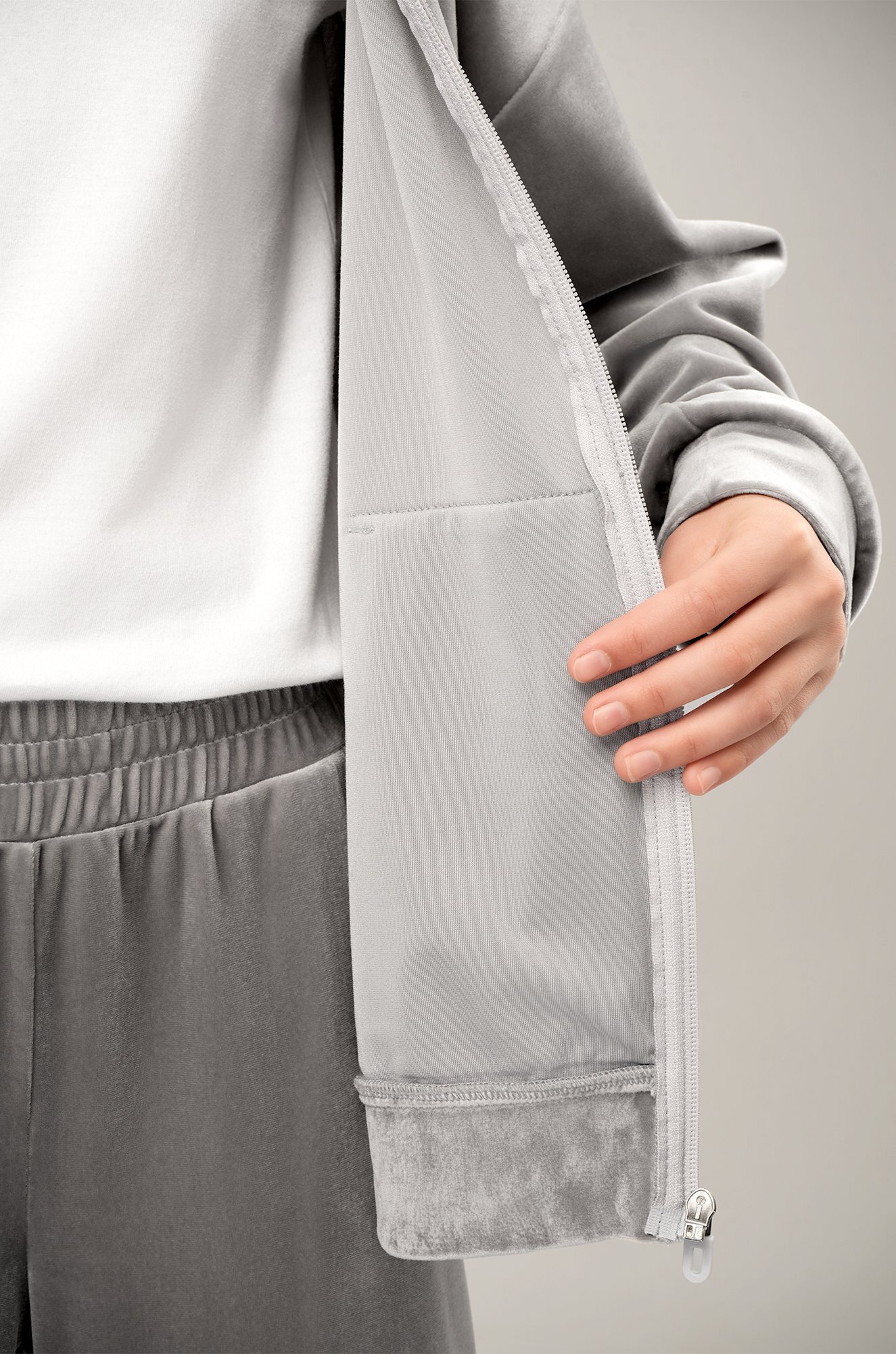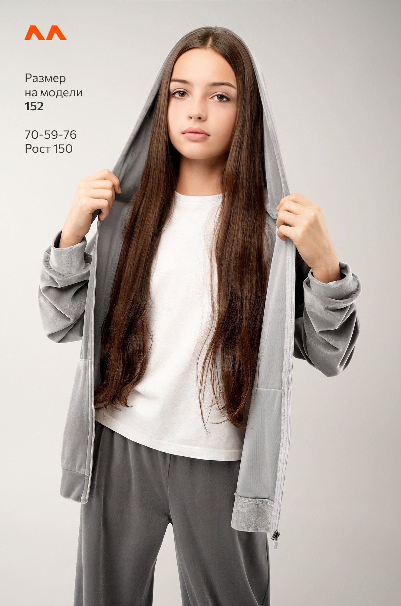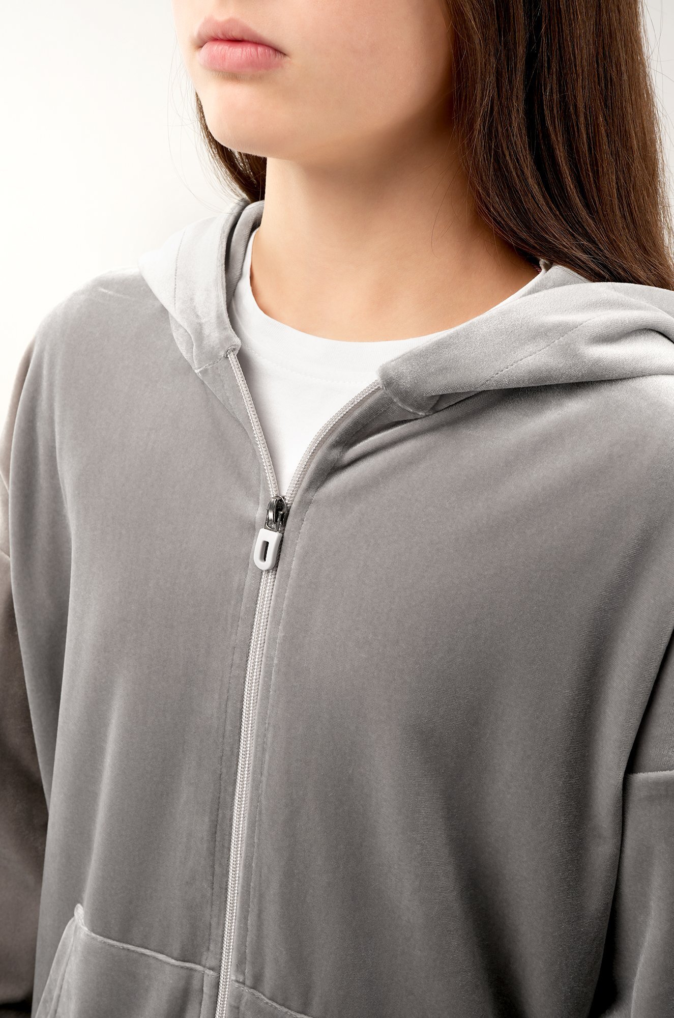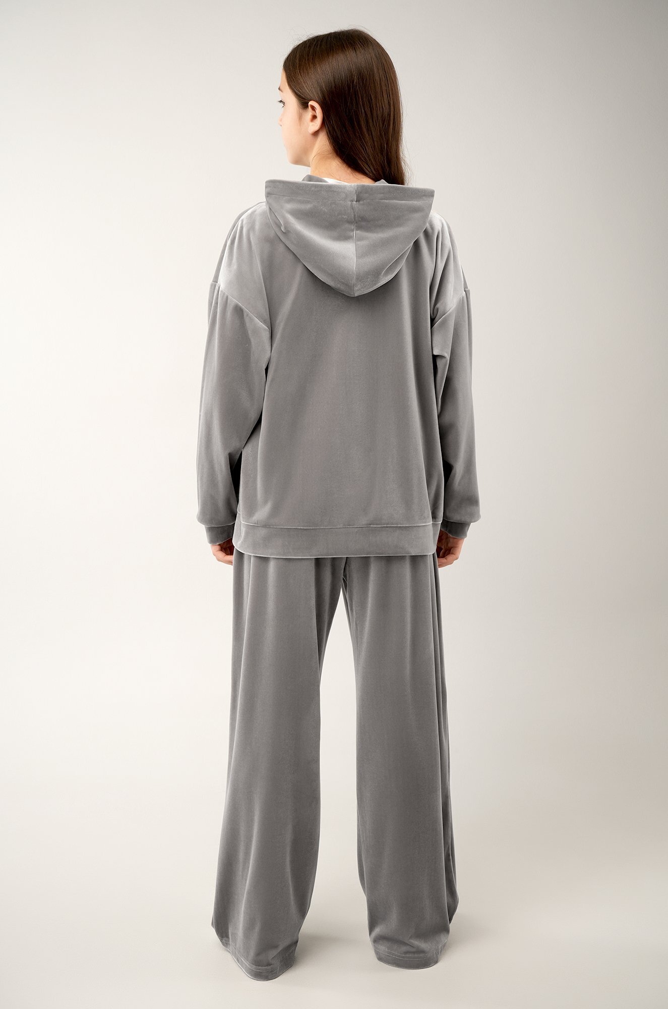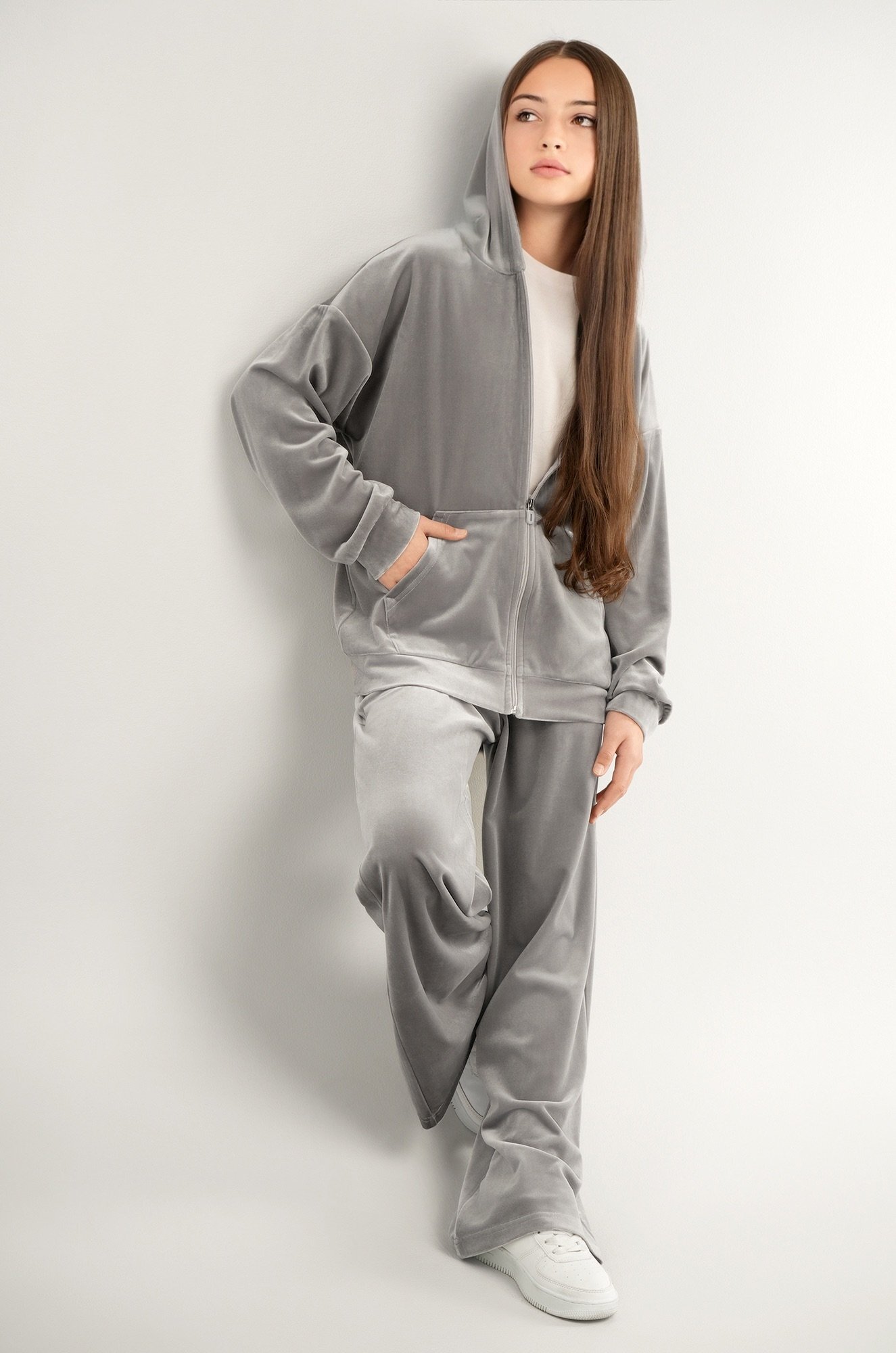 Светло-серый костюм для девочки из мягкого трикотажного велюра дарит комфорт и уверенность в движении. Универсальный базовый комплект — отличный выбор для прогулок осенью и весной, отдыха и ярких моментов в спортивном стиле.