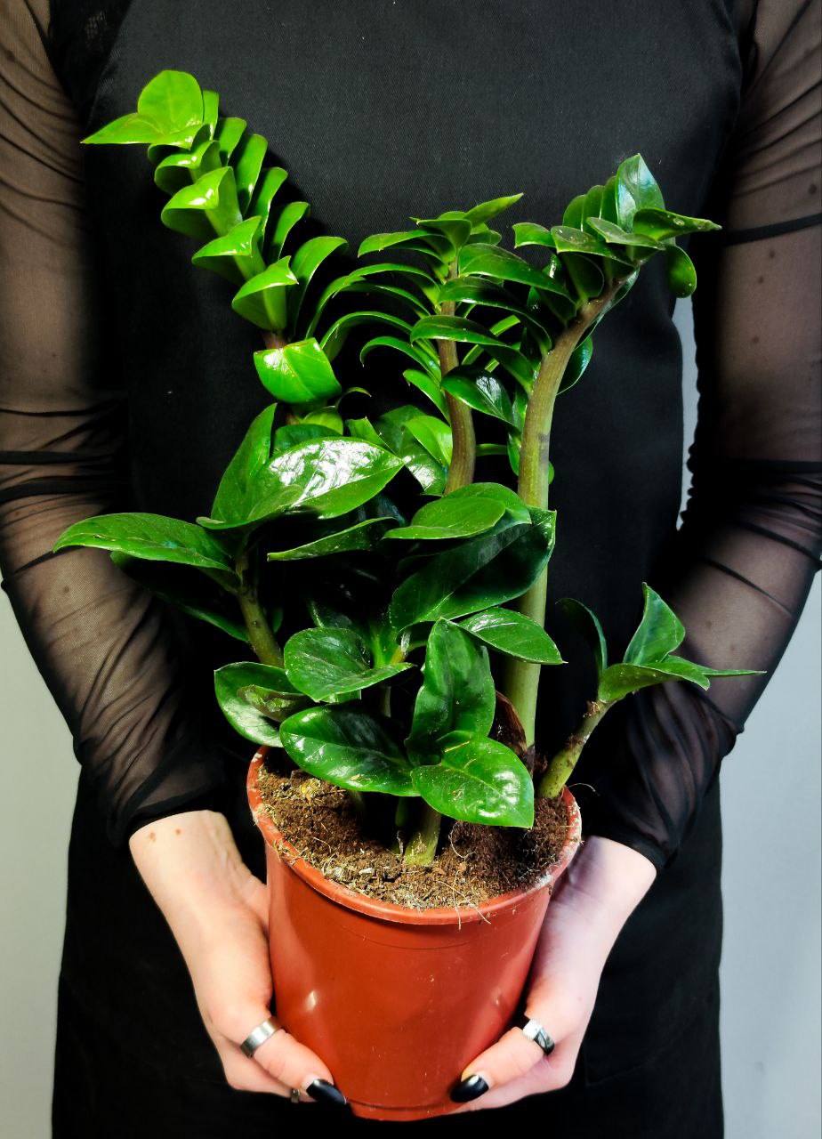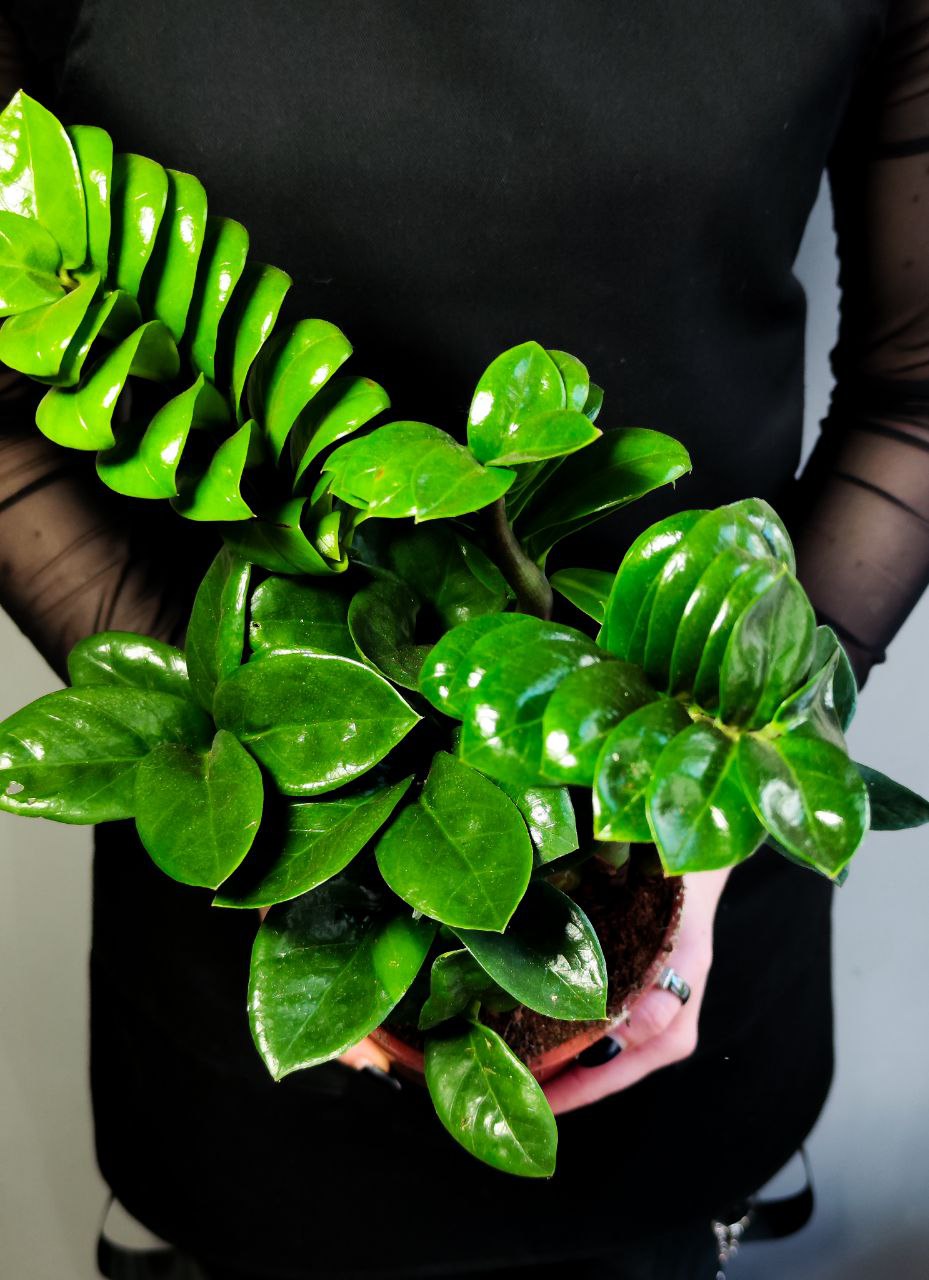Замиокулькас Зензи (Zamioculcas Zenzi) - компактная форма, он вырастает всего до 60см. Вечнозеленое растение имеет компактную форму и ярко выраженную расцветку. Черешки листа, сильно утолщенные у основания. Листочки овальные, темно-зеленой окраски, близко посажены друг к другу. Часто в народе замиокулькас называют «долларовое дерево», «цветок безбрачия» или «долларовая пальма». По народному поверью, если зацветет замиокулькас, то хозяйка скоро выйдет замуж. Сок замиокулькаса, как и многих других представителей декоративно - лиственных может раздражать кожу и т.п., поэтому его выращивают для красоты и в пищу не употребляют. В уходе замиокулькас неприхотлив. Он легче переносит засуху, чем перелив. В летнее время поливать растение следует по мере высыхания земляного кома. Комфортные температурные условия для замиокулькаса – от +23°C до +30 °C летом и не ниже +12 °C зимой. Растение хорошо чувствует себя и на ярком солнце, и в глубине помещения в притененном положении. Уменьшение светового потока скажется только на величине листьев. Более подробная инструкция по уходу прилагается. Растение в маленьком транспортировочном горшке диаметром 14см, советуем пересадить в горшок объемом примерно 2,5л. Грунт подойдет для ароидных растений. ВНИМАНИЕ! Растение может немного отличаться от фото, так как они имеют свойство расти, меняться в зависимости от условий ухода, времени года.
