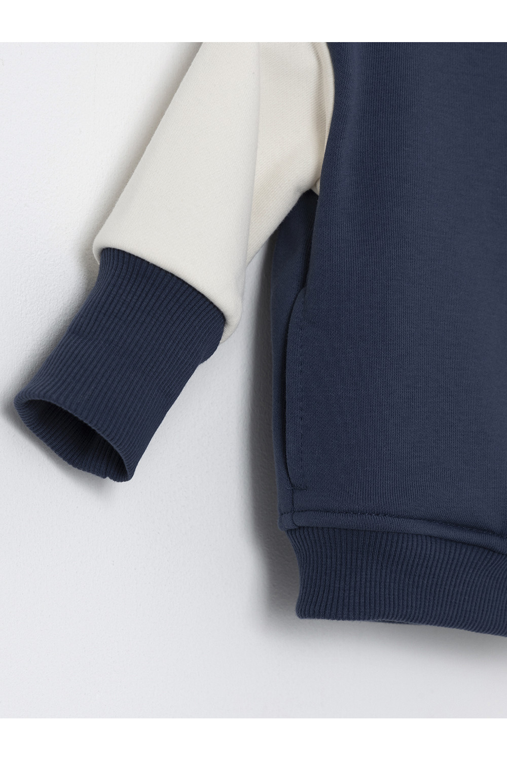 Трикотажная куртка-бомбер для мальчика с контрастными рукавами. Изготовлена из мягкого петельчатого трикотажа. В составе 80% натурального хлопка и 20% полиэстера, при этом полиэстер ввязан внутрь по особой технологии и не соприкасается с кожей. Застёгивается на молнию с мягкой защитой шеи и подбородка. По бокам два кармана. Воротничок, манжеты и пояс вязаные. Изделие сохраняет цвет и форму после многократных стирок. Все трикотажные полотна производятся в соответствии с нормами швейцарского сертификата ЭкоТекс.