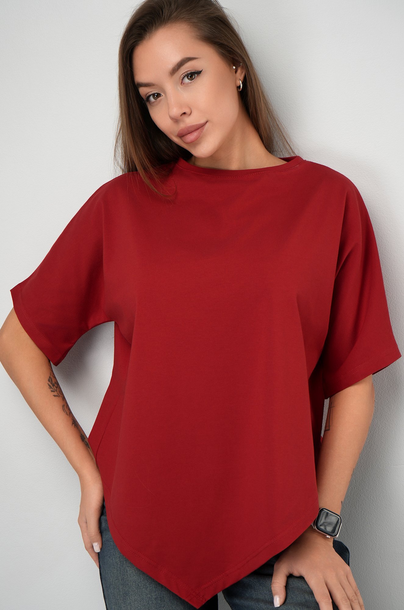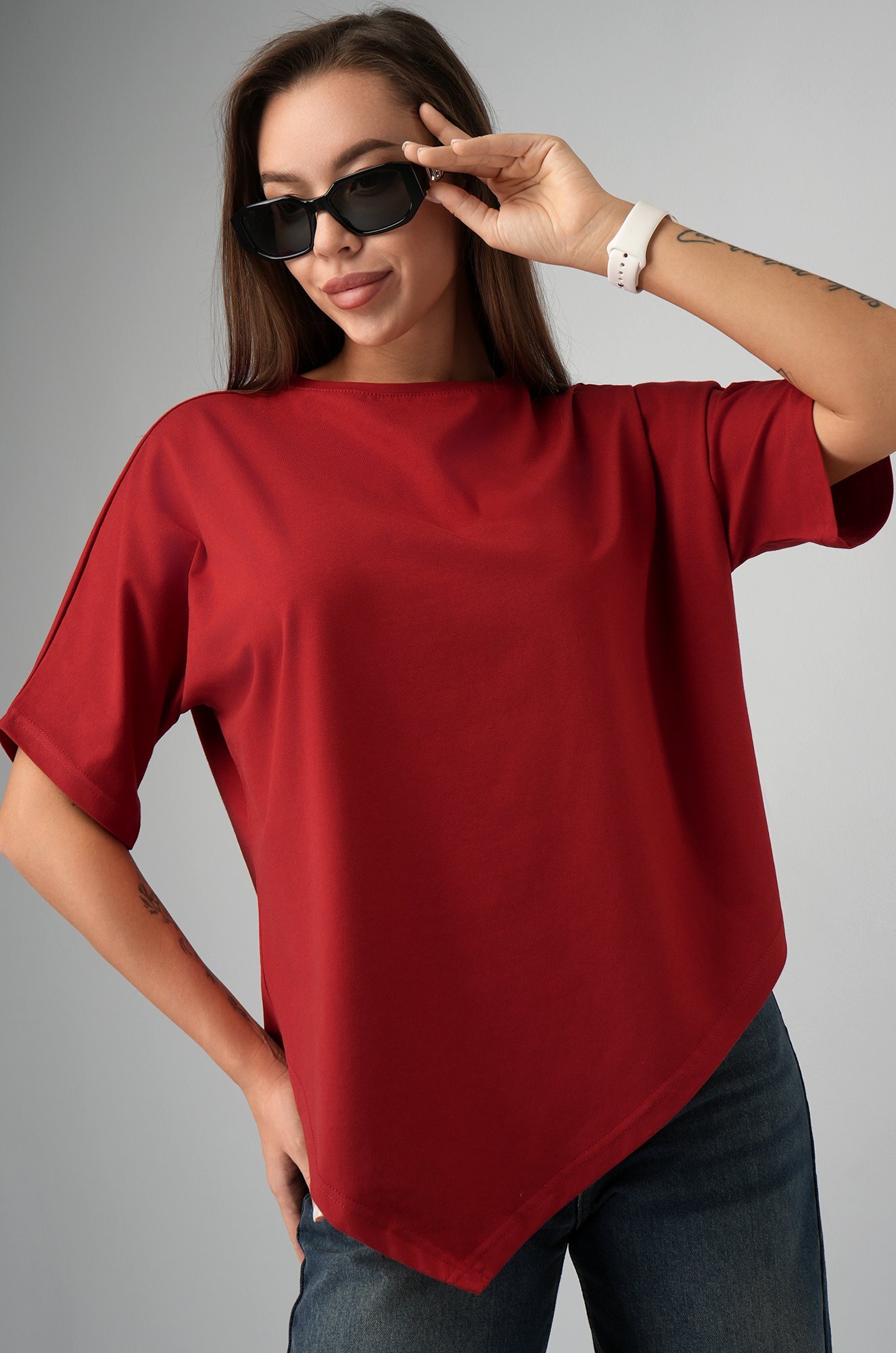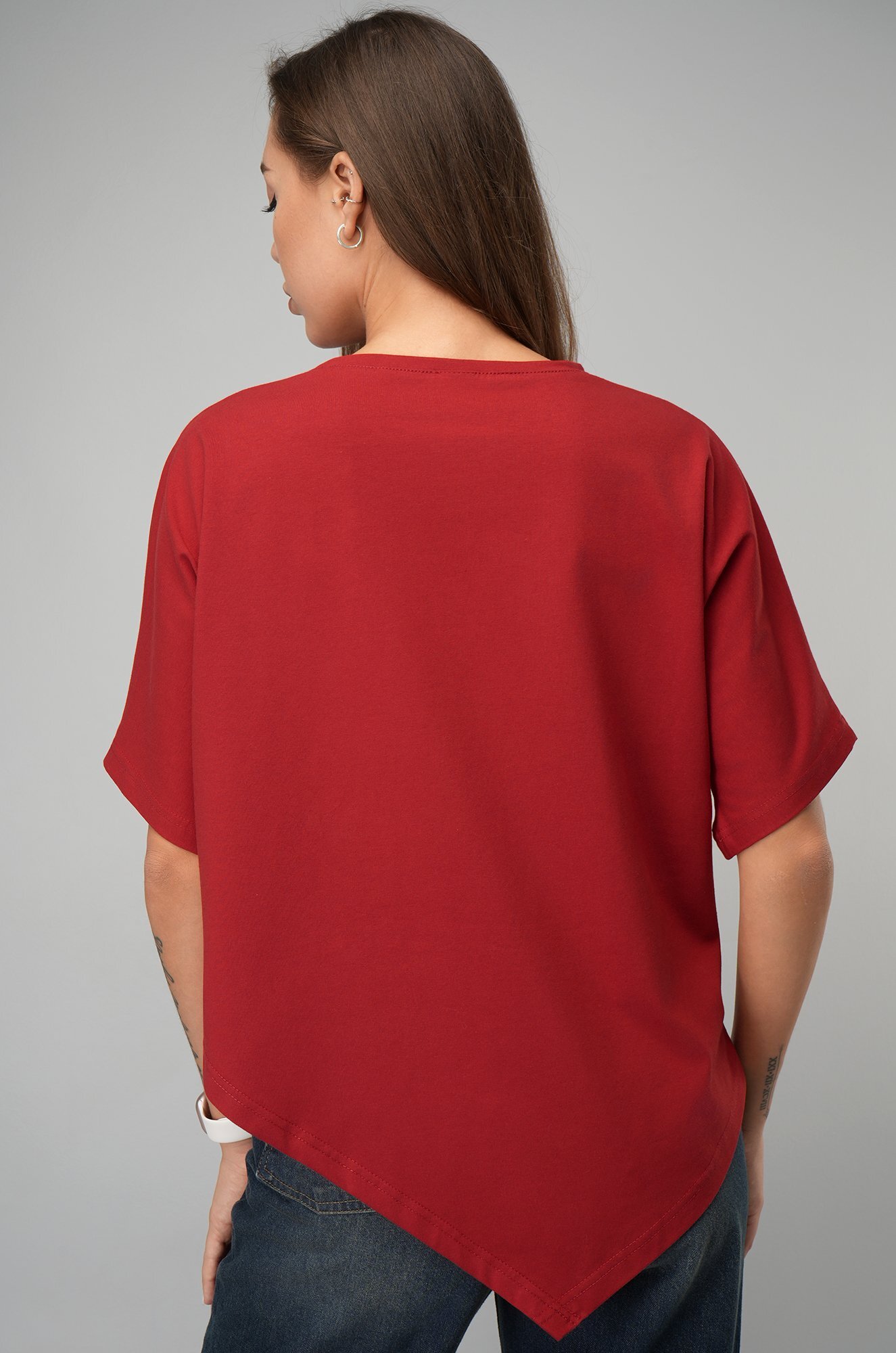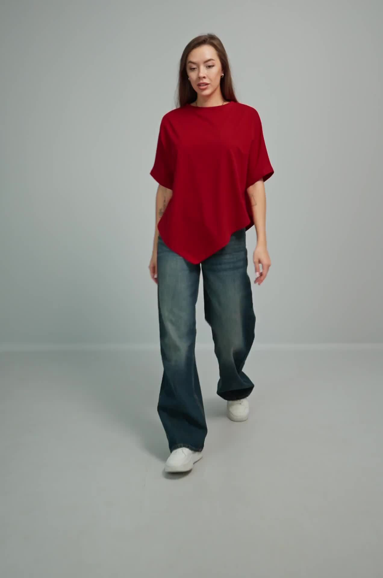 Удлинённый цельнокроеный рукав дарит комфорт, а асимметричный низ добавляет образу динамики. Красная футболка станет основой стильных летних образов.