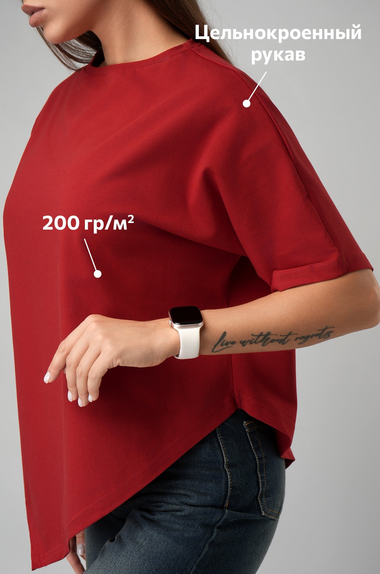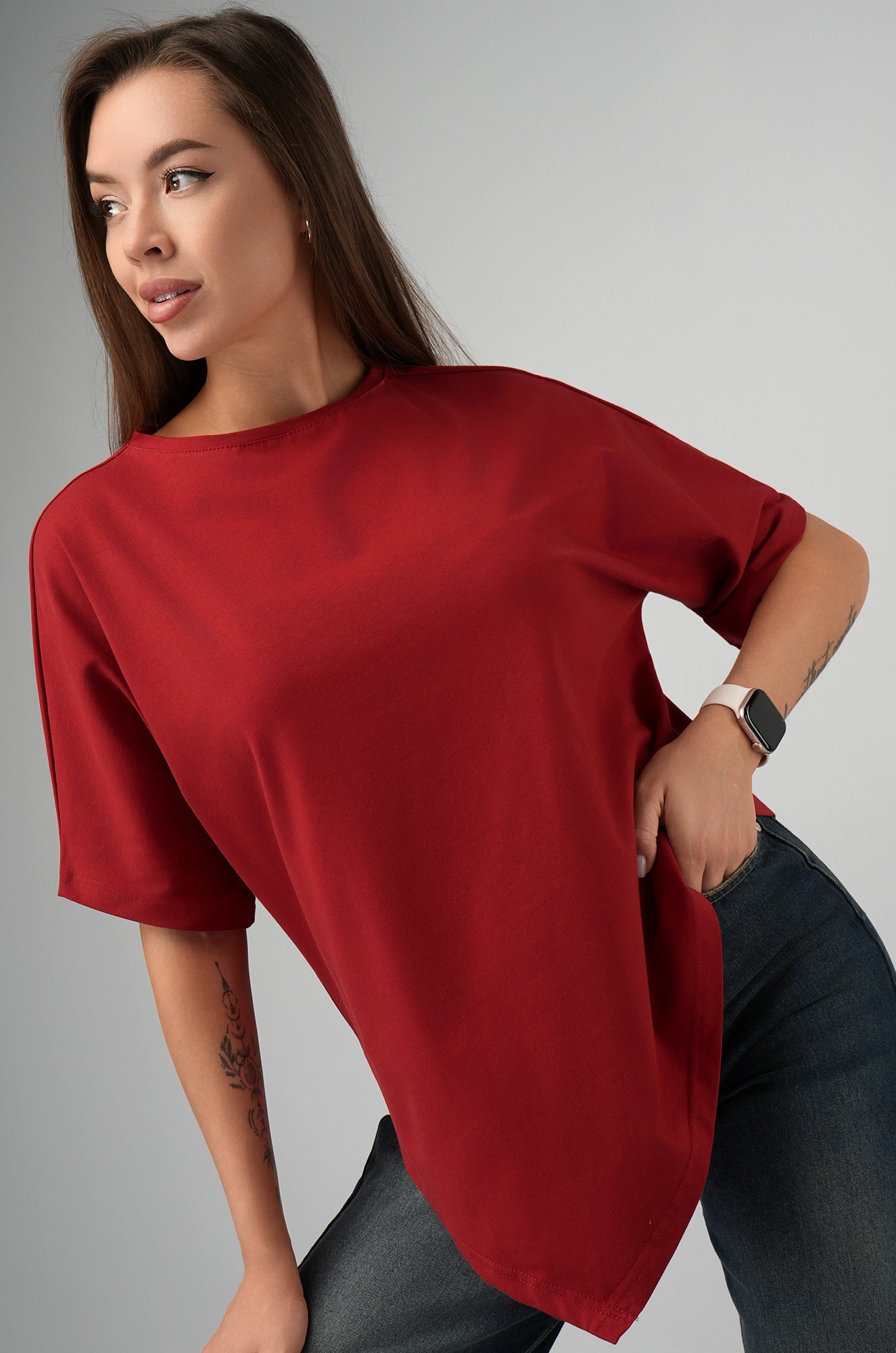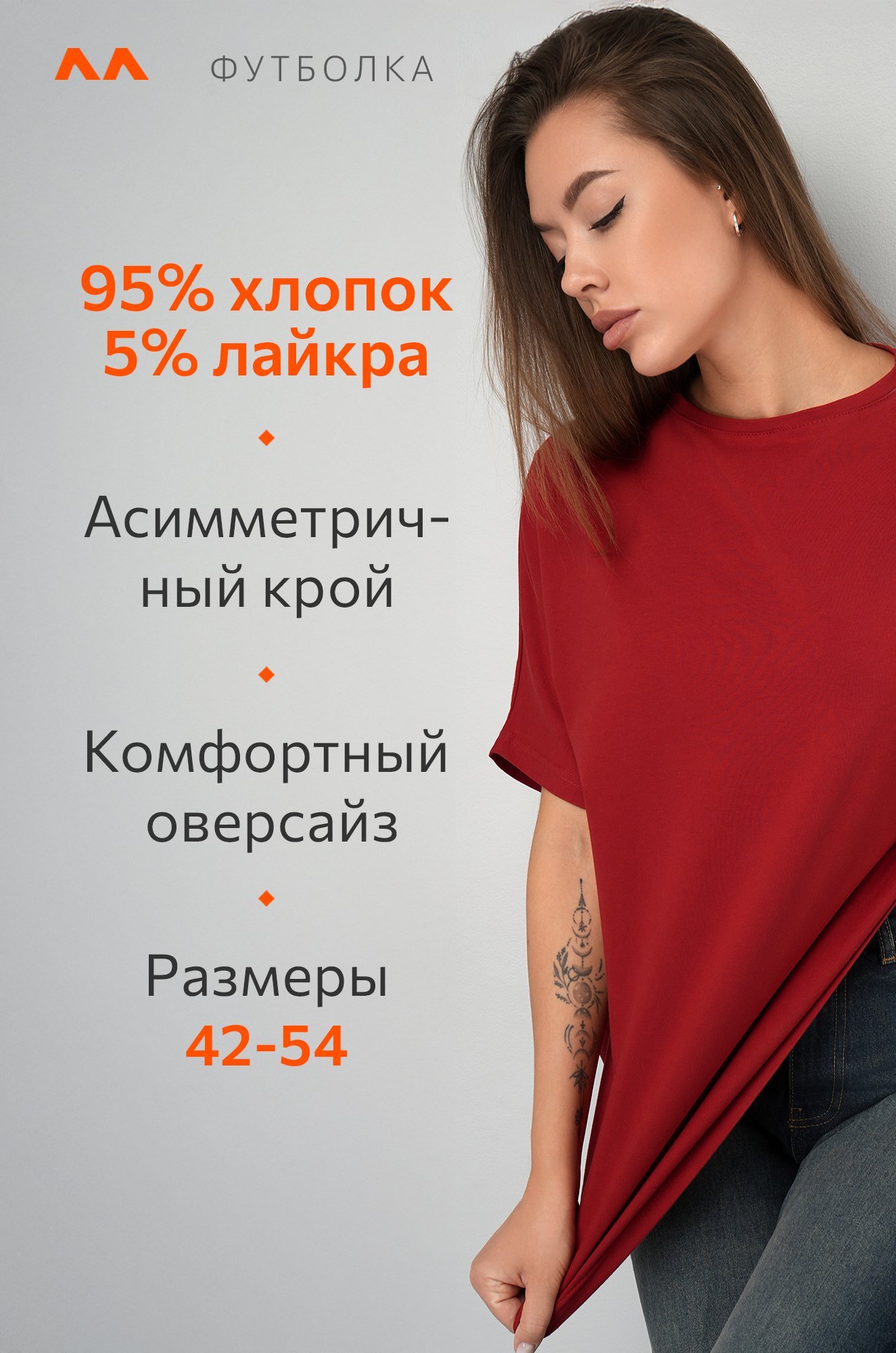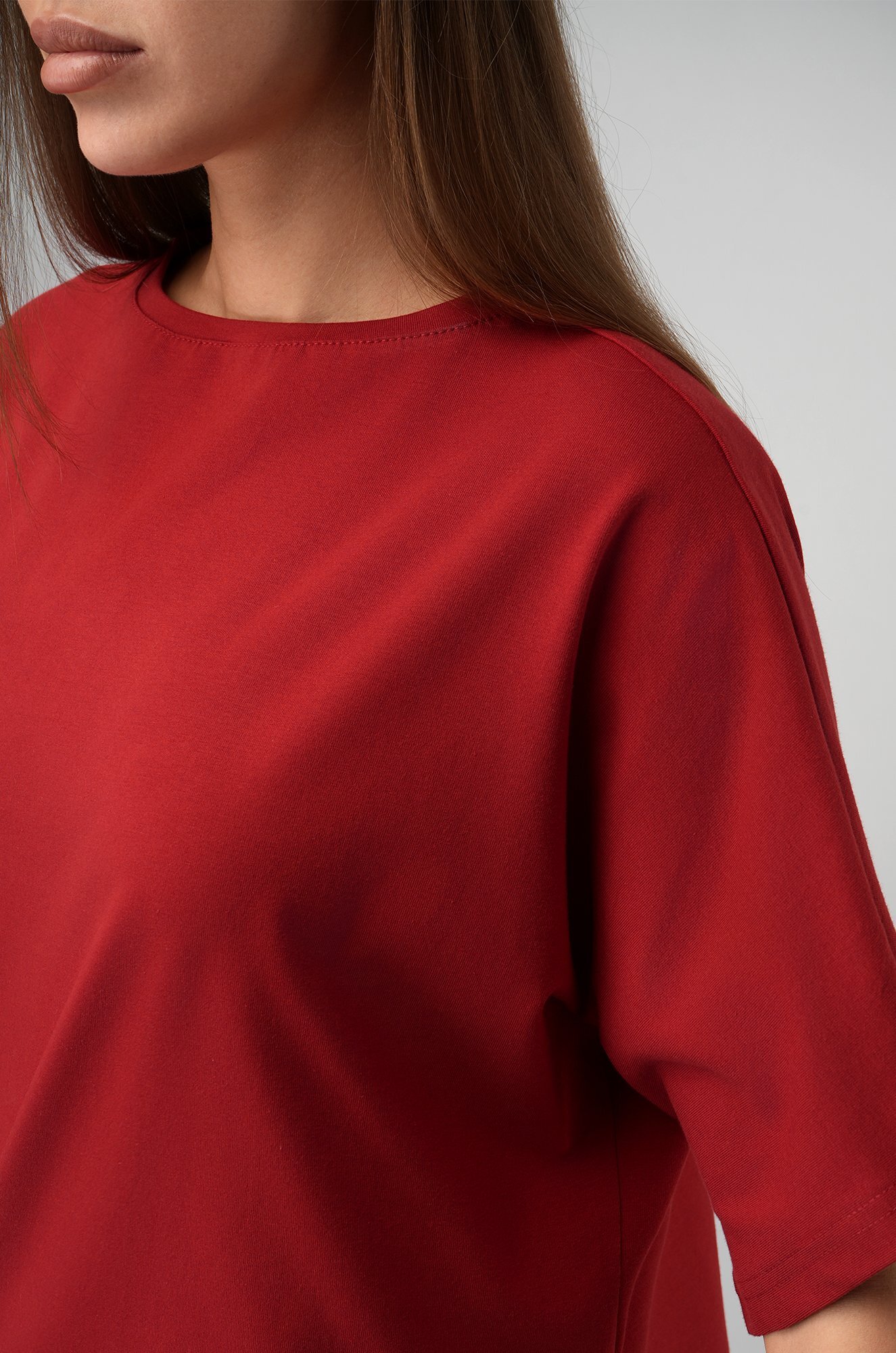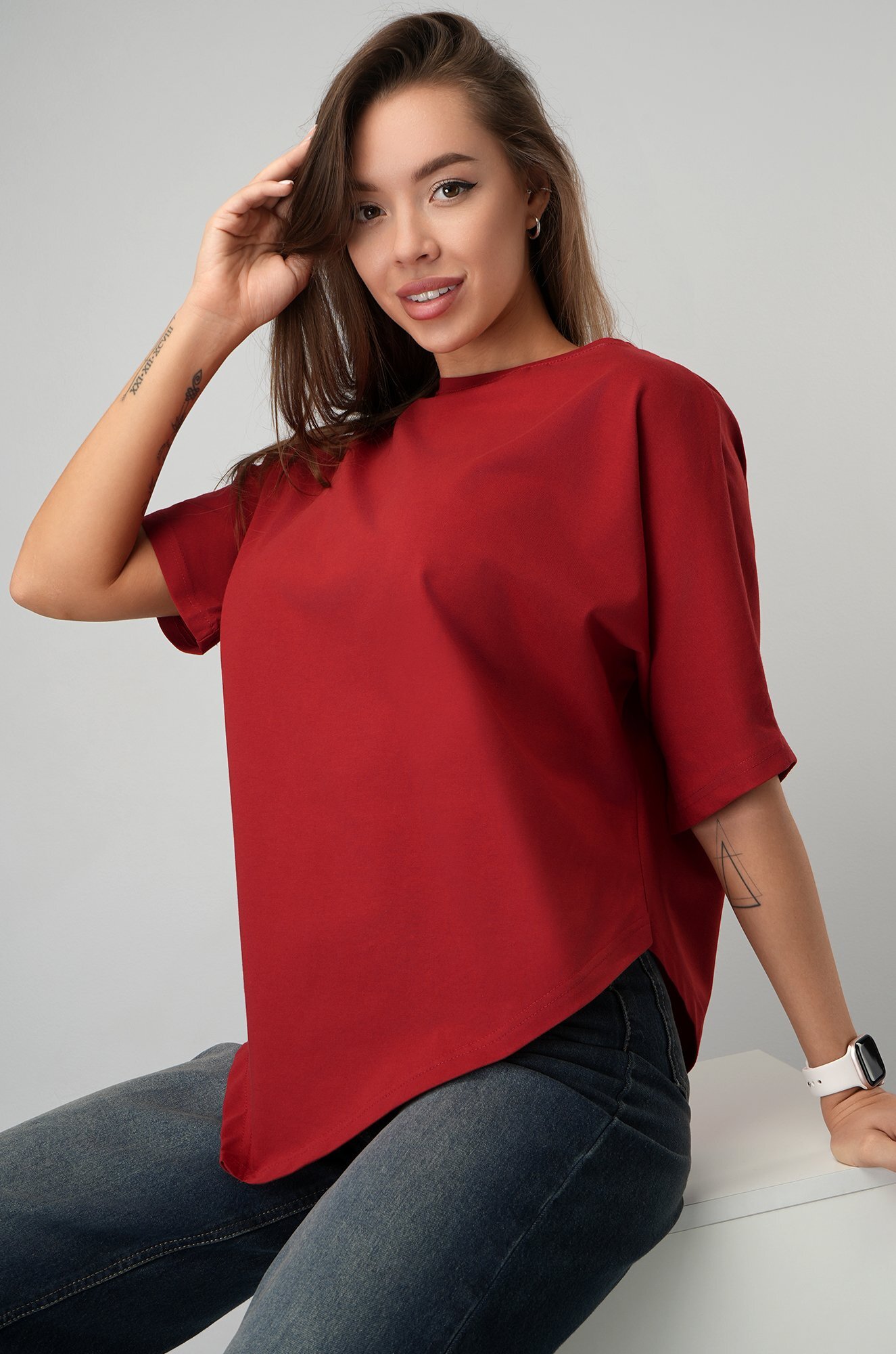 Удлинённый цельнокроеный рукав дарит комфорт, а асимметричный низ добавляет образу динамики. Красная футболка станет основой стильных летних образов.