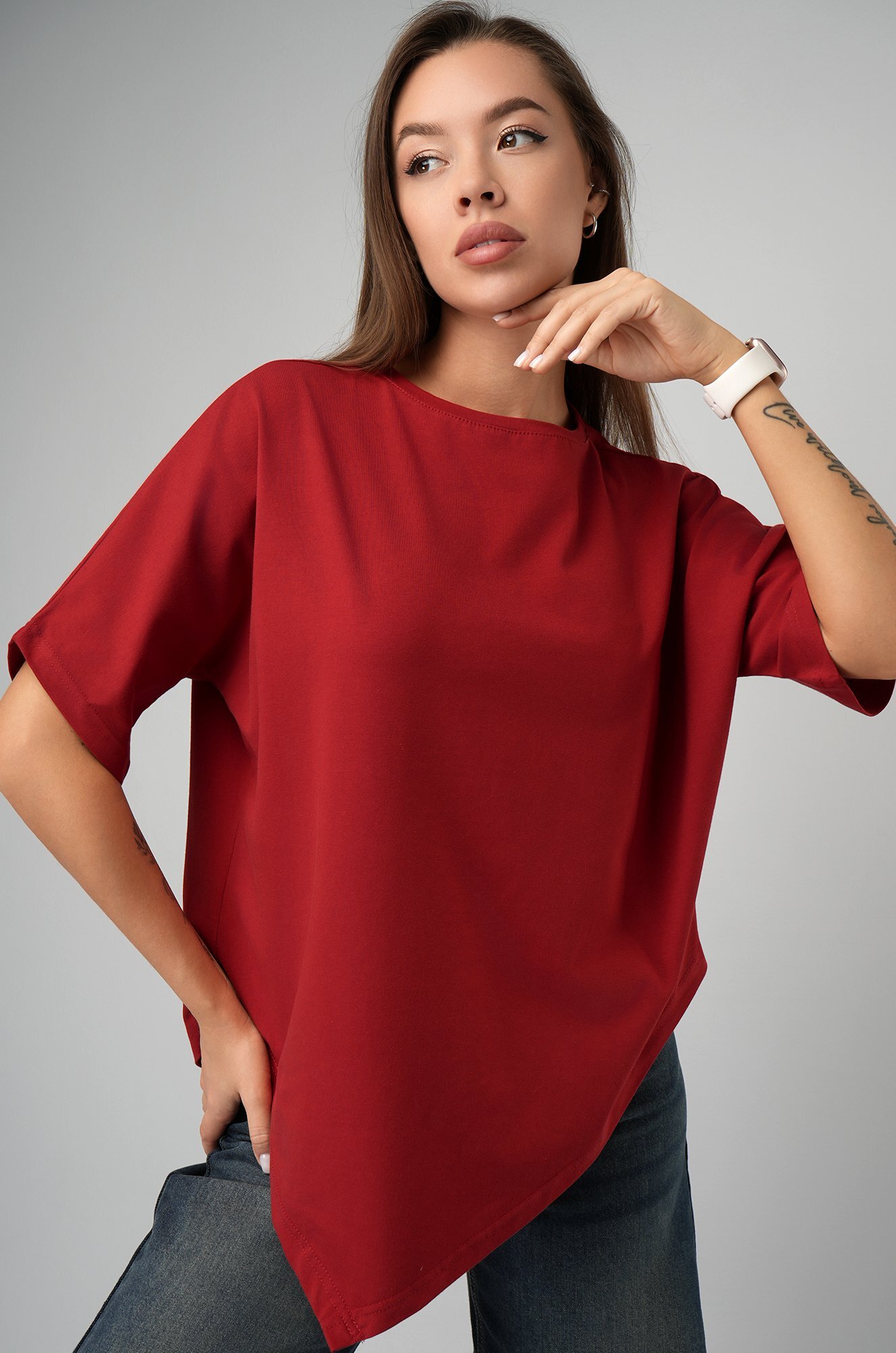 Женская футболка с асимметричным низом создана для тех, кто выбирает базу с характером. Трикотажная футболка оверсайз станет любимым вариантом на каждый день.