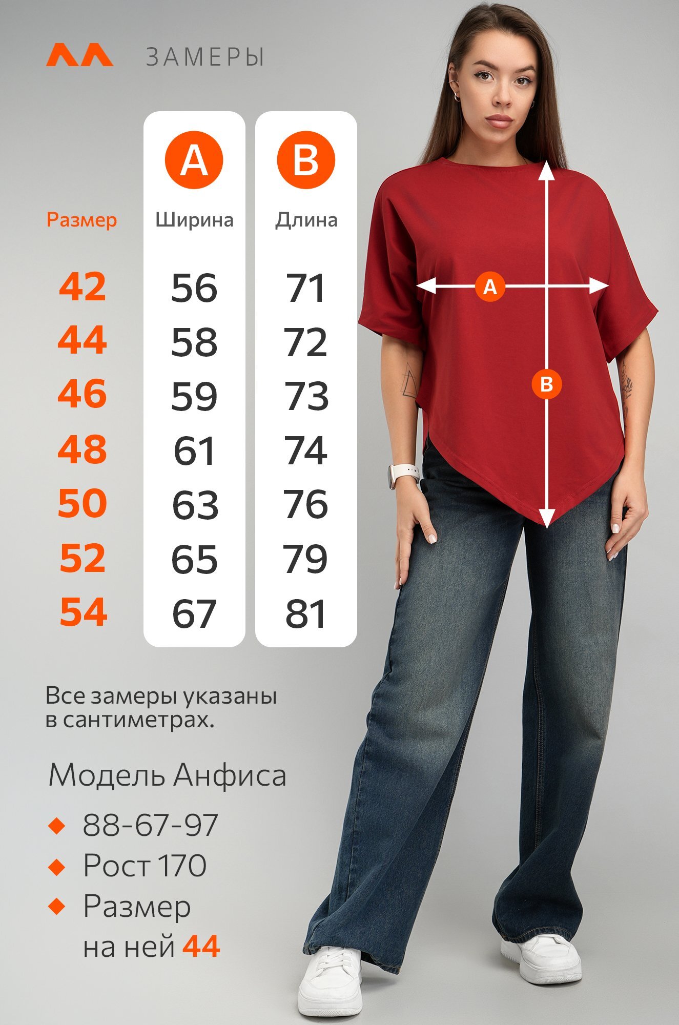 Модель Анфиса, его рост 170 см, параметры 88-67-97 см. На ней размер 44.