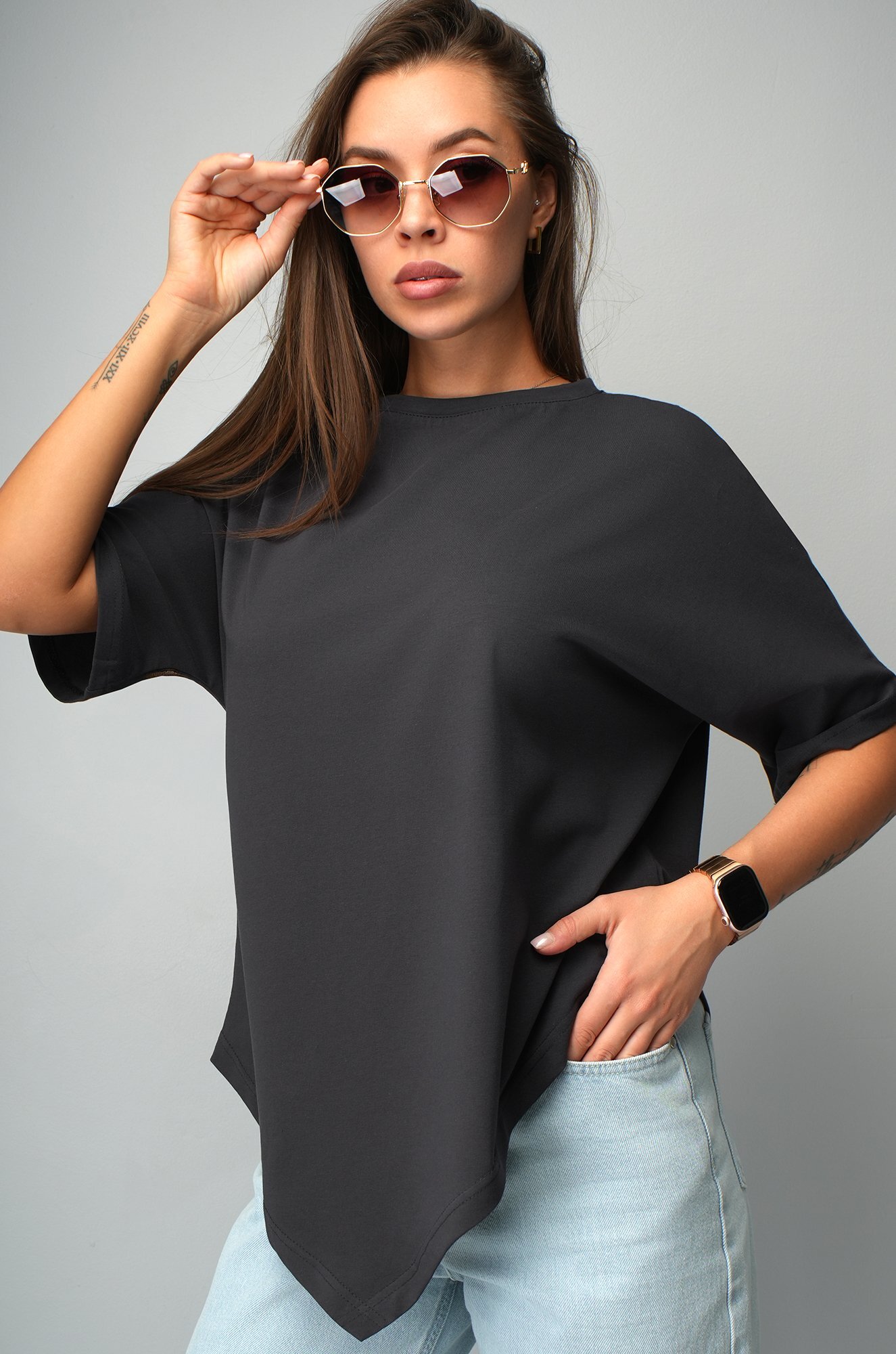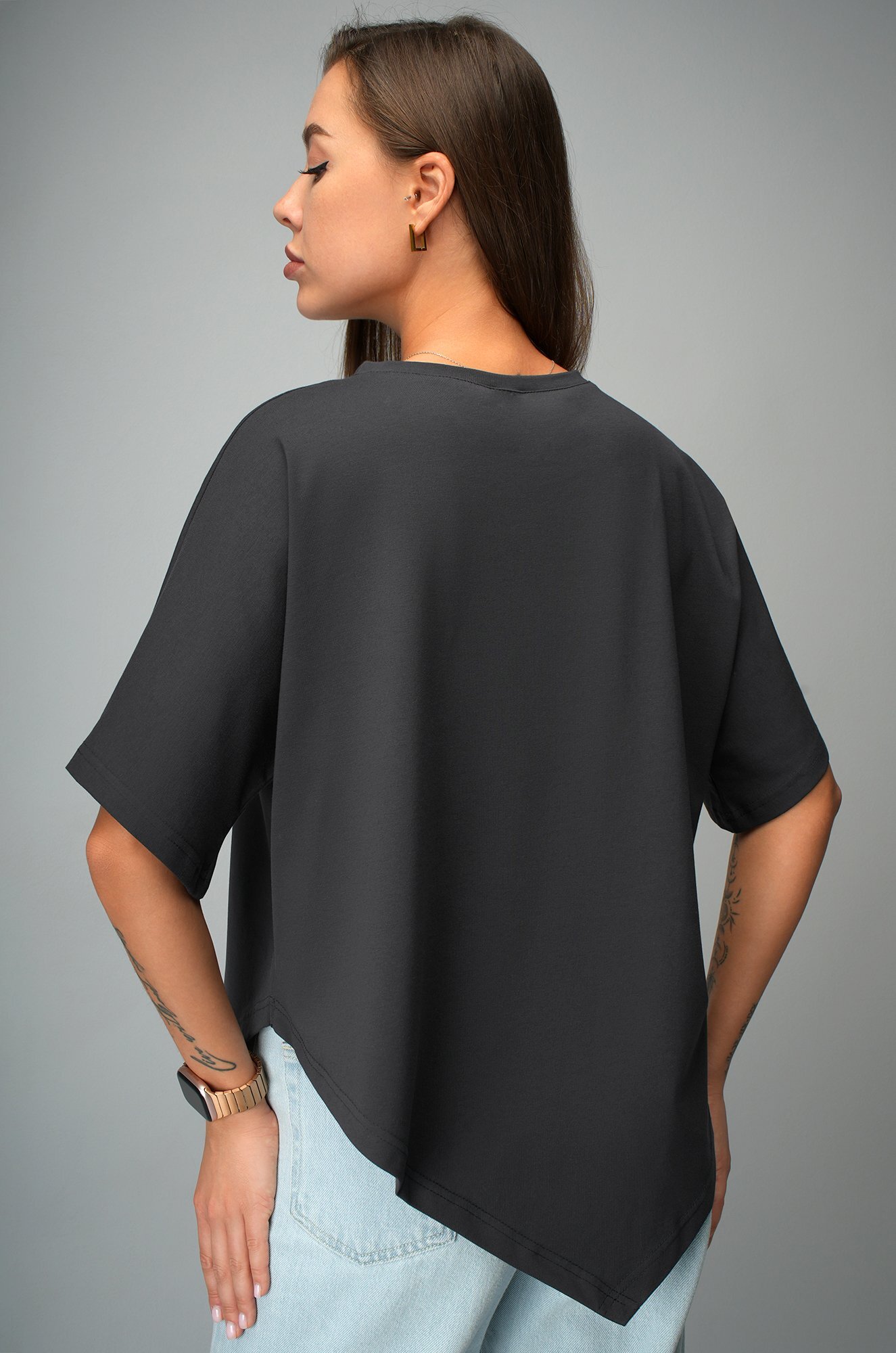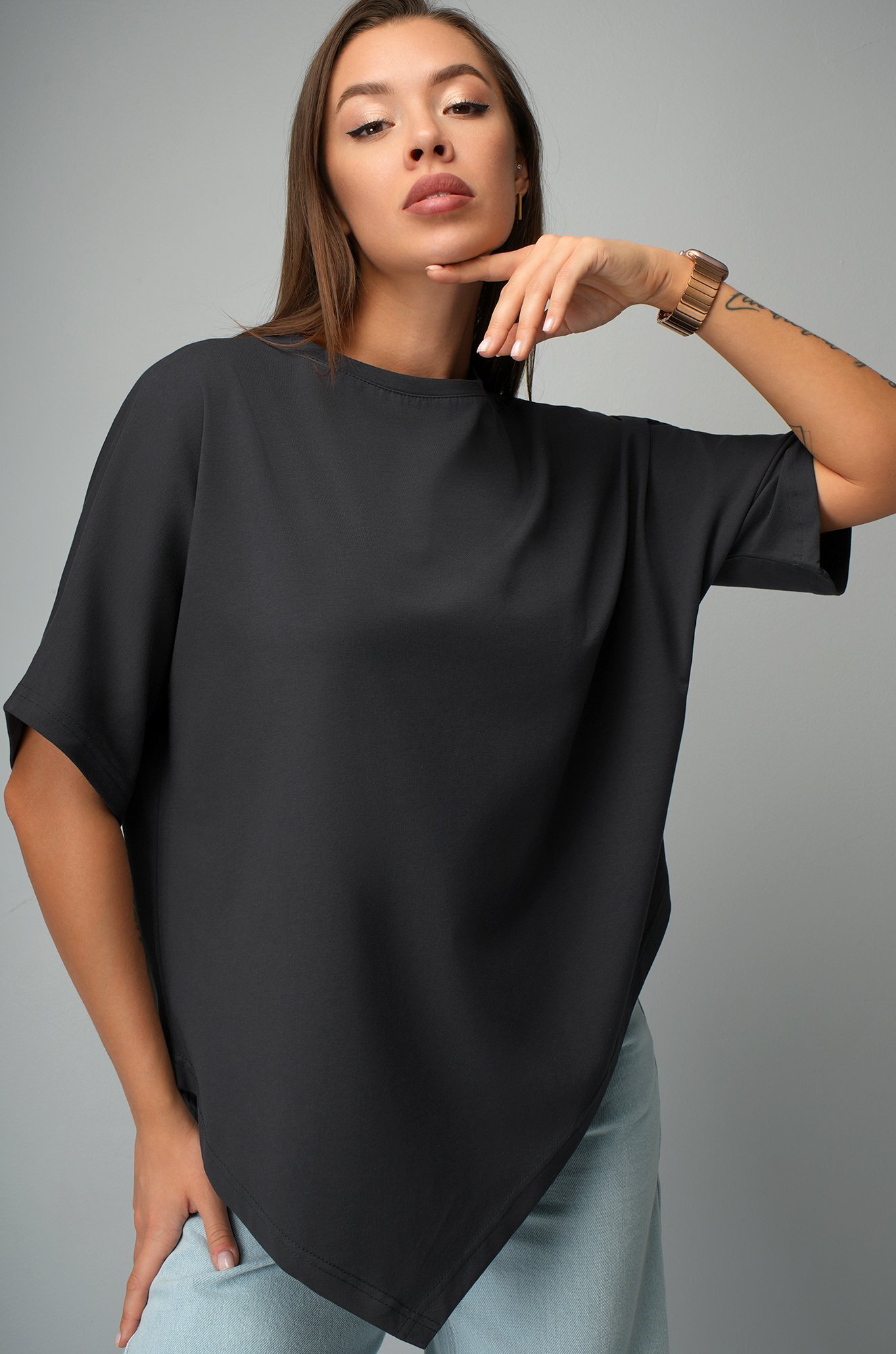Удлинённый цельнокроеный рукав дарит комфорт, а асимметричный низ добавляет образу динамики. Темно-серая футболка станет основой стильных летних образов.