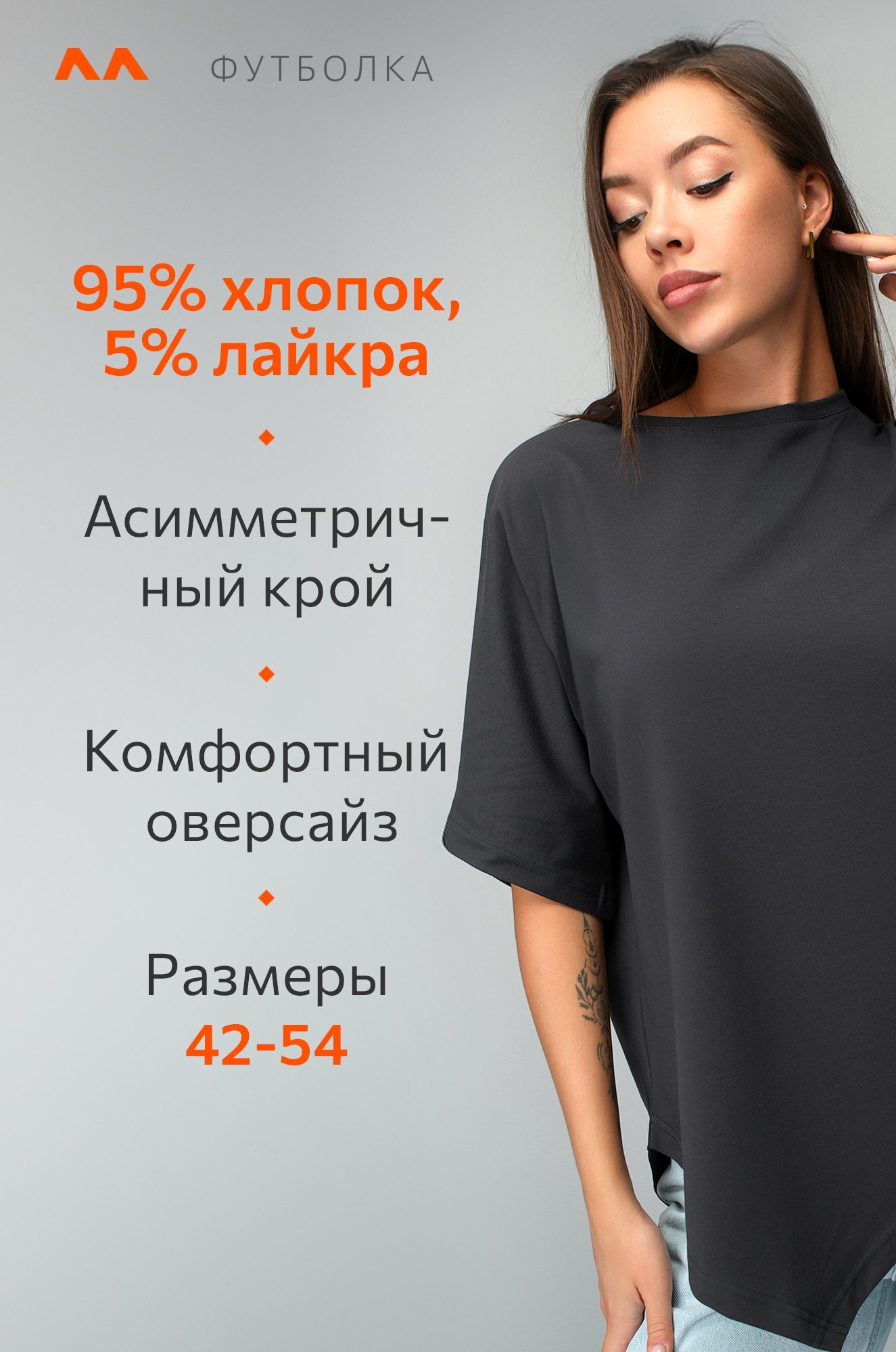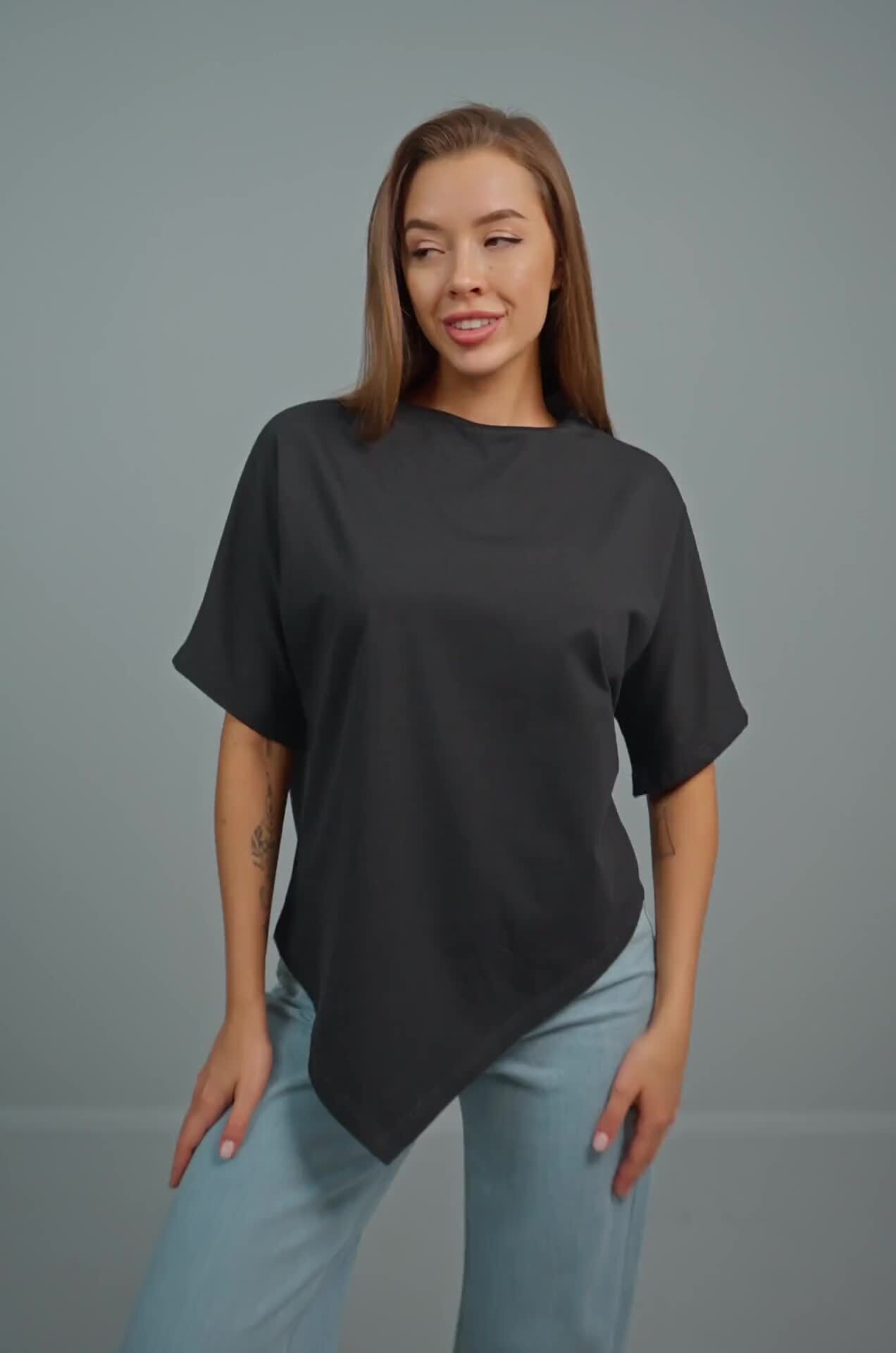 Женская футболка с асимметричным низом создана для тех, кто выбирает базу с характером. Трикотажная футболка оверсайз станет любимым вариантом на каждый день.