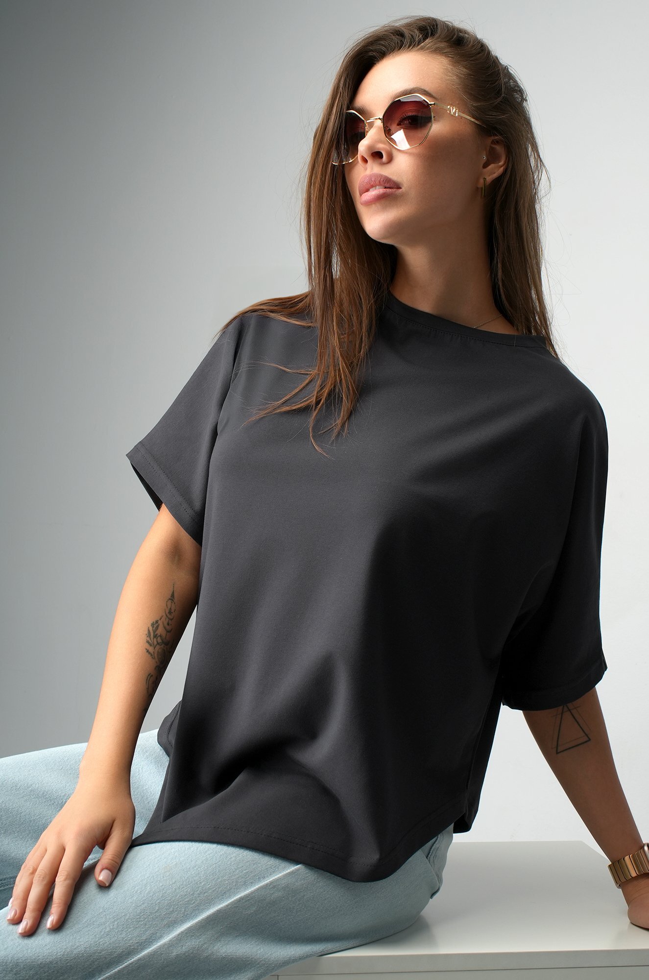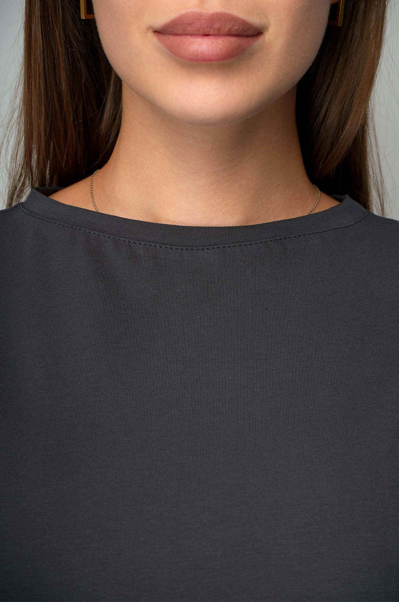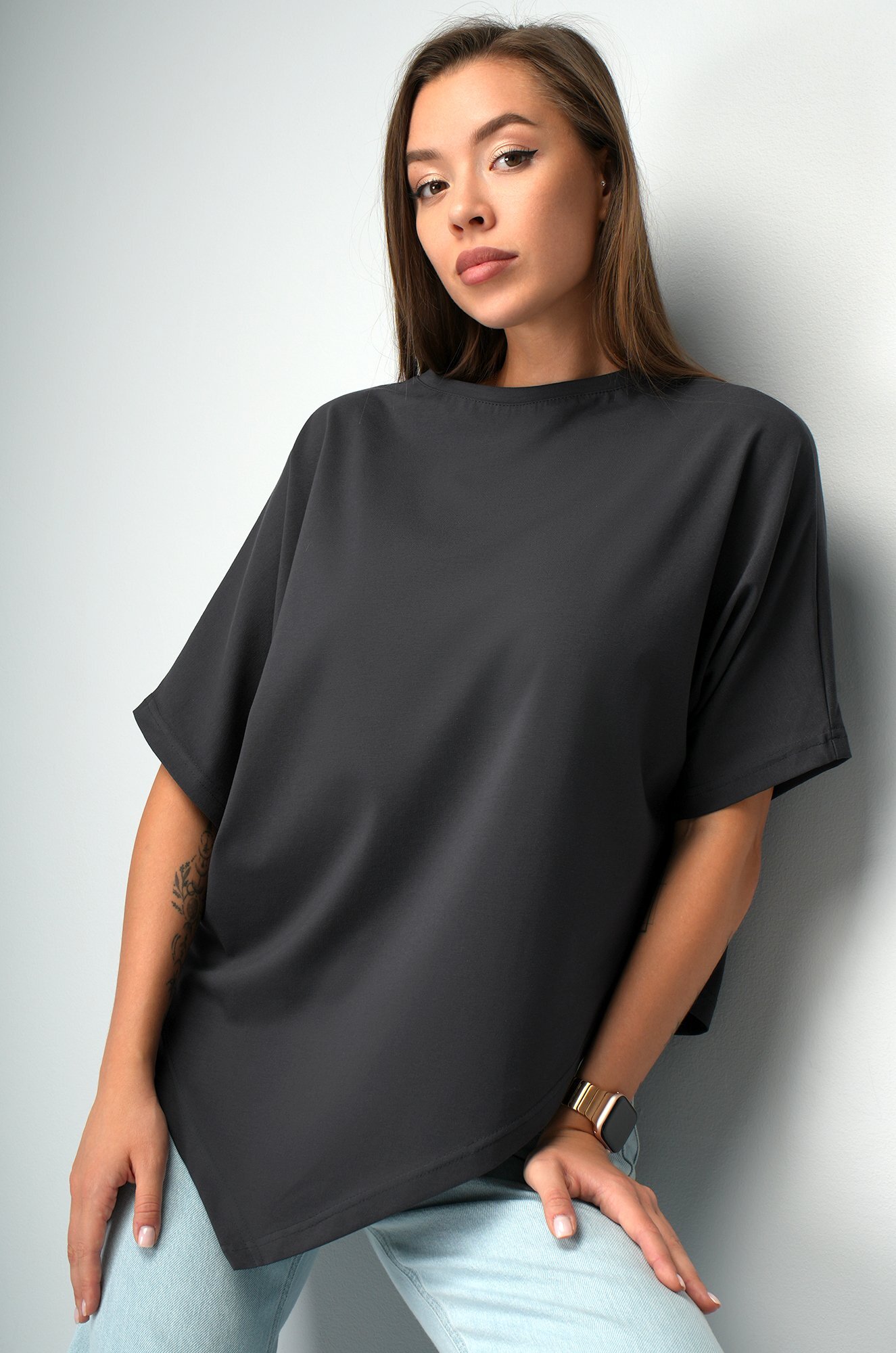Базовая футболка графитового цвета подойдёт женщинам, которым нравится быть в центре внимания даже в повседневных образах.