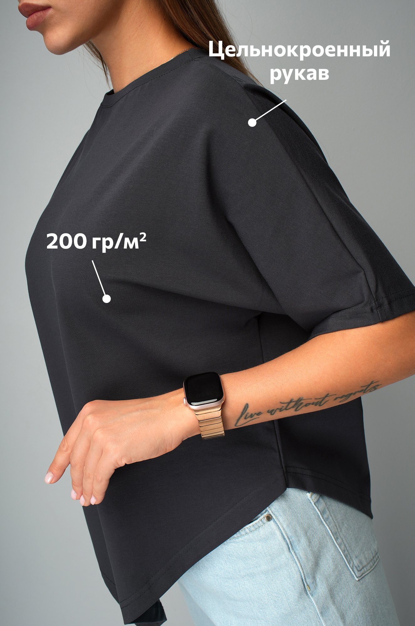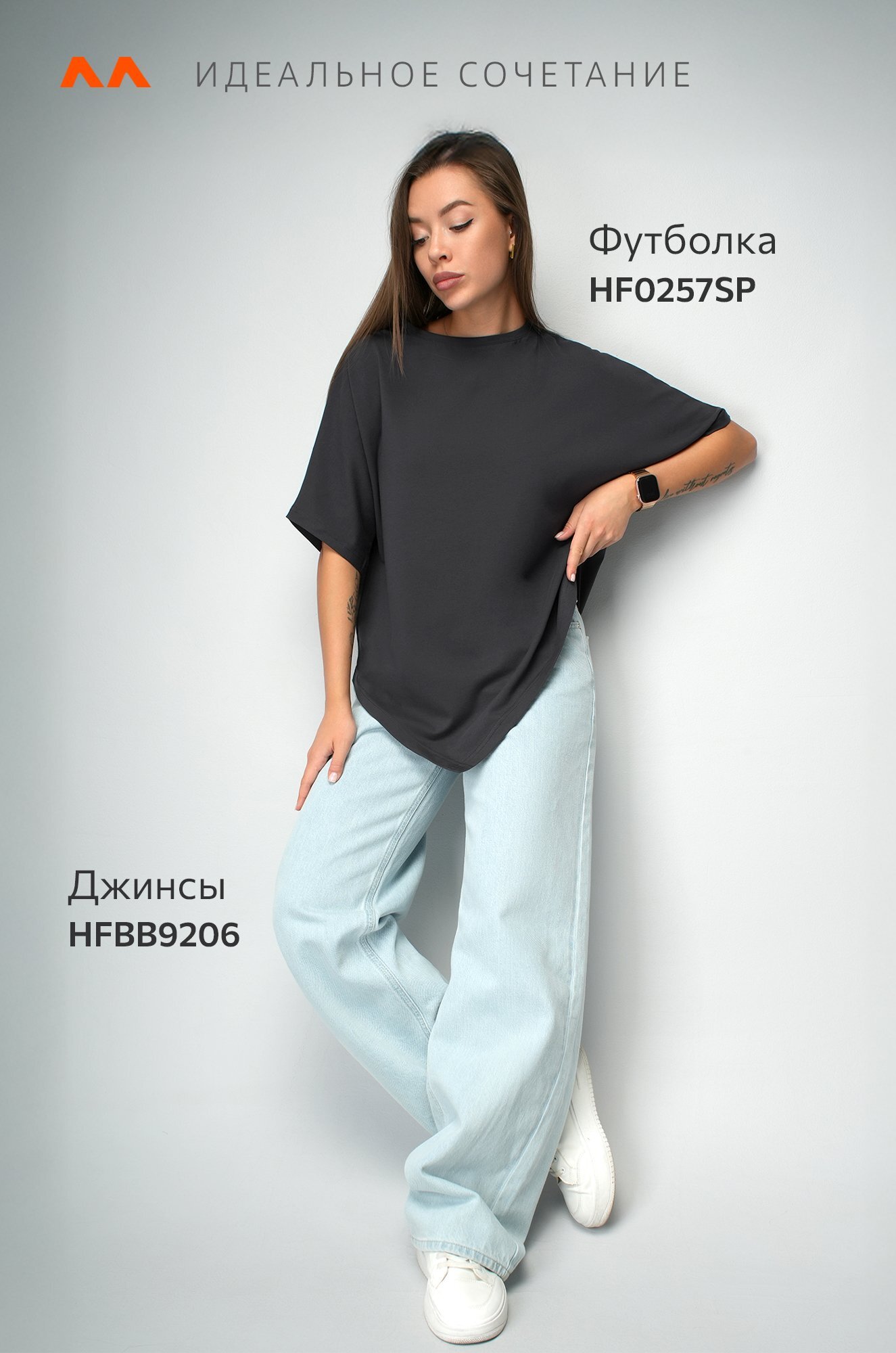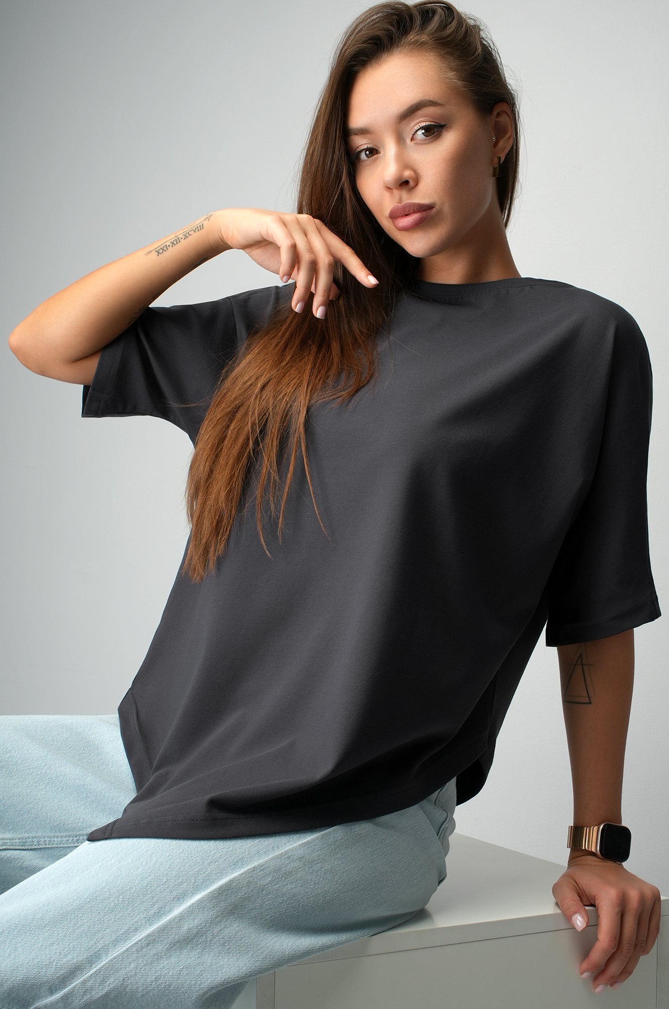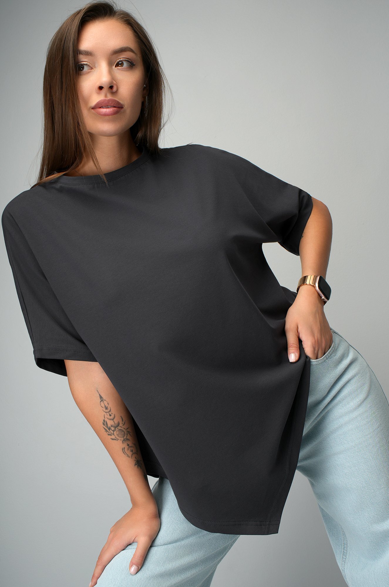 Базовая футболка графитового цвета подойдёт женщинам, которым нравится быть в центре внимания даже в повседневных образах.