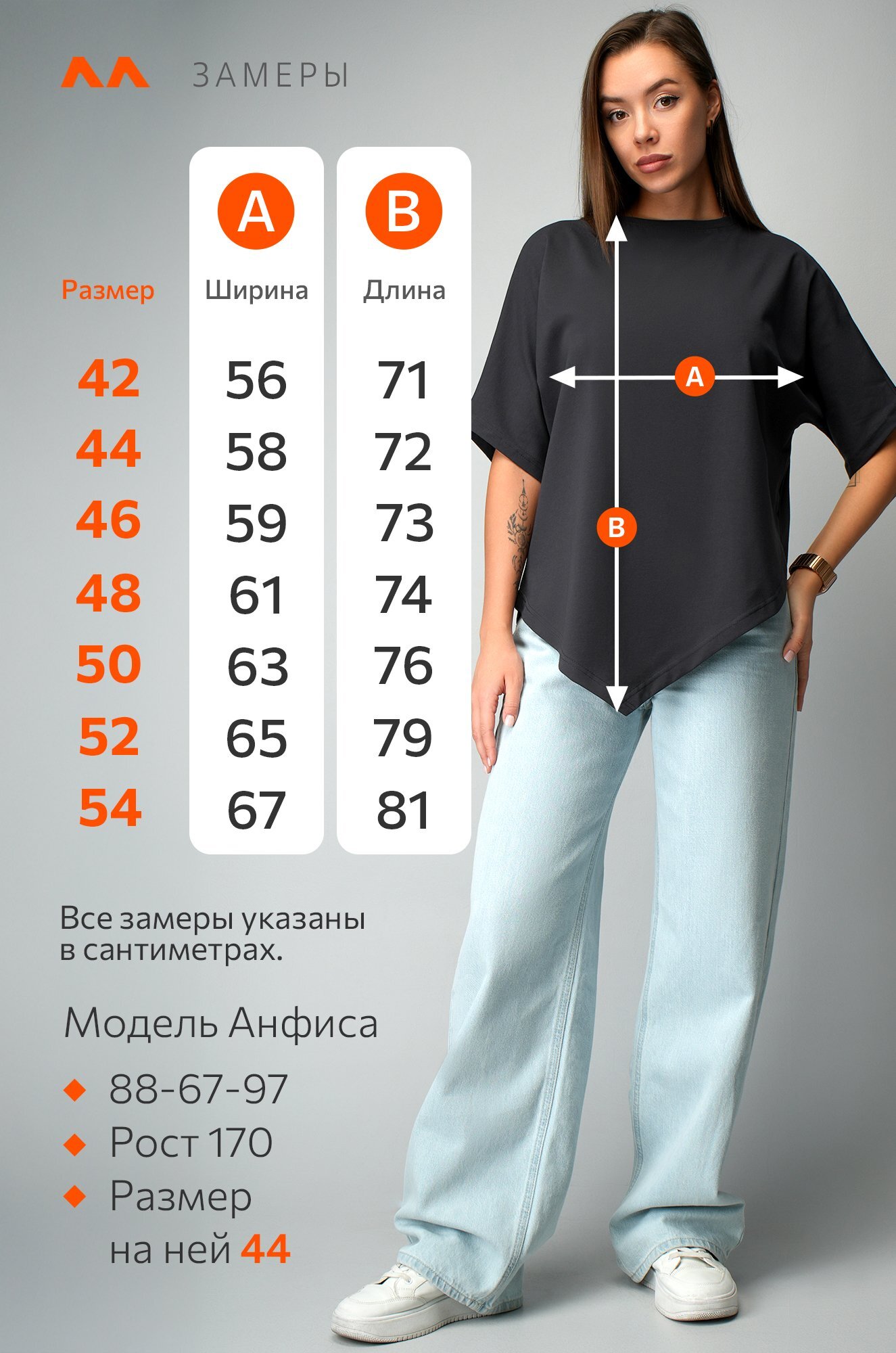 Модель Анфиса, его рост 170 см, параметры 88-67-97 см. На ней размер 44.