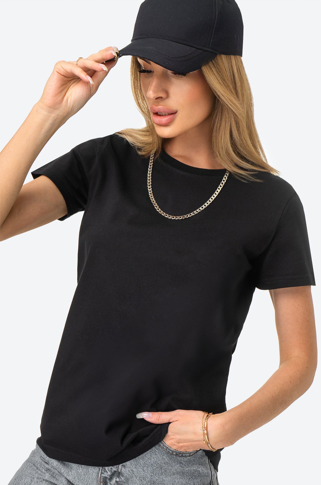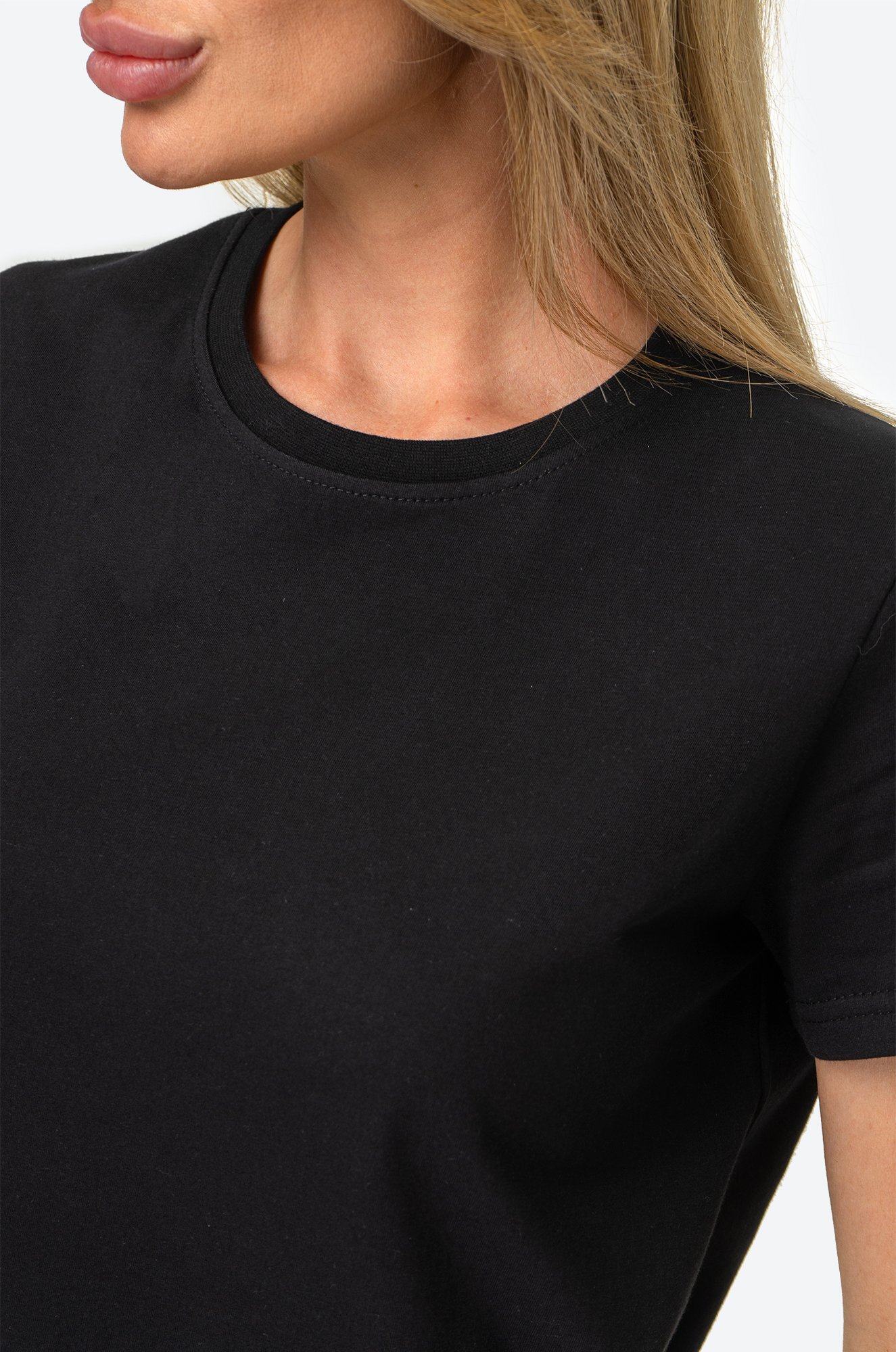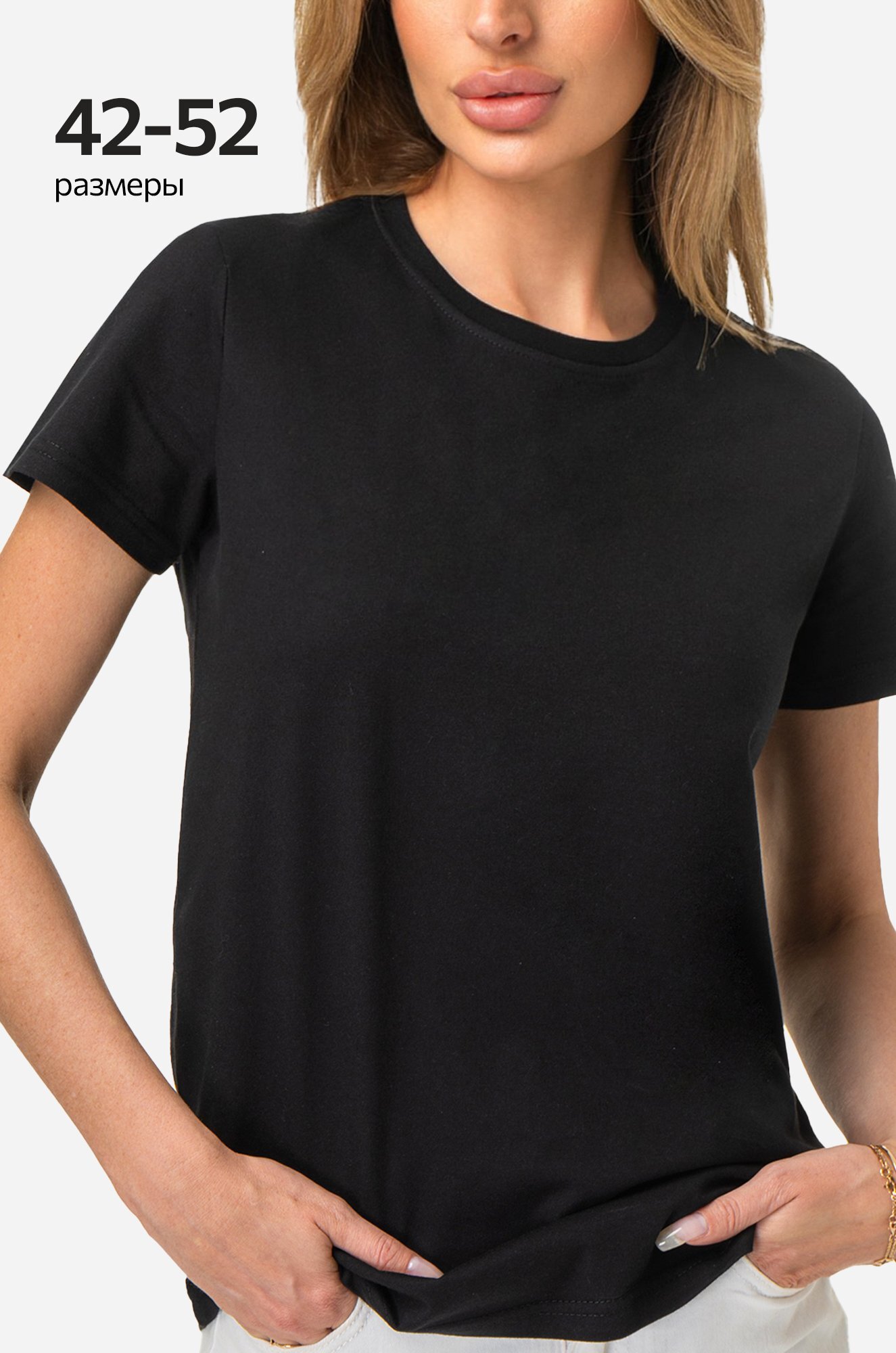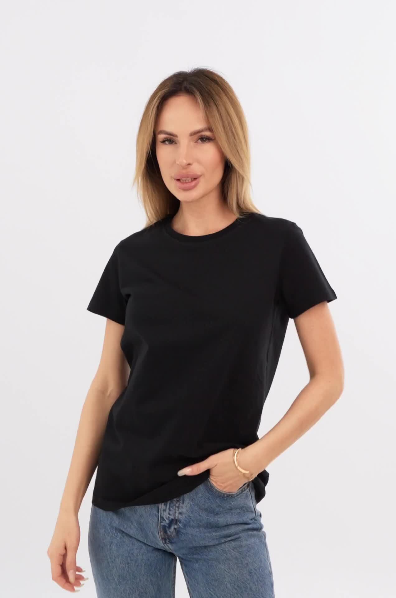 Базовая женская футболка станет незаменимой частью гардероба каждой женщины. Классическая футболка выполнена из 100% хлопка. Однотонная черная футболка — идеальный выбор для тех, кто ценит стиль, комфорт и простоту в каждой детали.