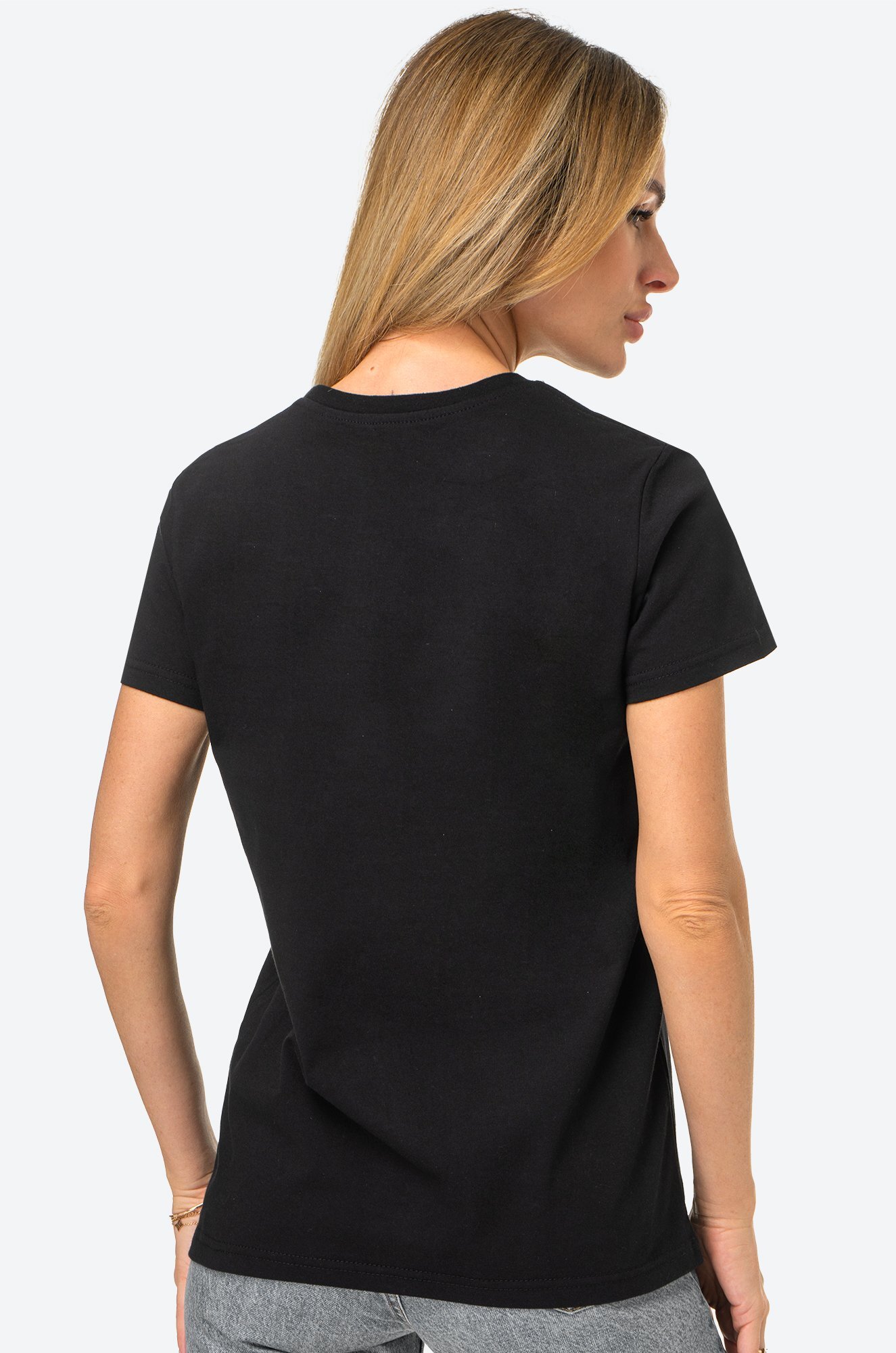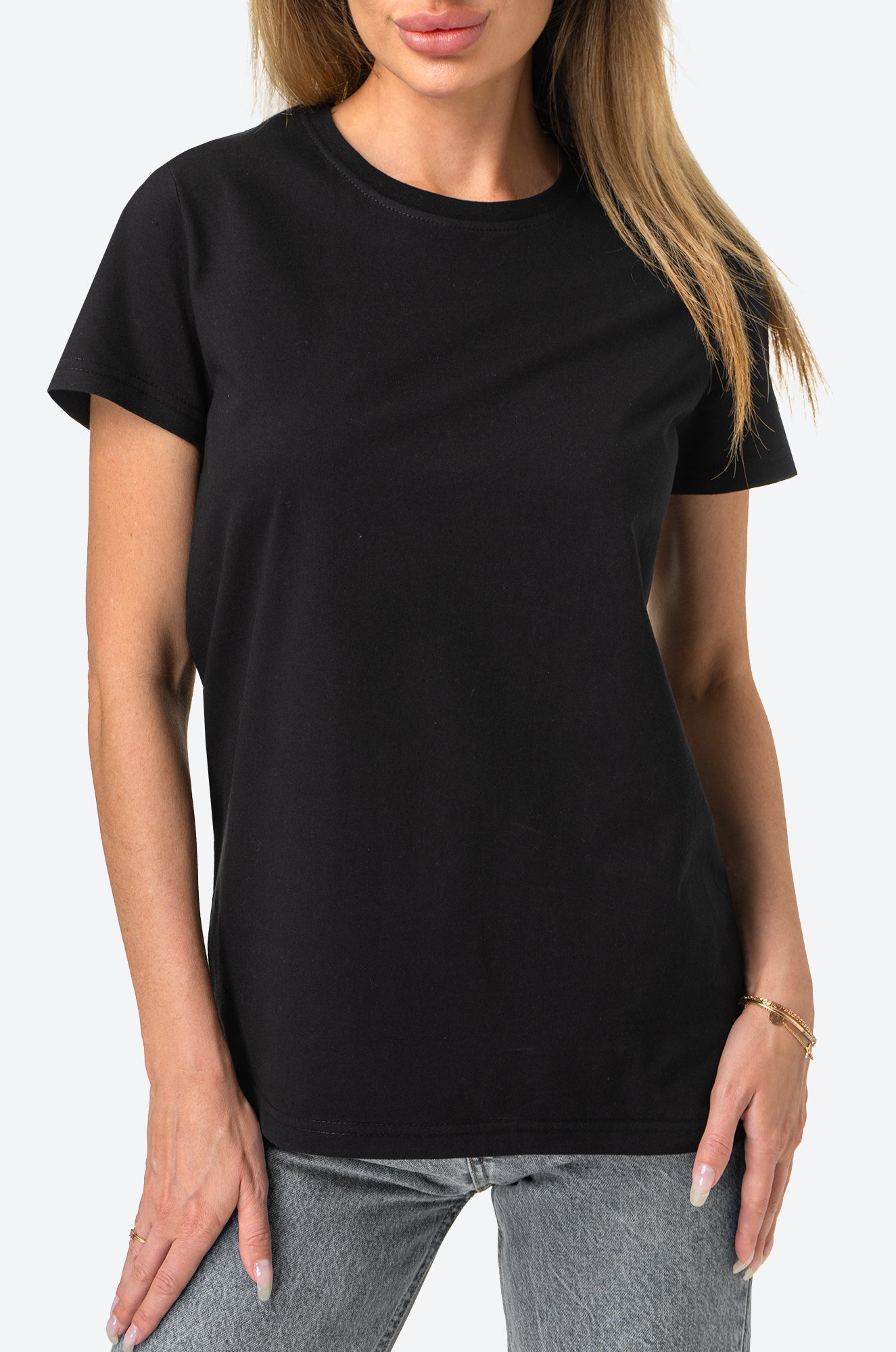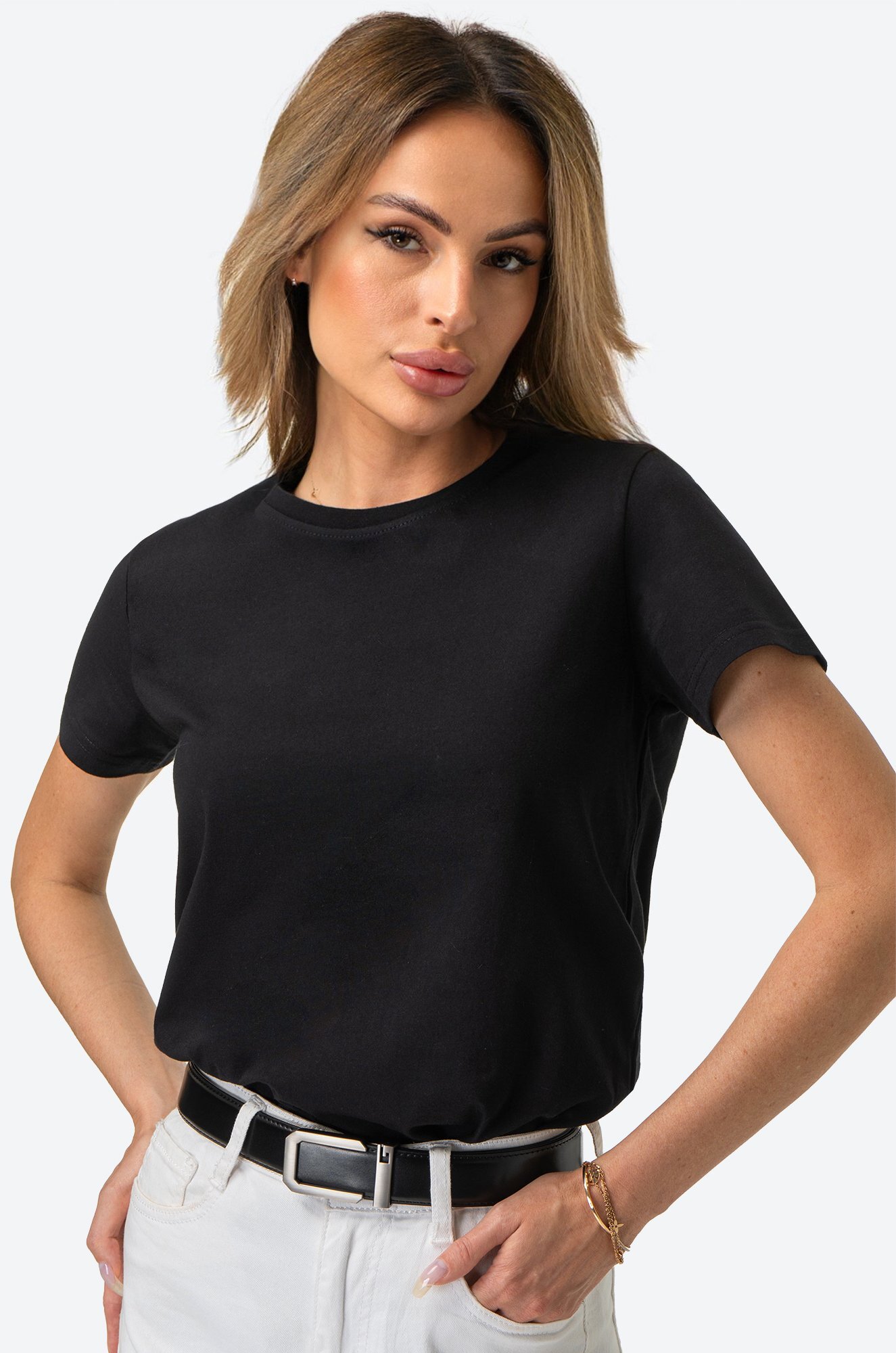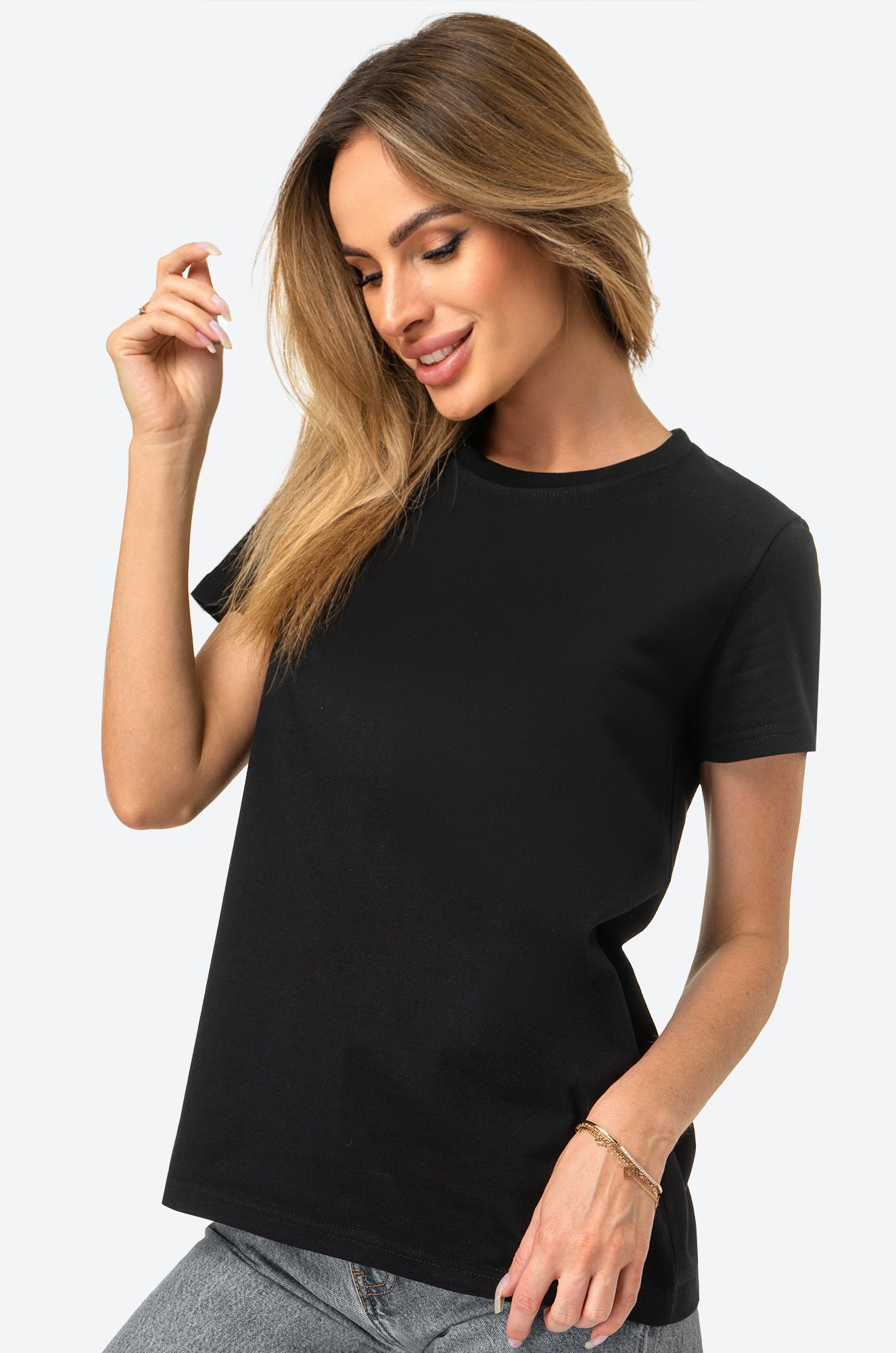 Базовая женская футболка станет незаменимой частью гардероба каждой женщины. Классическая футболка выполнена из 100% хлопка. Однотонная черная футболка — идеальный выбор для тех, кто ценит стиль, комфорт и простоту в каждой детали.
