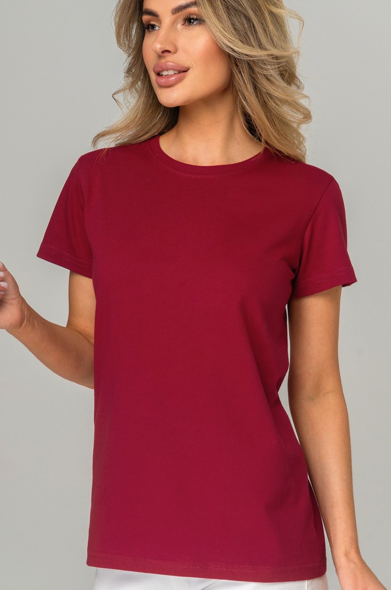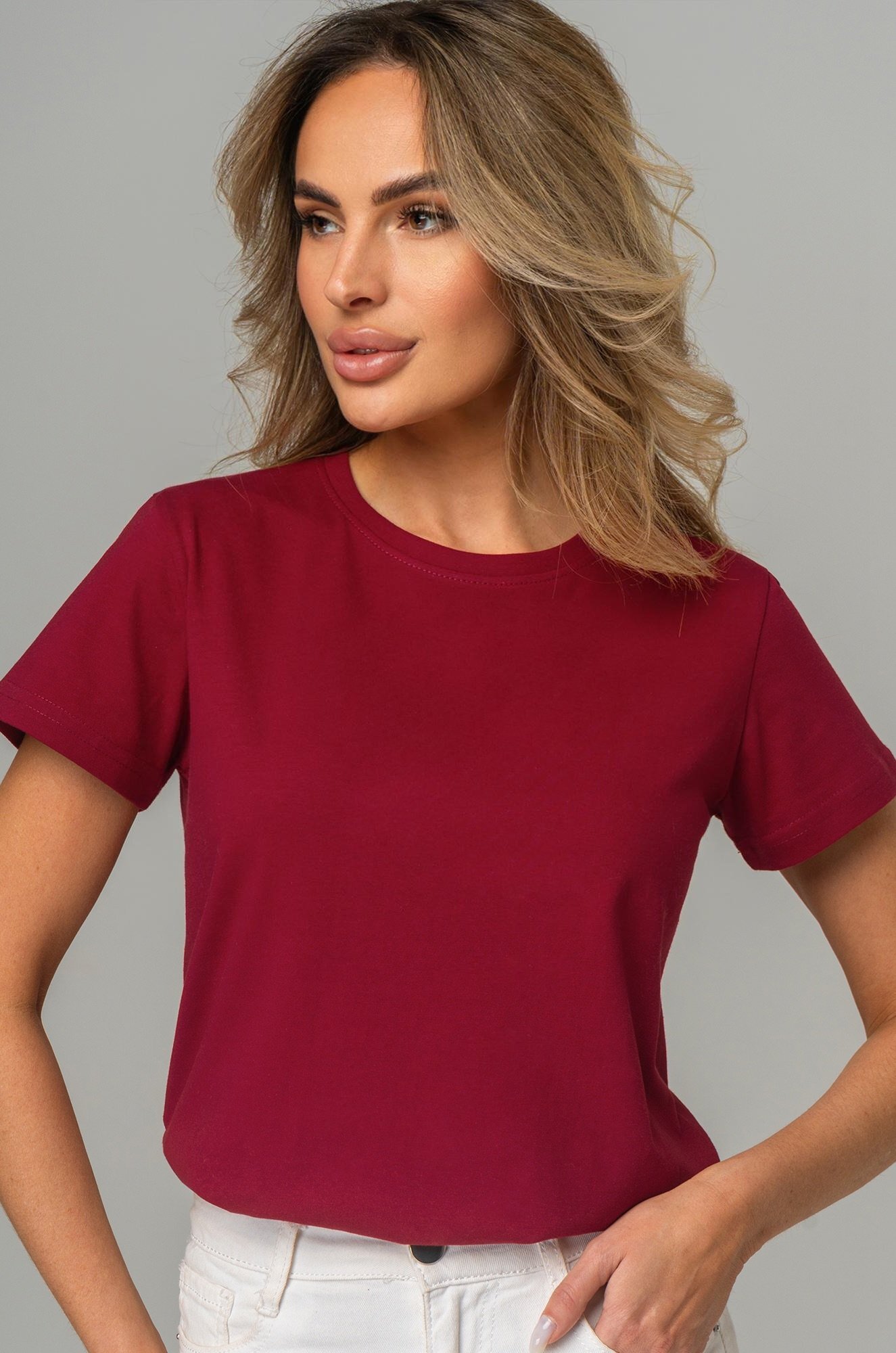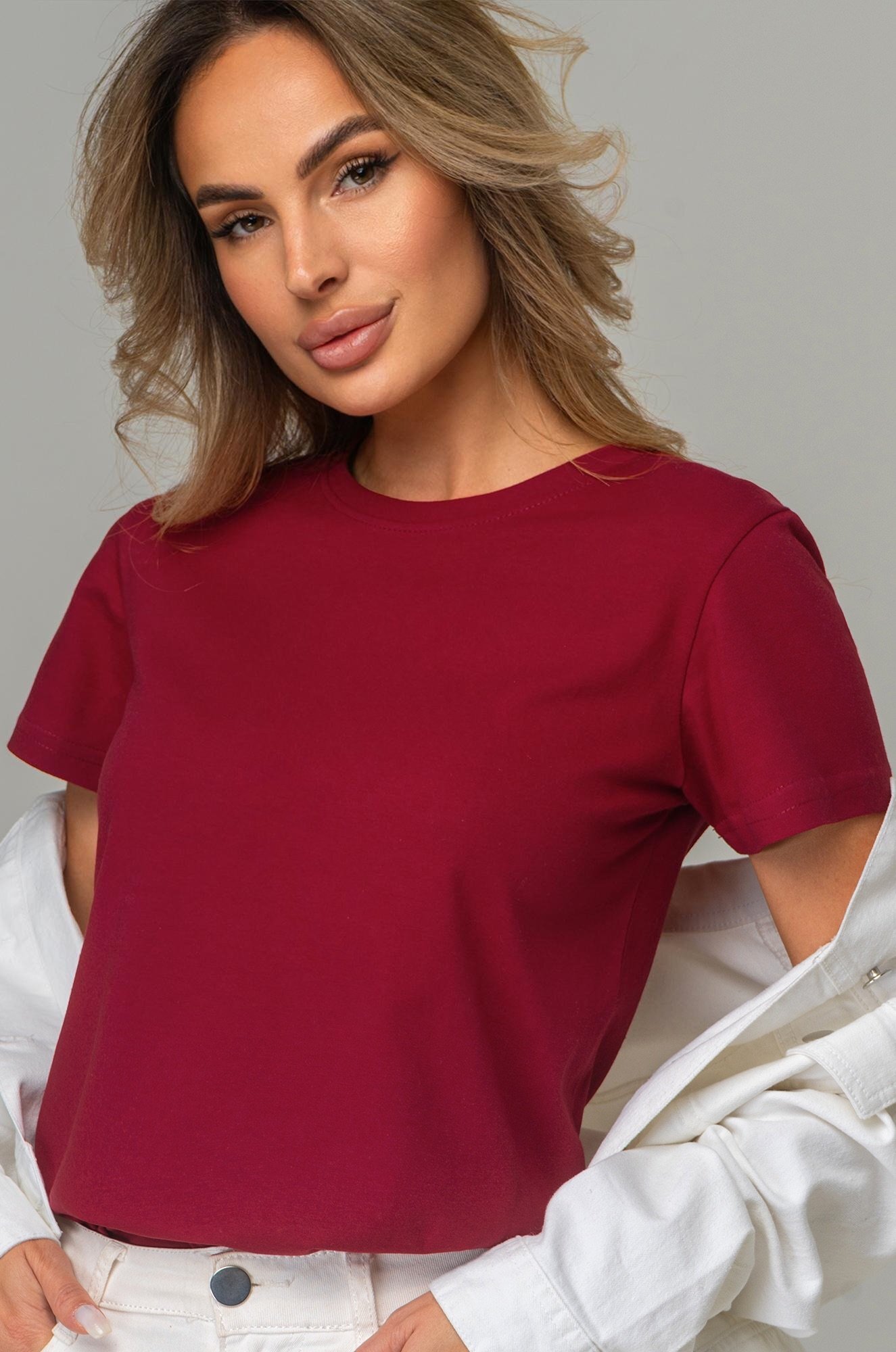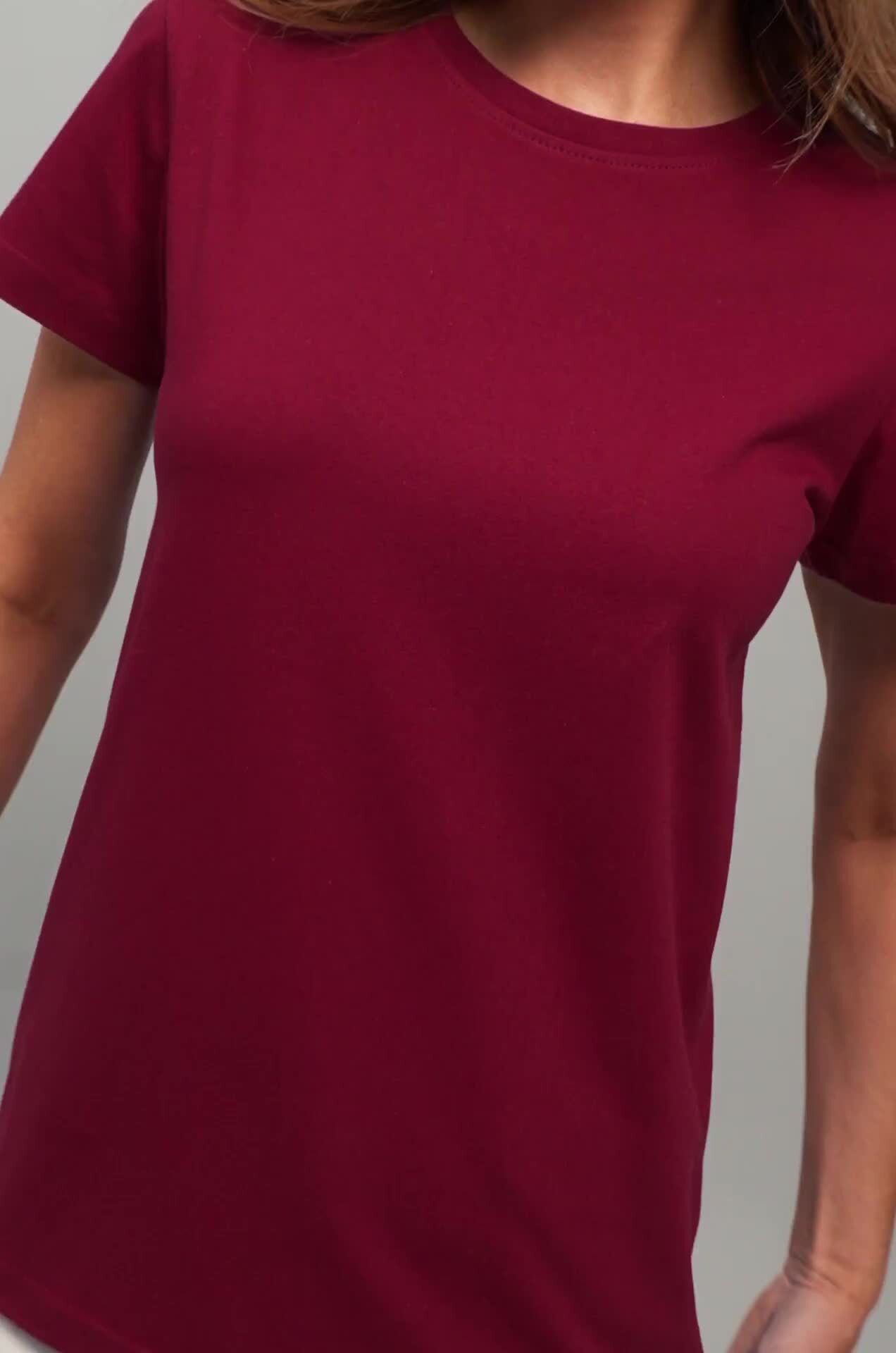 Базовая женская футболка станет незаменимой частью гардероба каждой женщины. Классическая футболка выполнена из 100% хлопка. Однотонная темно-бордовая футболка — идеальный выбор для тех, кто ценит стиль, комфорт и простоту в каждой детали.