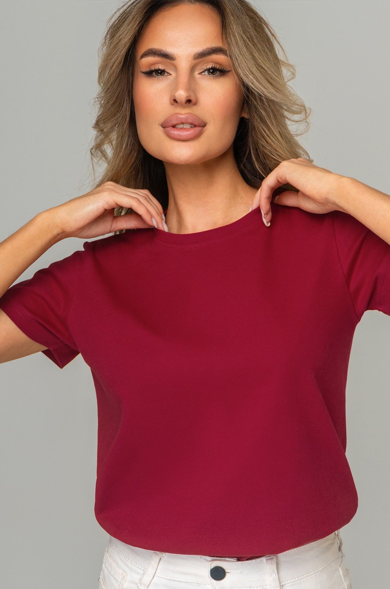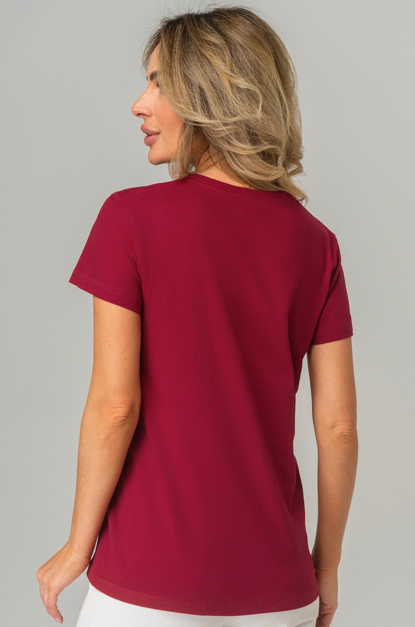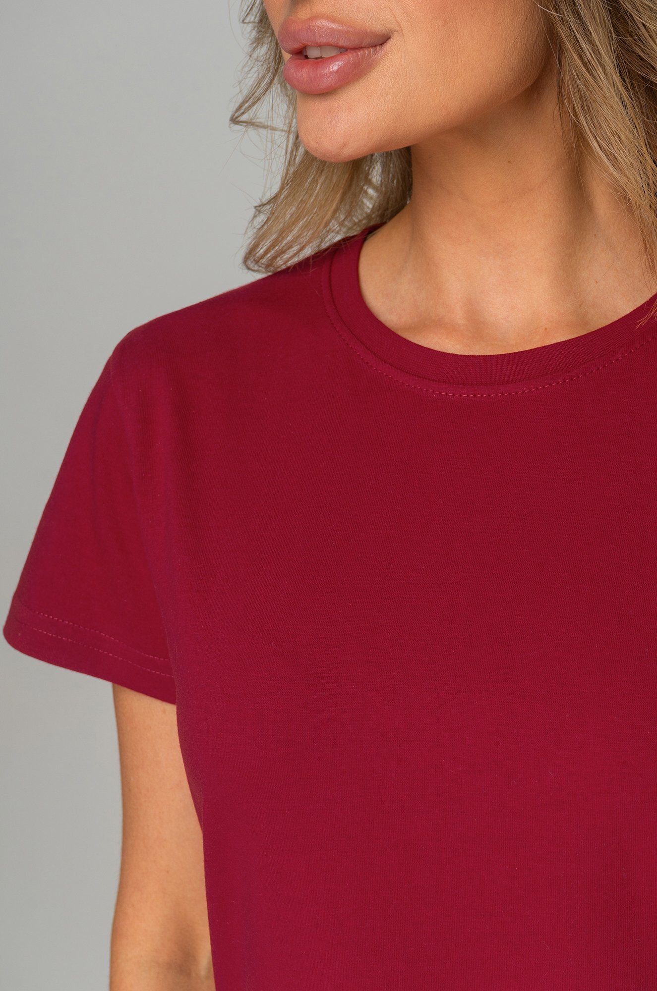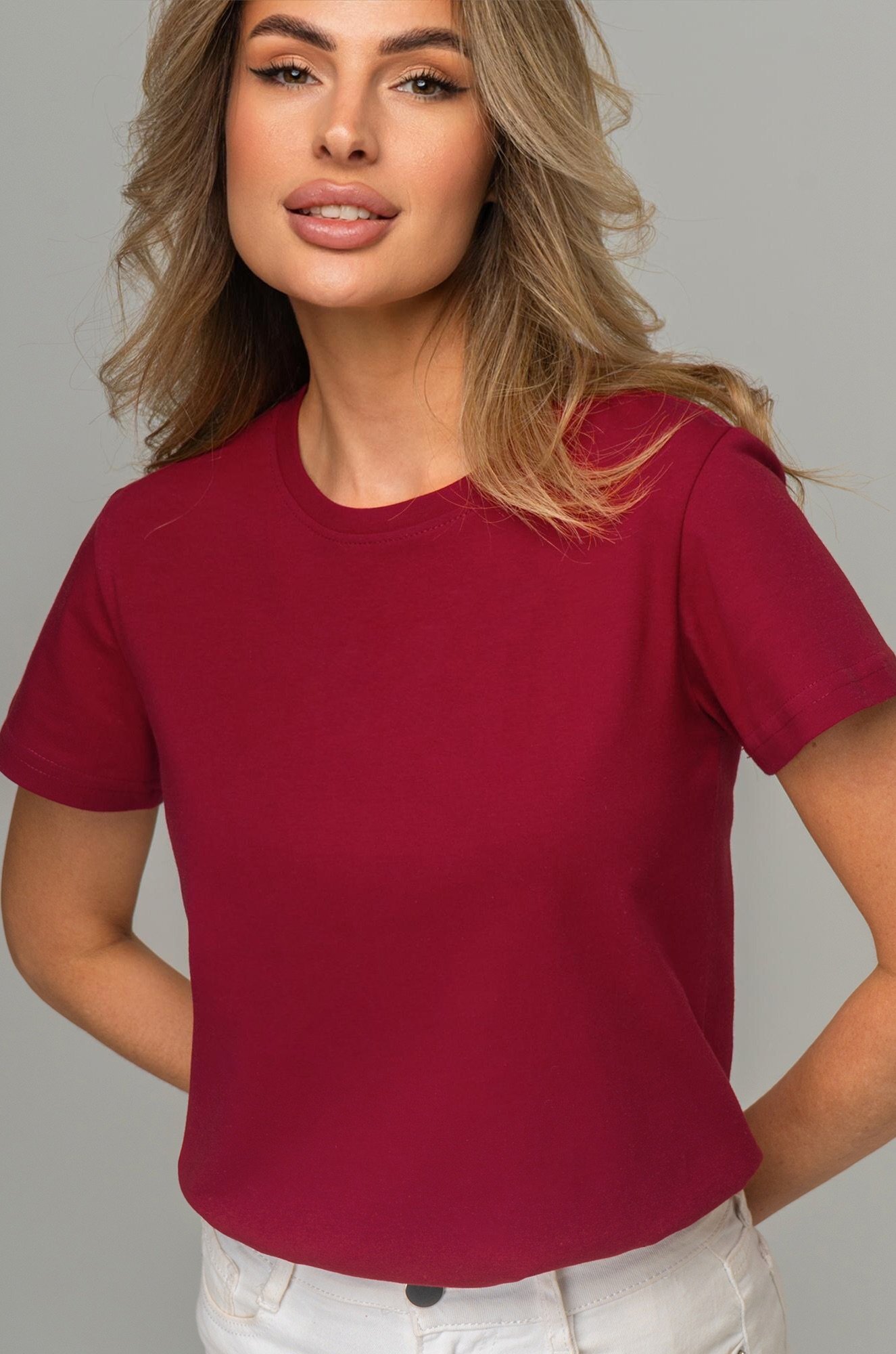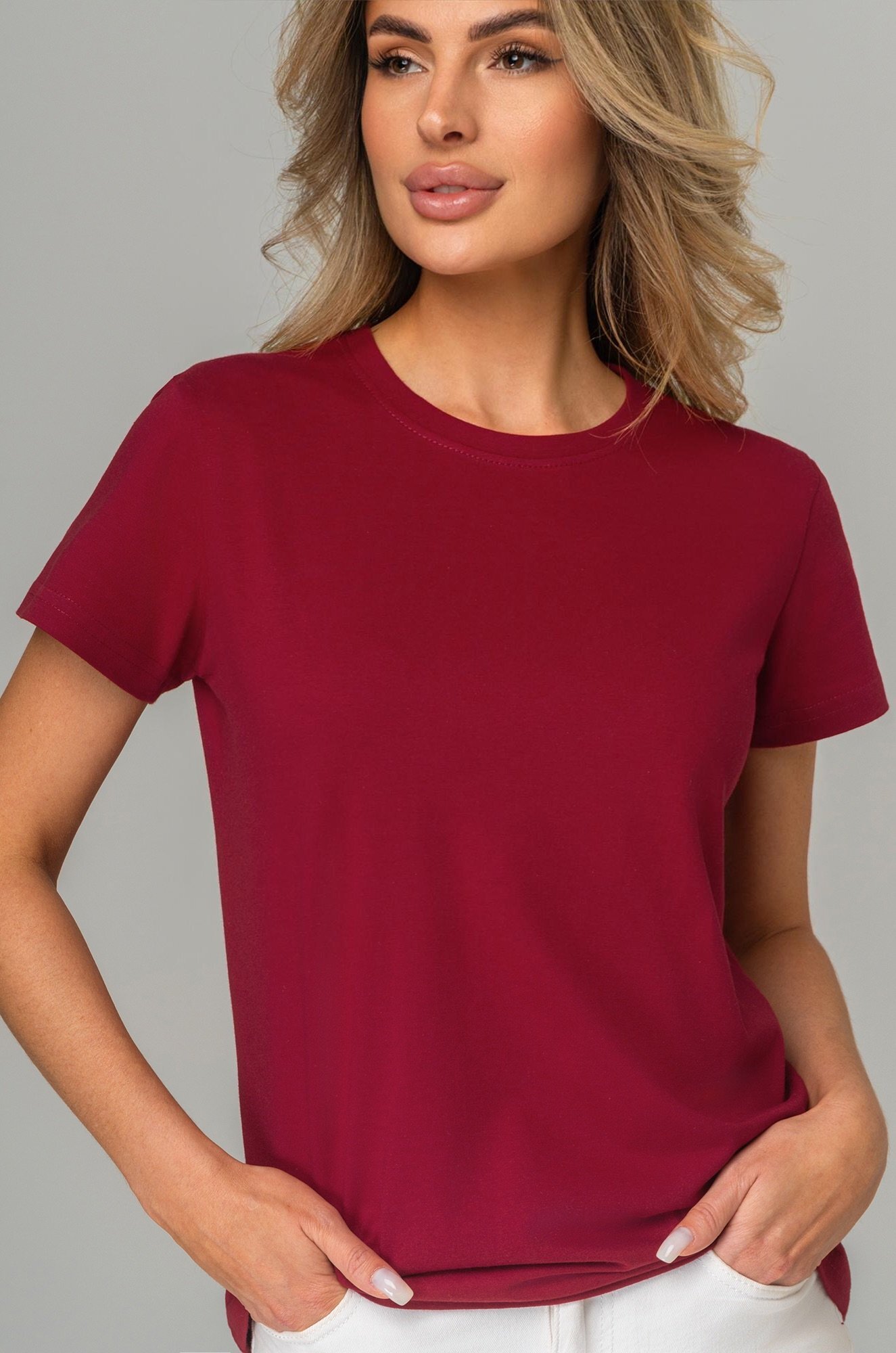 Базовая женская футболка станет незаменимой частью гардероба каждой женщины. Классическая футболка выполнена из 100% хлопка. Однотонная темно-бордовая футболка — идеальный выбор для тех, кто ценит стиль, комфорт и простоту в каждой детали.
