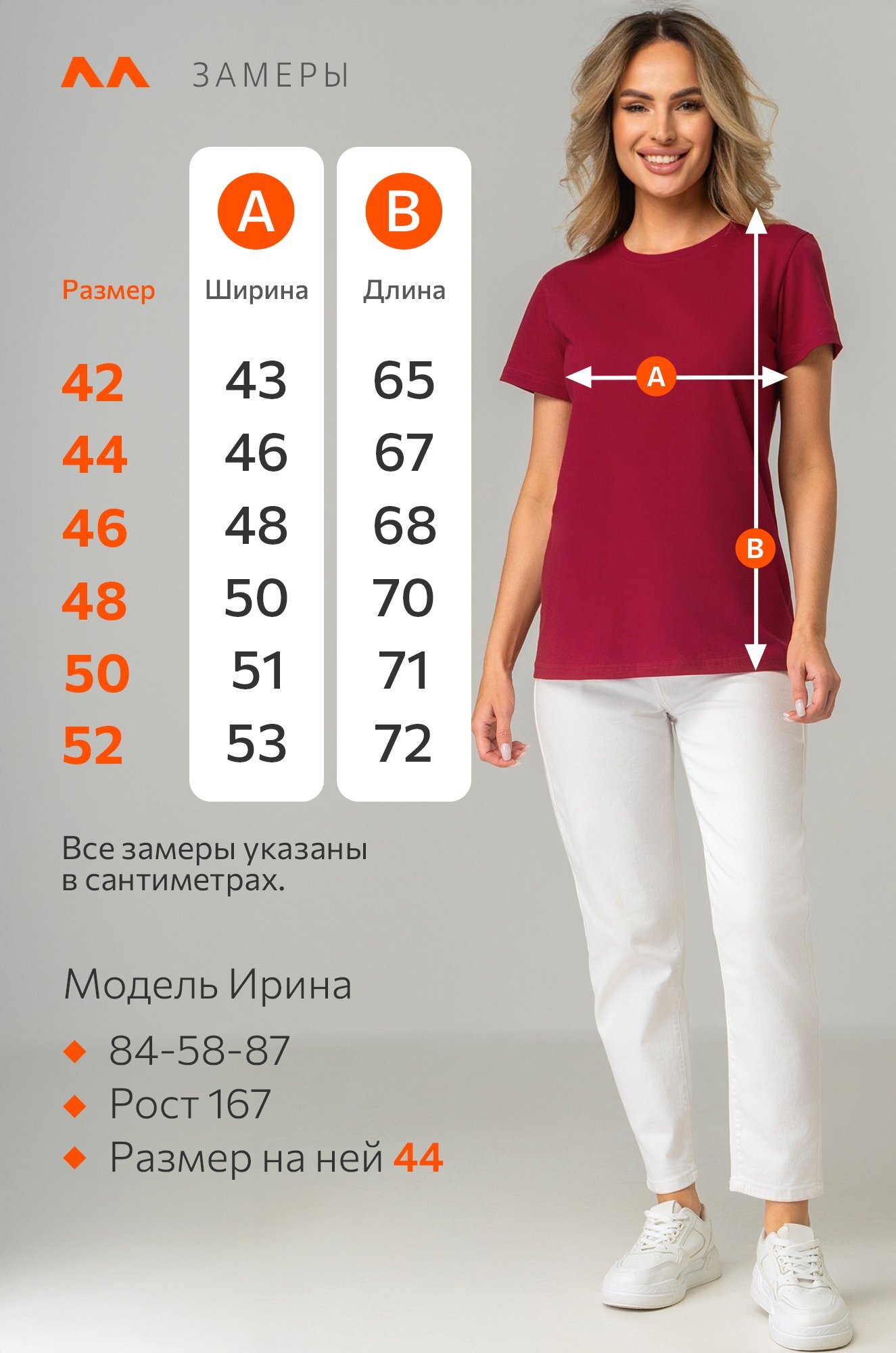 Модель Ирина, рост 167 см, параметры 84-58-87 см. На ней размер 44.