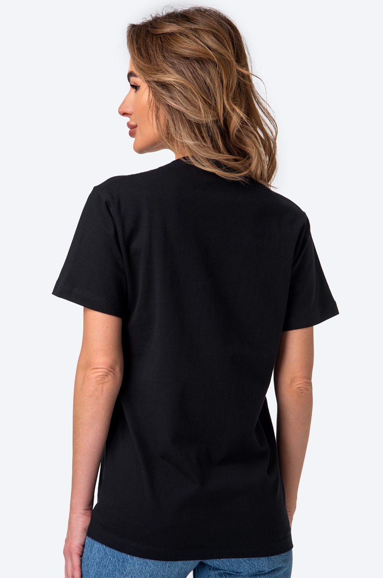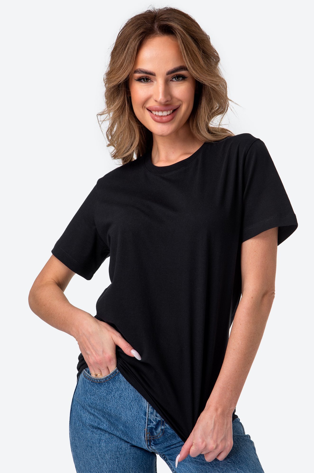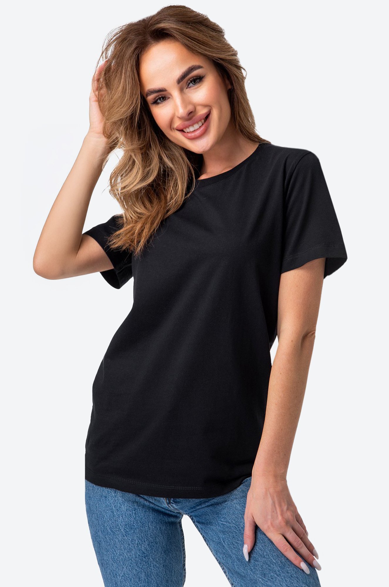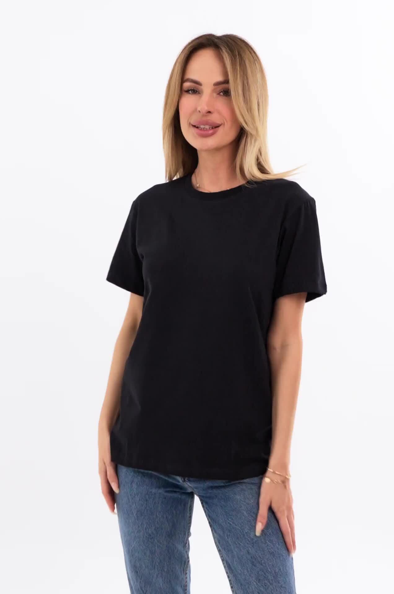 Однотонная женская футболка – тот случай, когда не нужно придумывать, что надеть. Черная футболка универсальна. Классическая модель с коротким рукавом выполнена из натурального 100% хлопка.