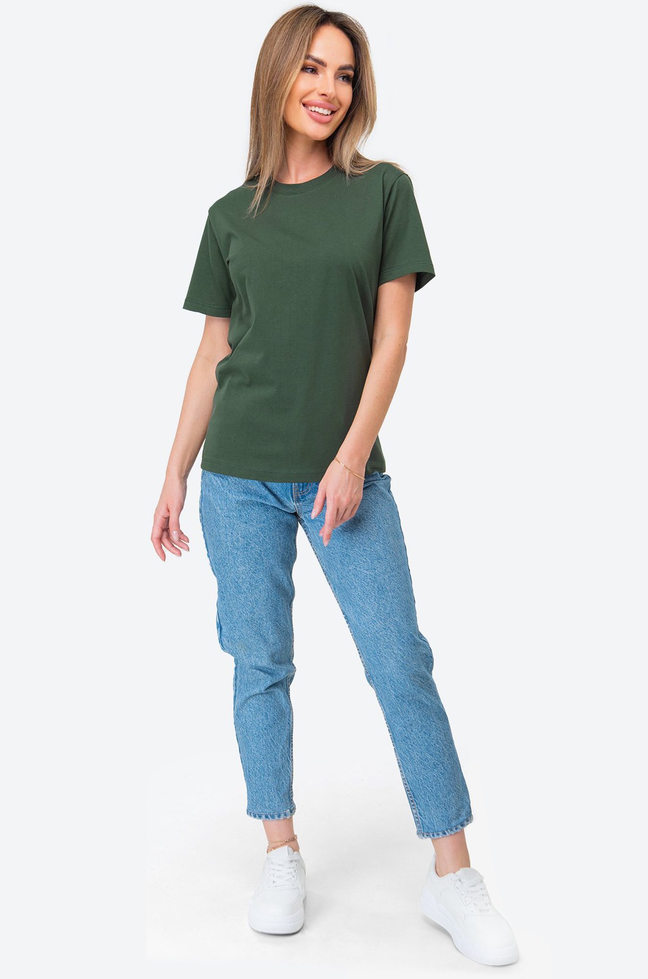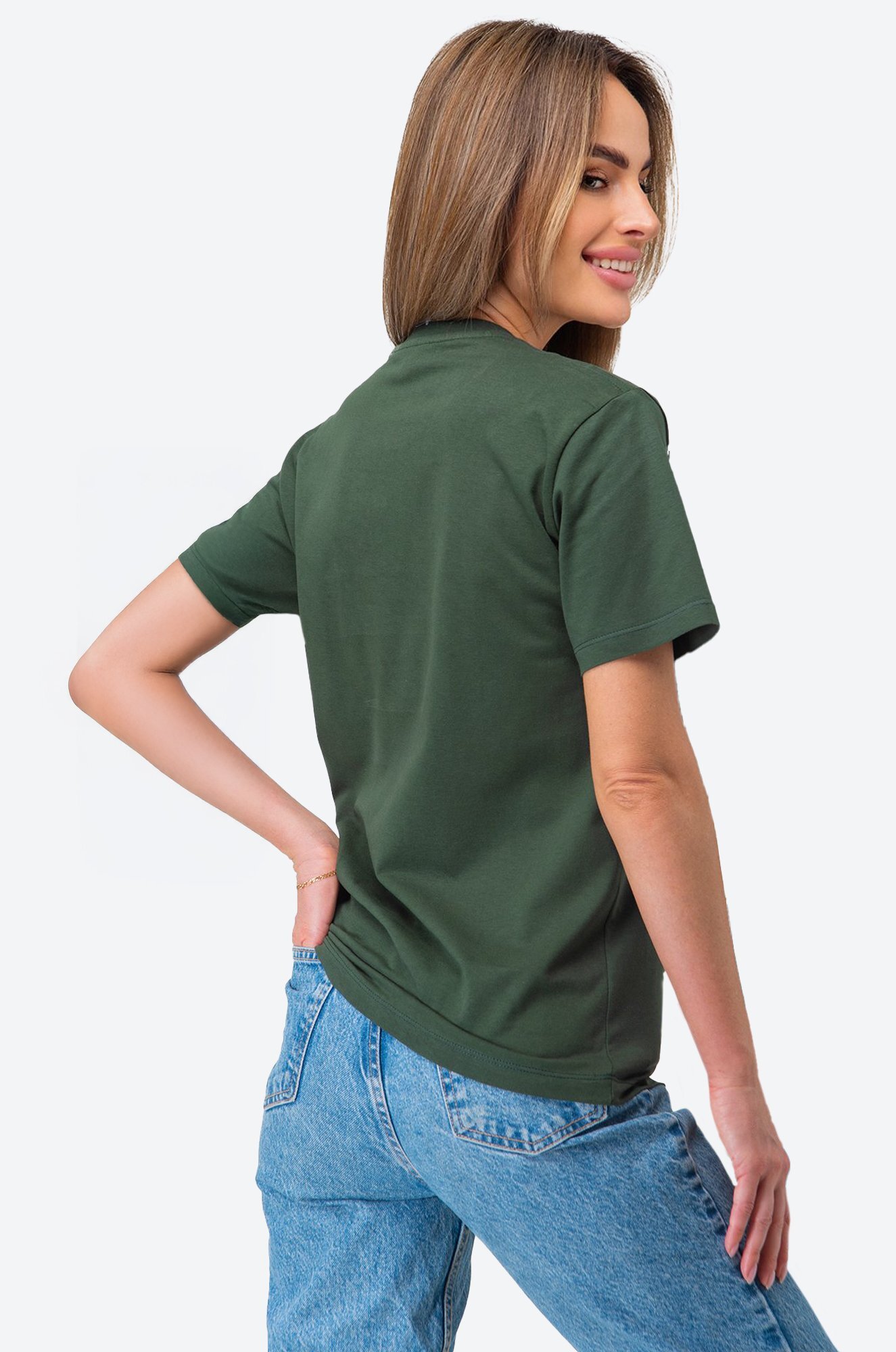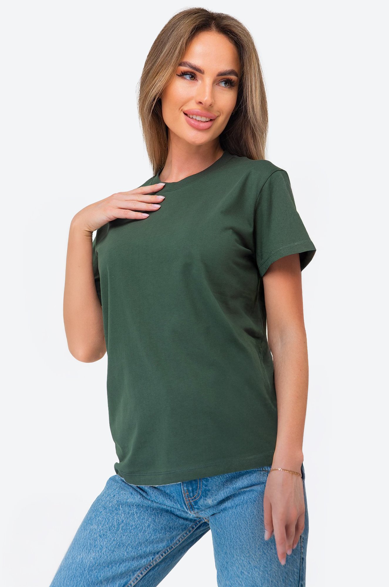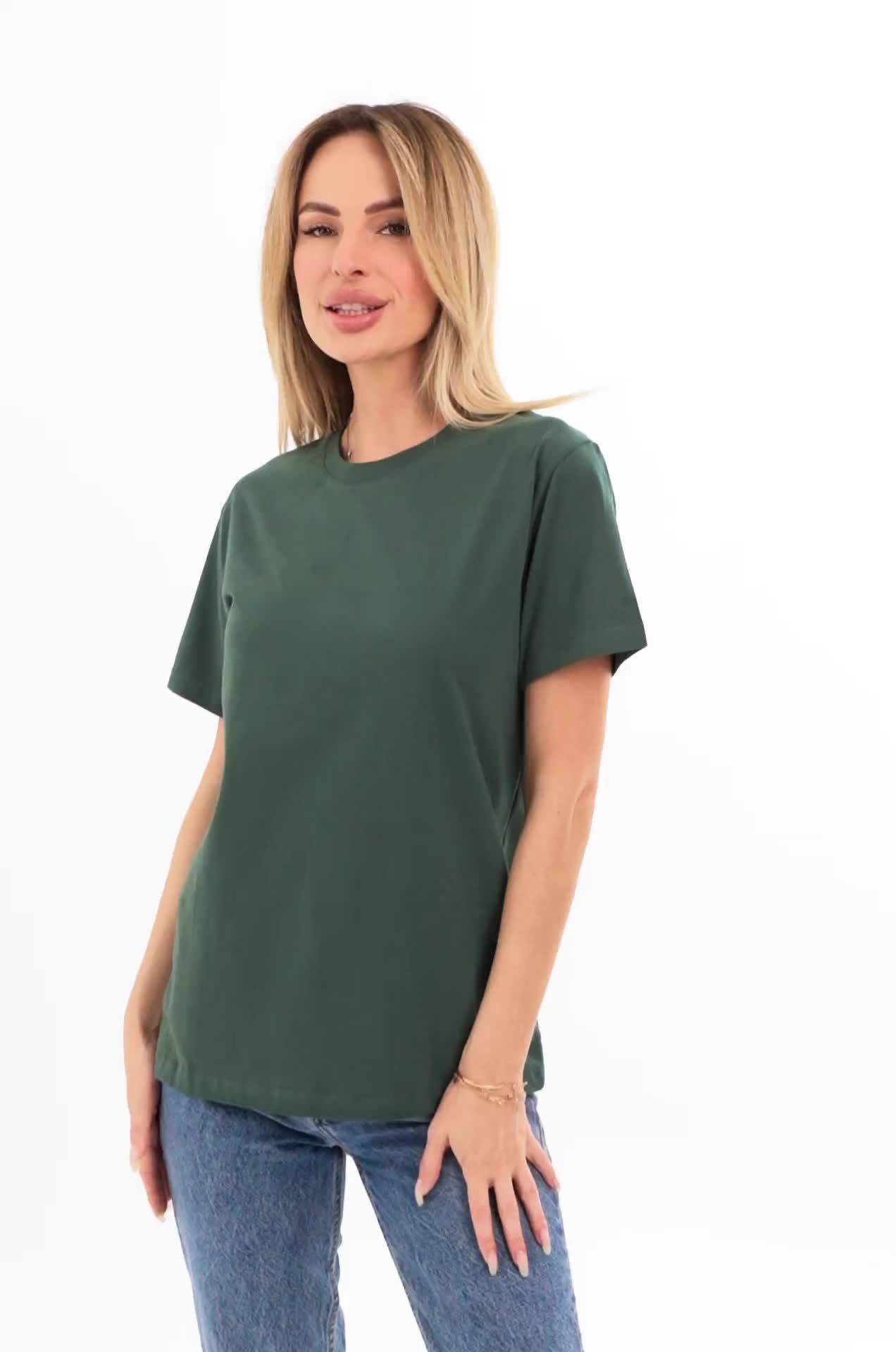 Однотонная женская футболка – тот случай, когда не нужно придумывать, что надеть. Футболка цвета хаки универсальна. Классическая модель с коротким рукавом выполнена из натурального 100% хлопка.