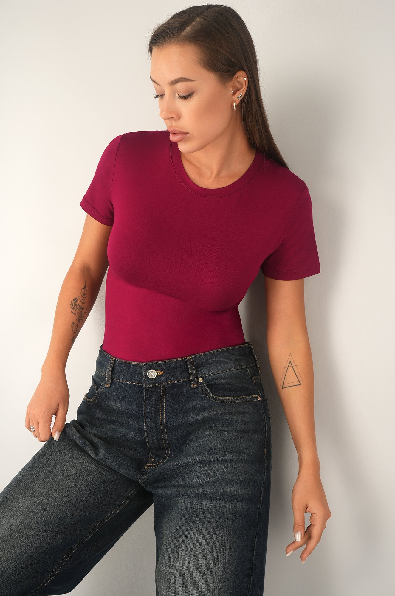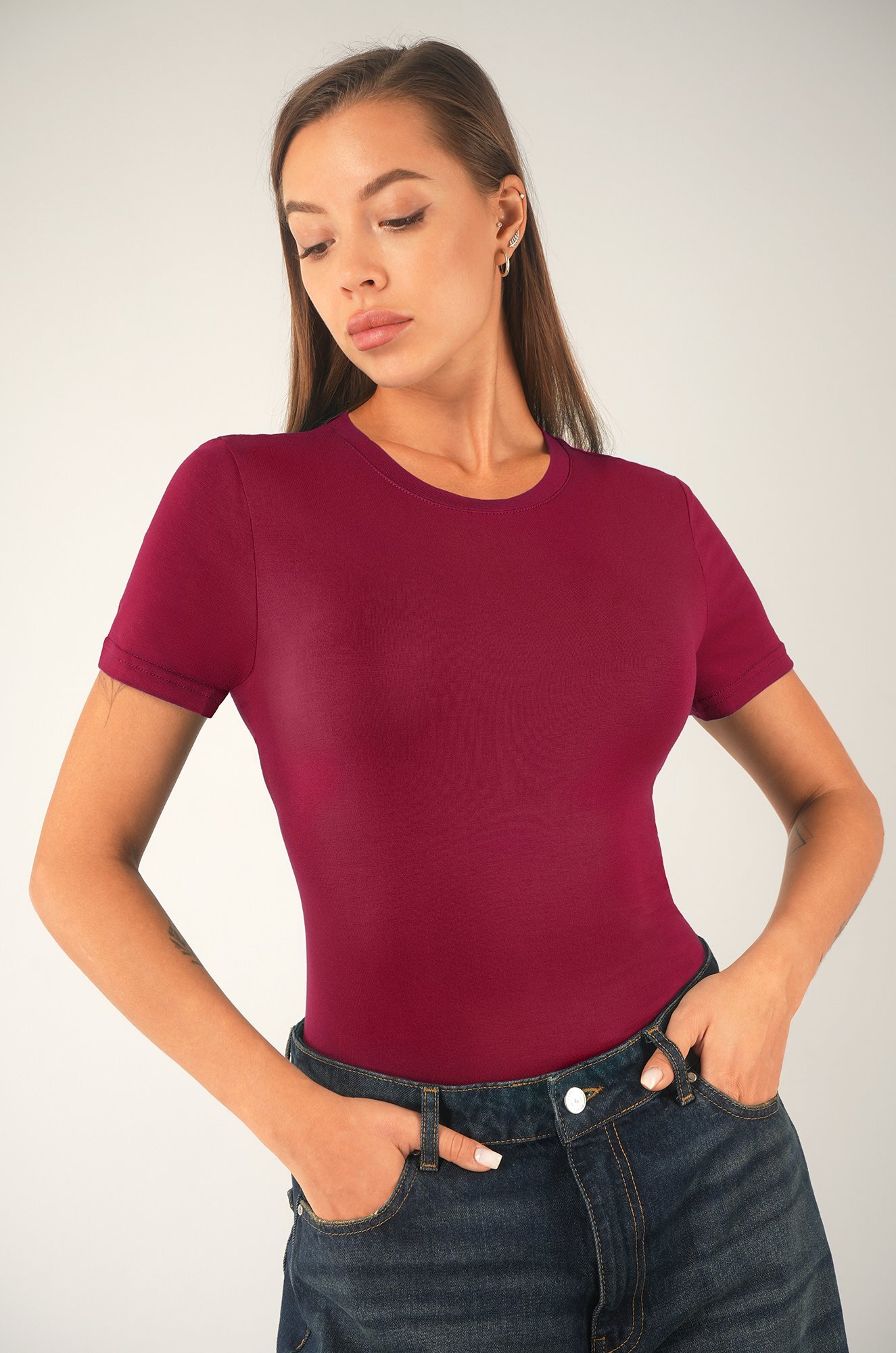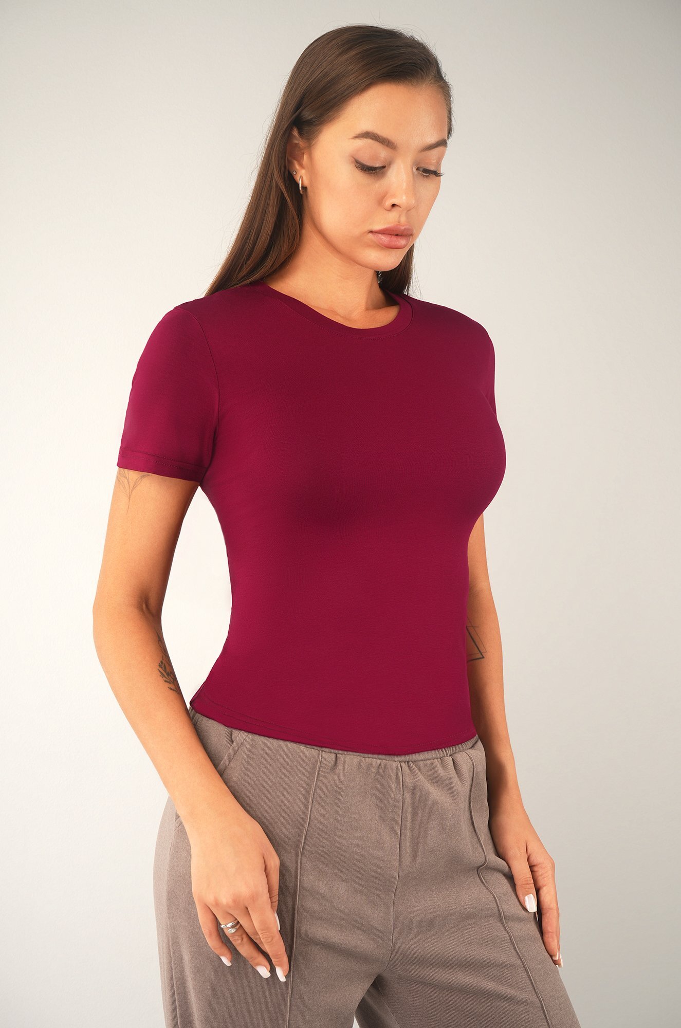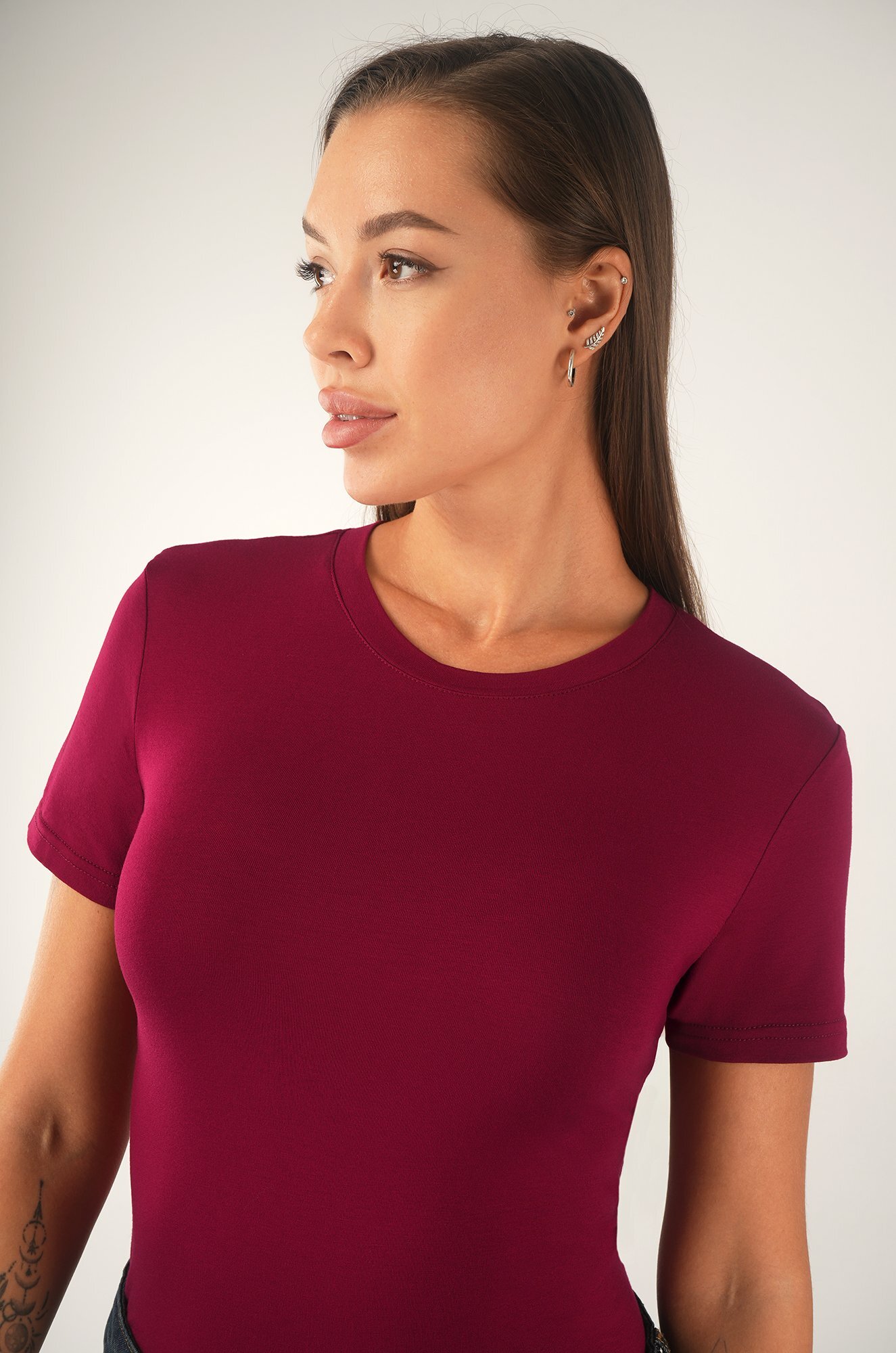 Летняя футболка оттенка бургунди идеальна для повседневных образов в стиле смарт кэжуал (smart casual). Вискозная обтягивающая футболка оттенка марсала – прекрасный вариант на лето.