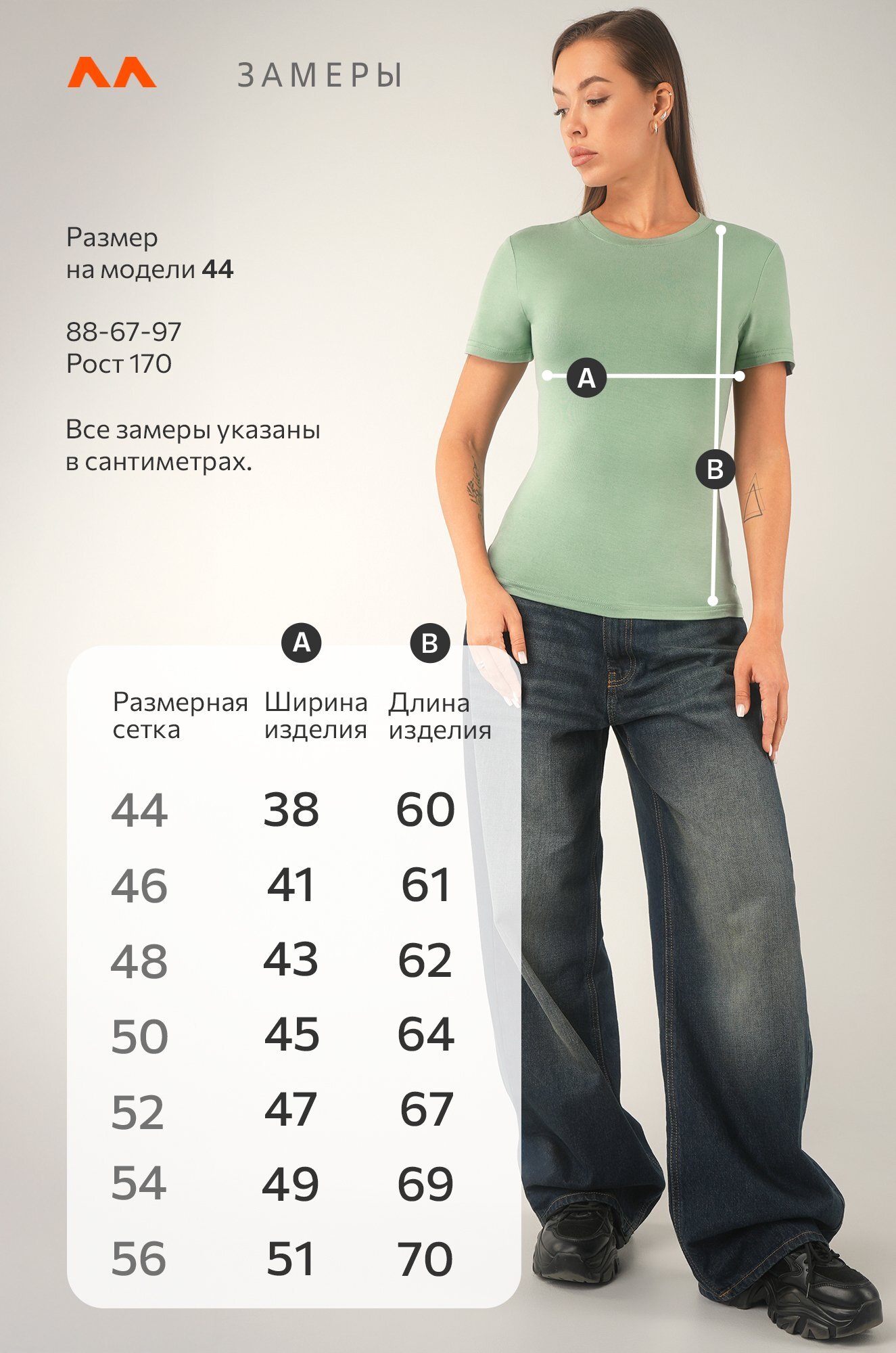 Модель Анфиса, ее рост 170, параметры: 88-67-97. На ней размер 44.