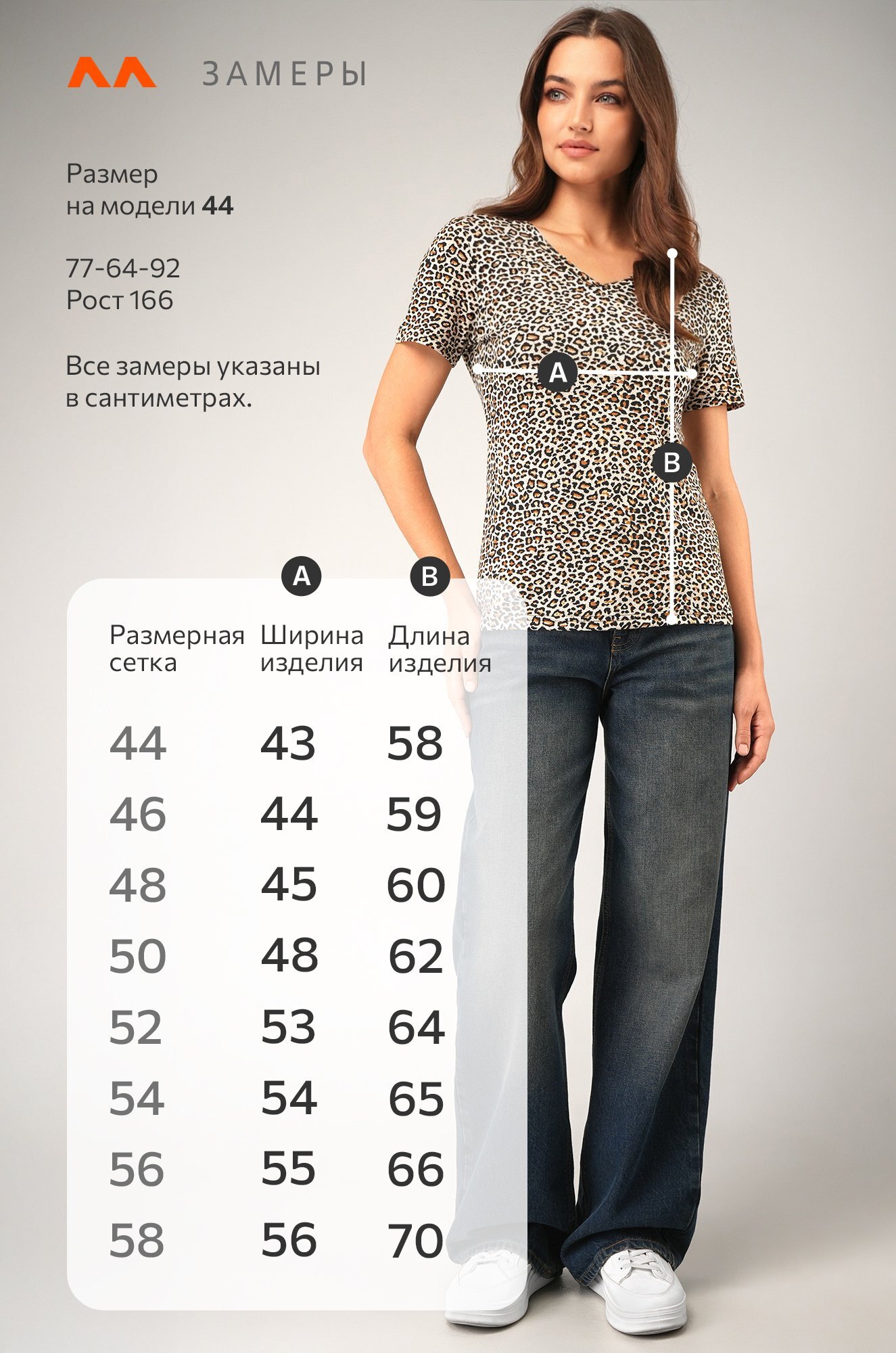 Модель Ирина, рост 167 см, параметры 88-61-90 см. На ней футболка размера 44.