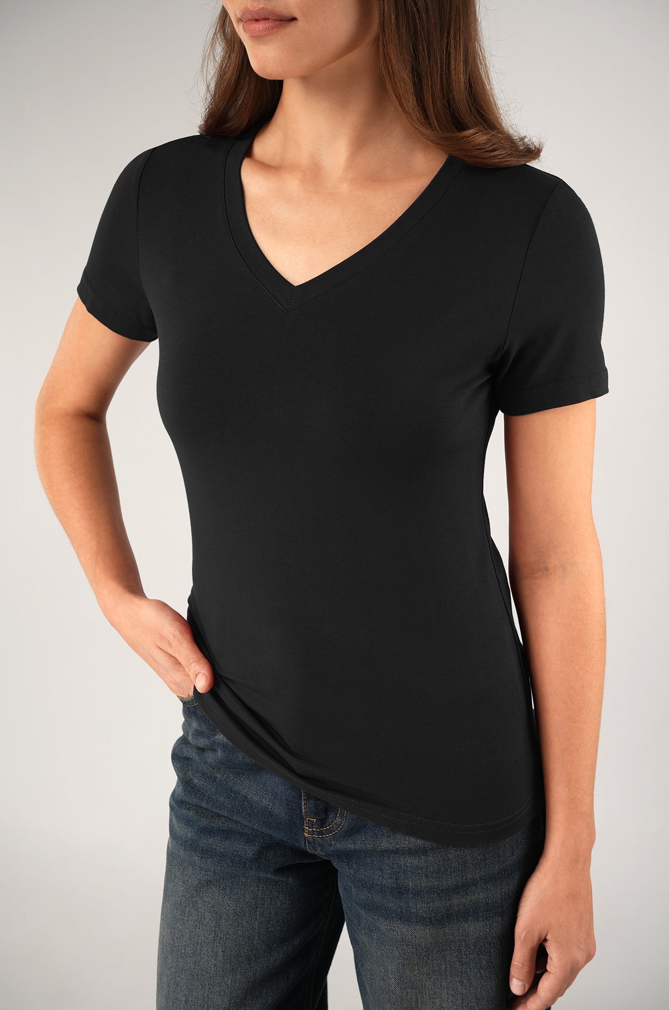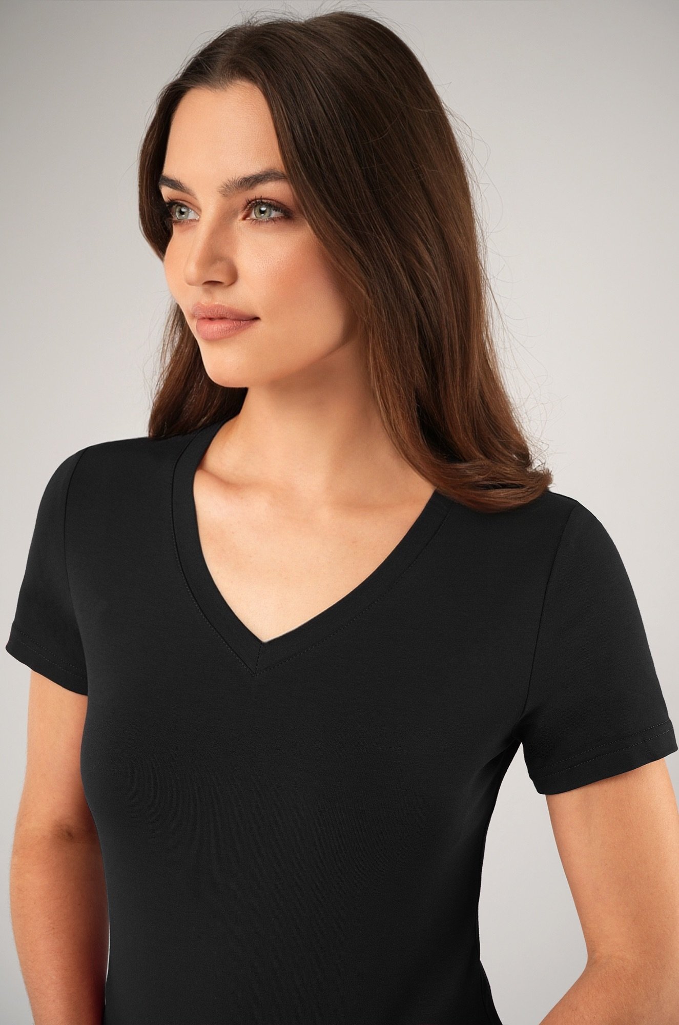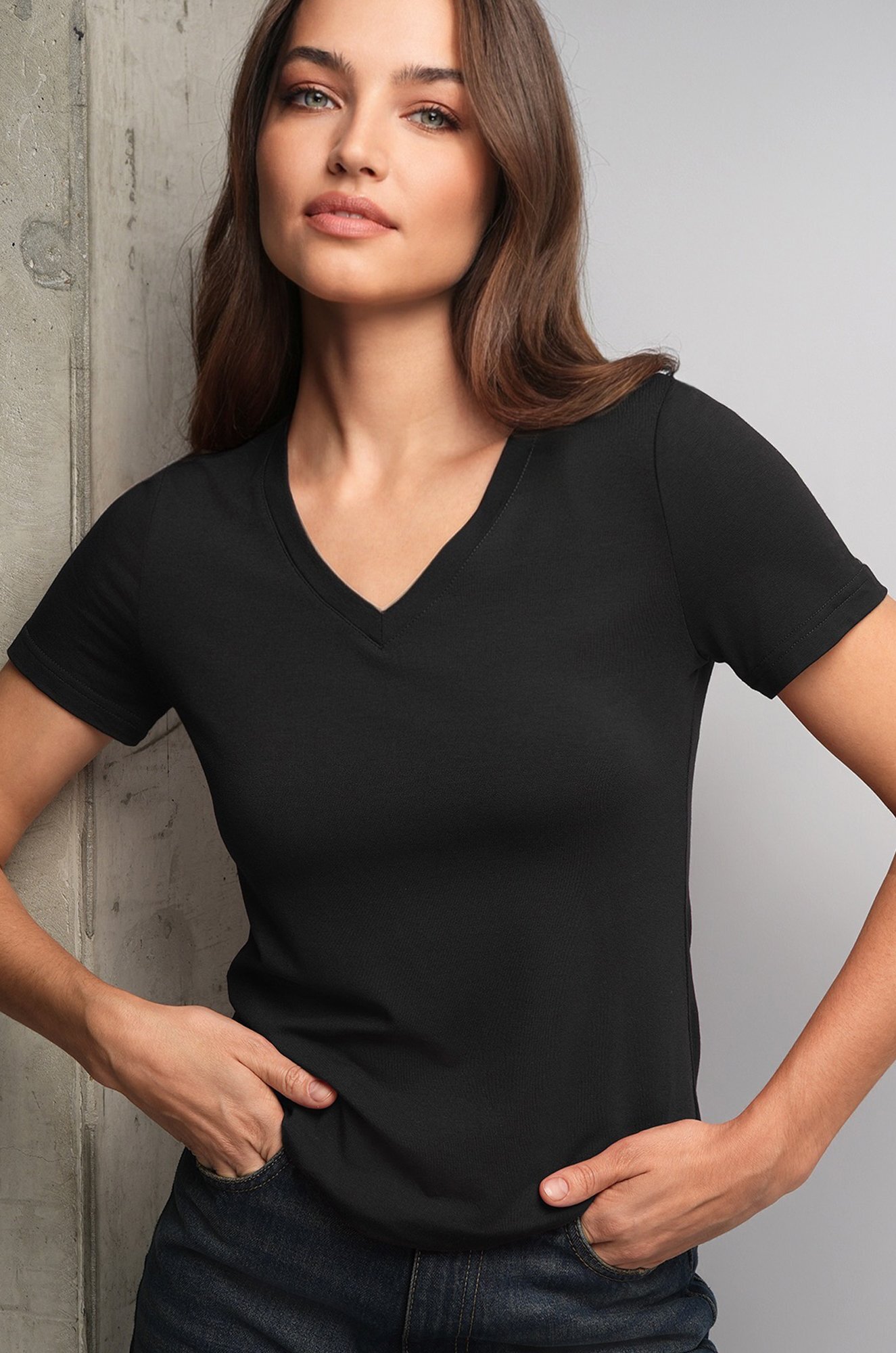 Базовая женская футболка из вискозы – настоящая находка для любителей приталенного силуэта. Модель с V-образным вырезом подчеркивает шею и зону декольте и выглядит очень женственно.