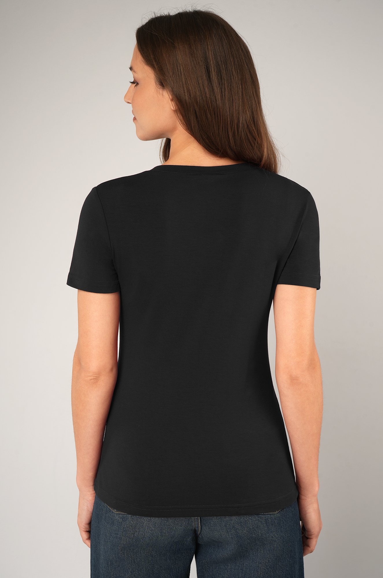 Мягкая и нежная вискоза приятно прилегает к телу и дарит комфорт в течение всего дня. Однотонная черная футболка прекрасно смотрится в классическом стиле, а также стиле smart casual (смарт кэжуал).