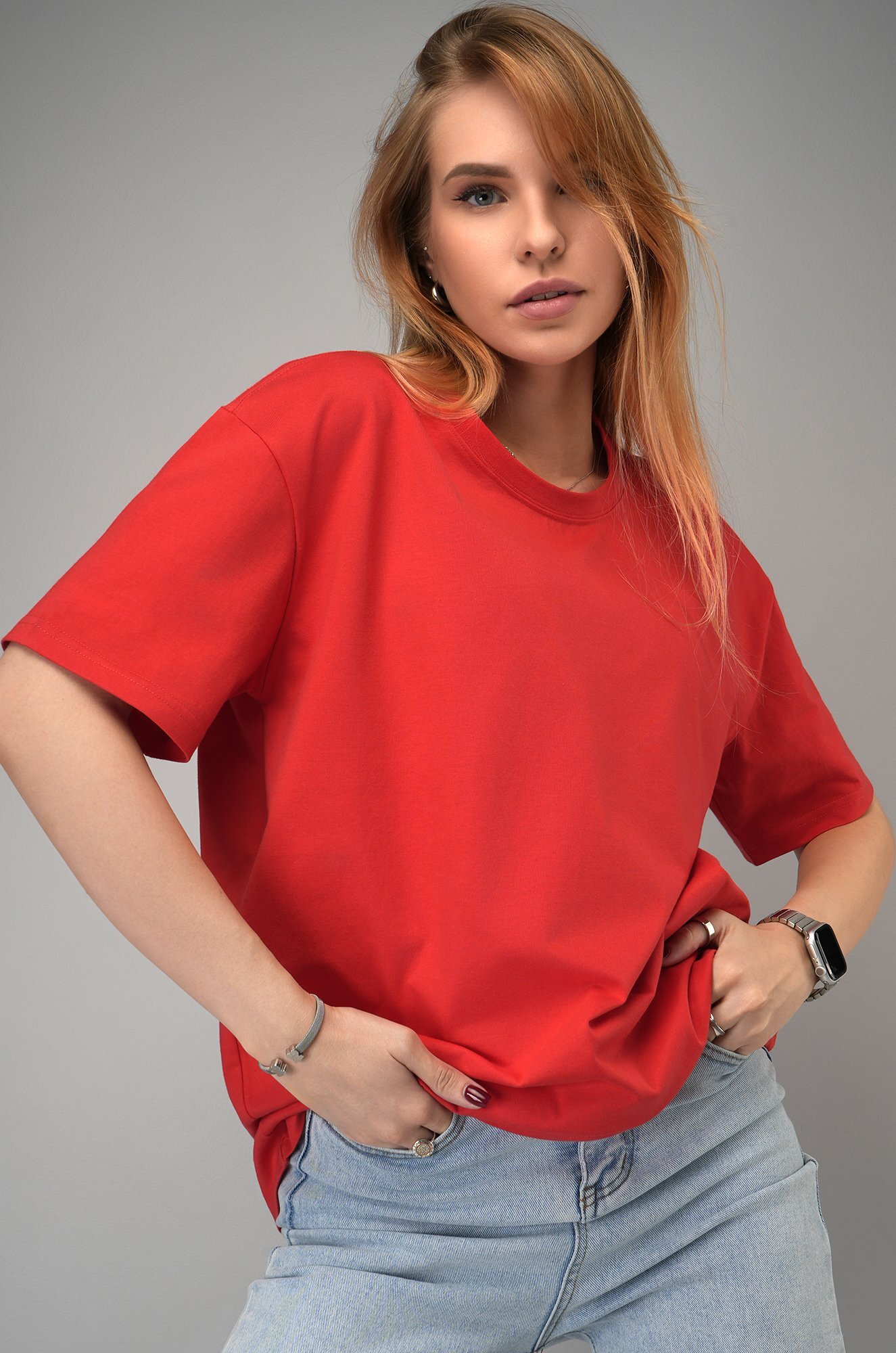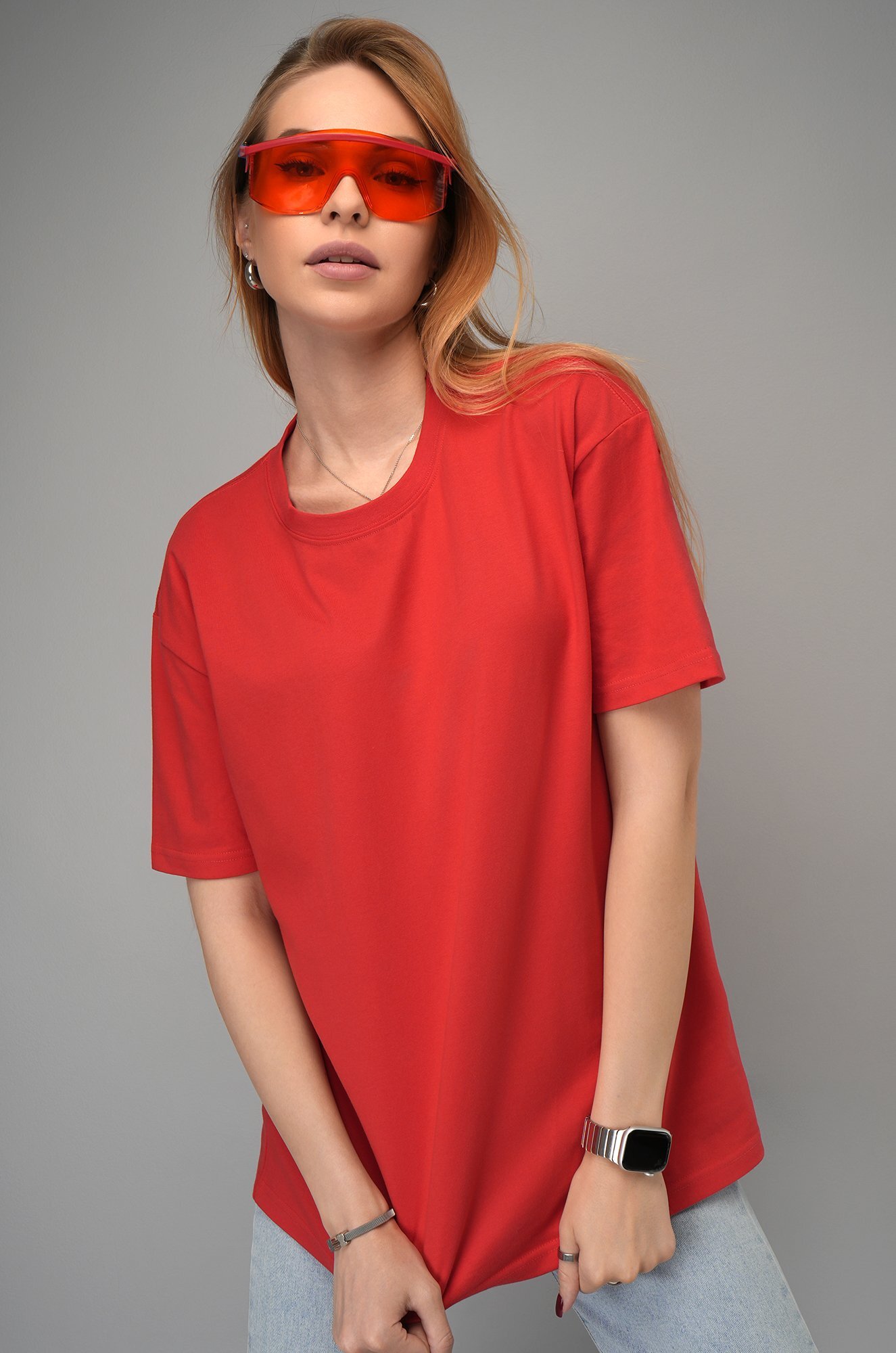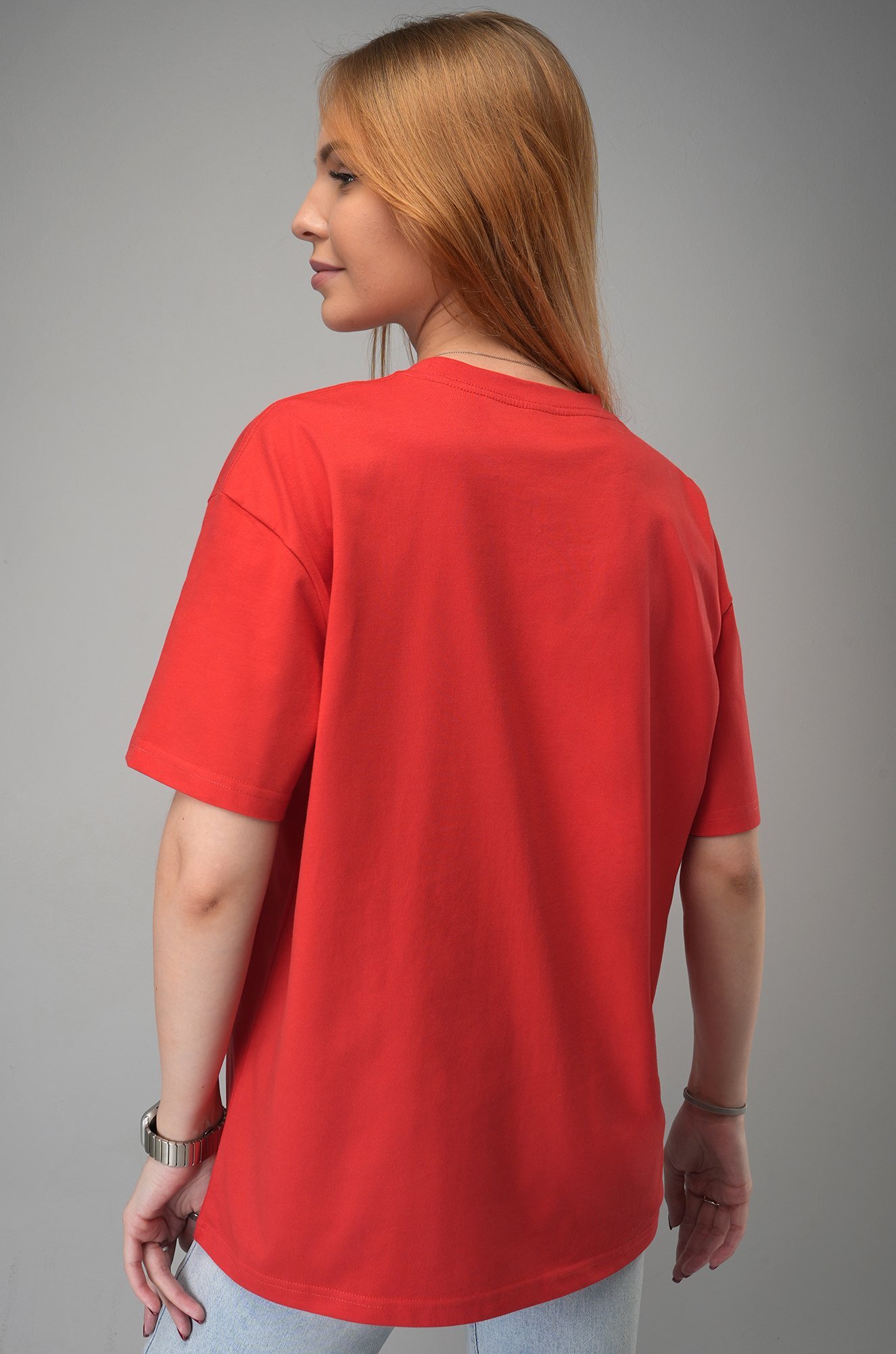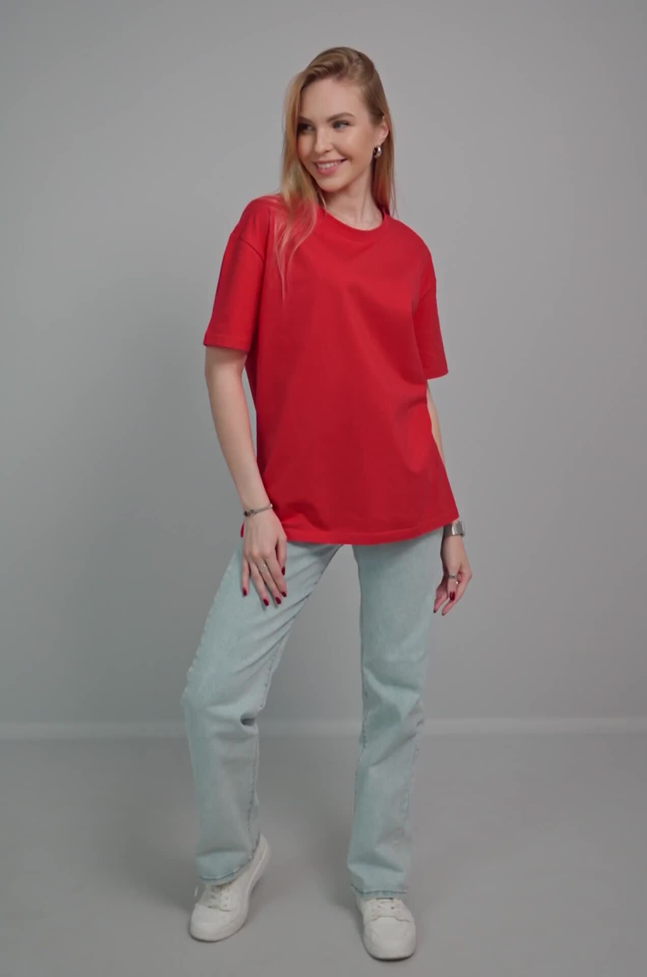 Свободная и такая освежающая! Красная женская футболка точно знает, как сделать день ярче. Плотный хлопок, мягкий трикотаж и расслабленный оверсайз создают безупречный союз для лета и не только.