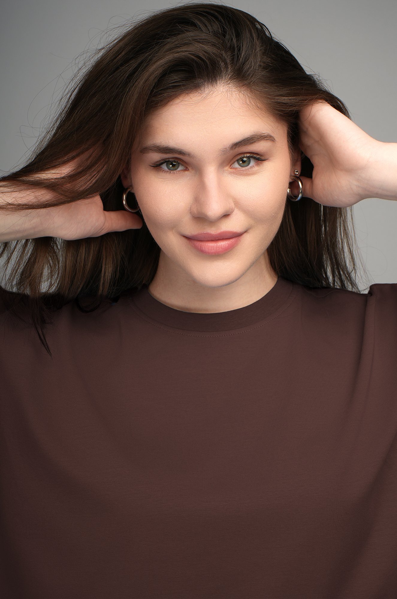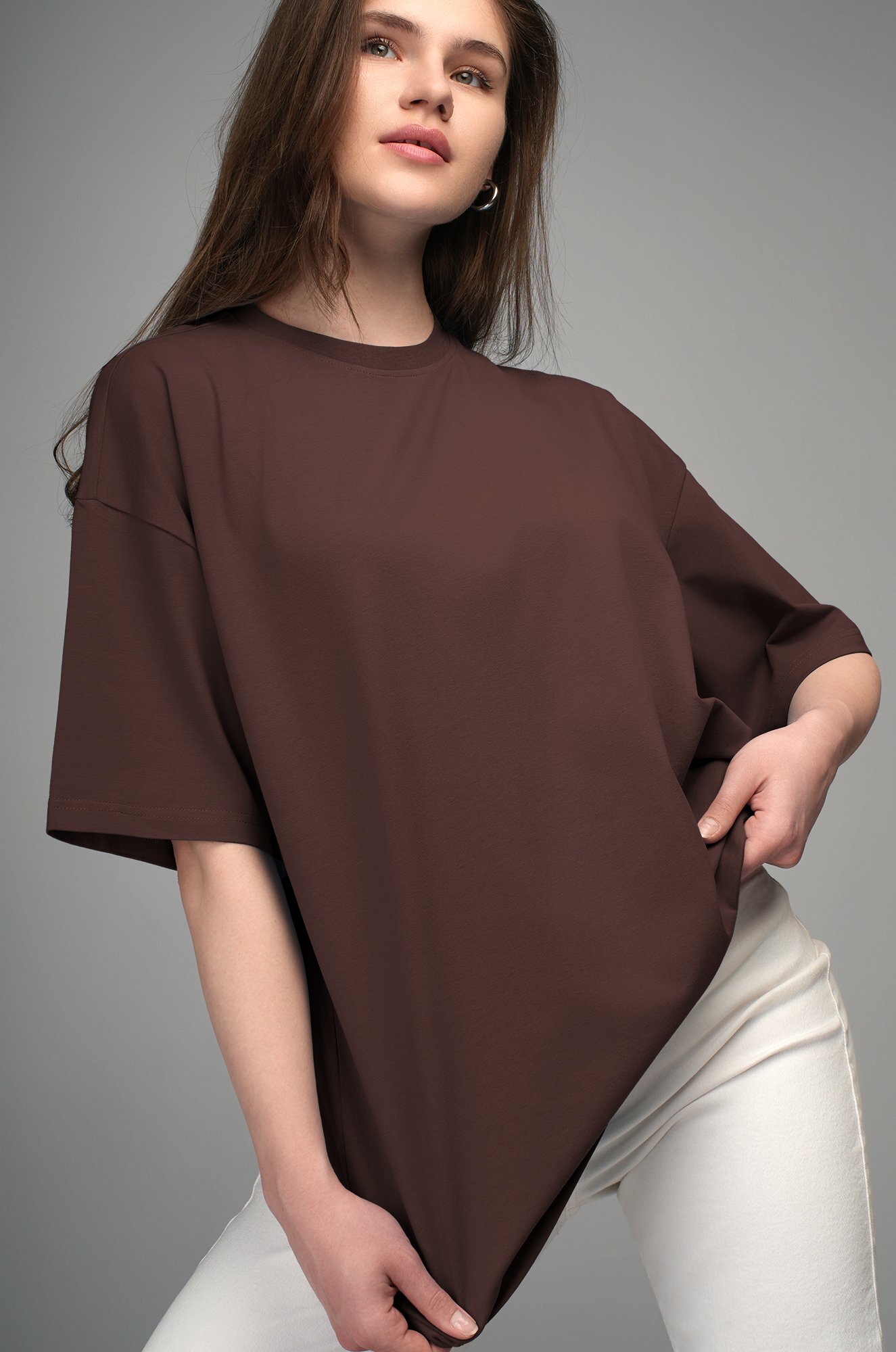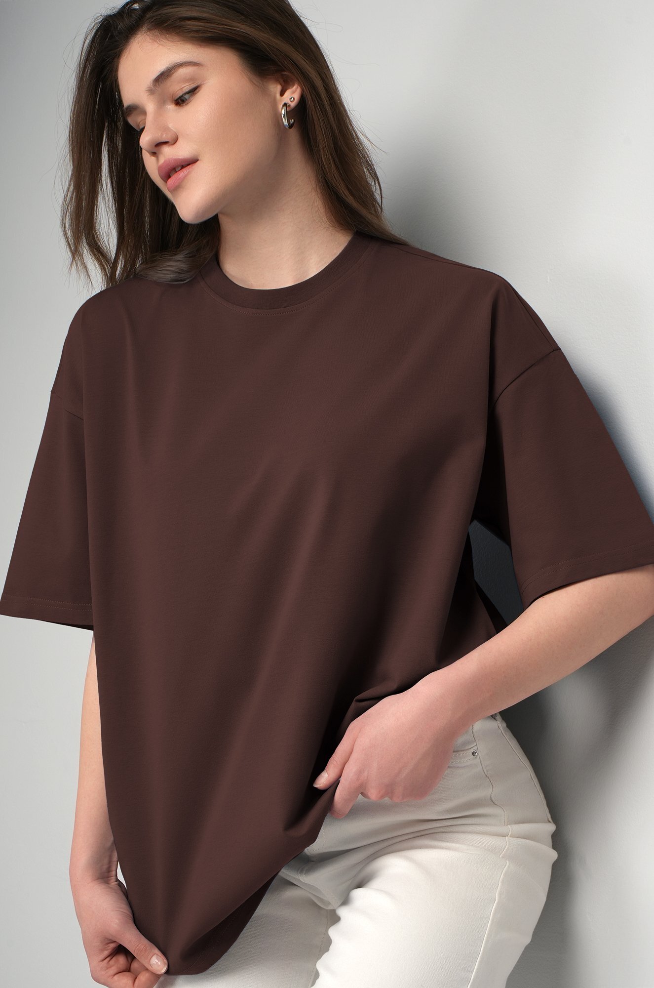 Однотонная женская футболка оверсайз с коротким рукавом выполнена из трикотажа с высоким содержанием хлопка. Стильная футболка шоколадного цвета легко сочетается с любым низом. Трендовый крой оверсайз уже не один сезон находится на пике популярности, свободная футболка – это современная база.