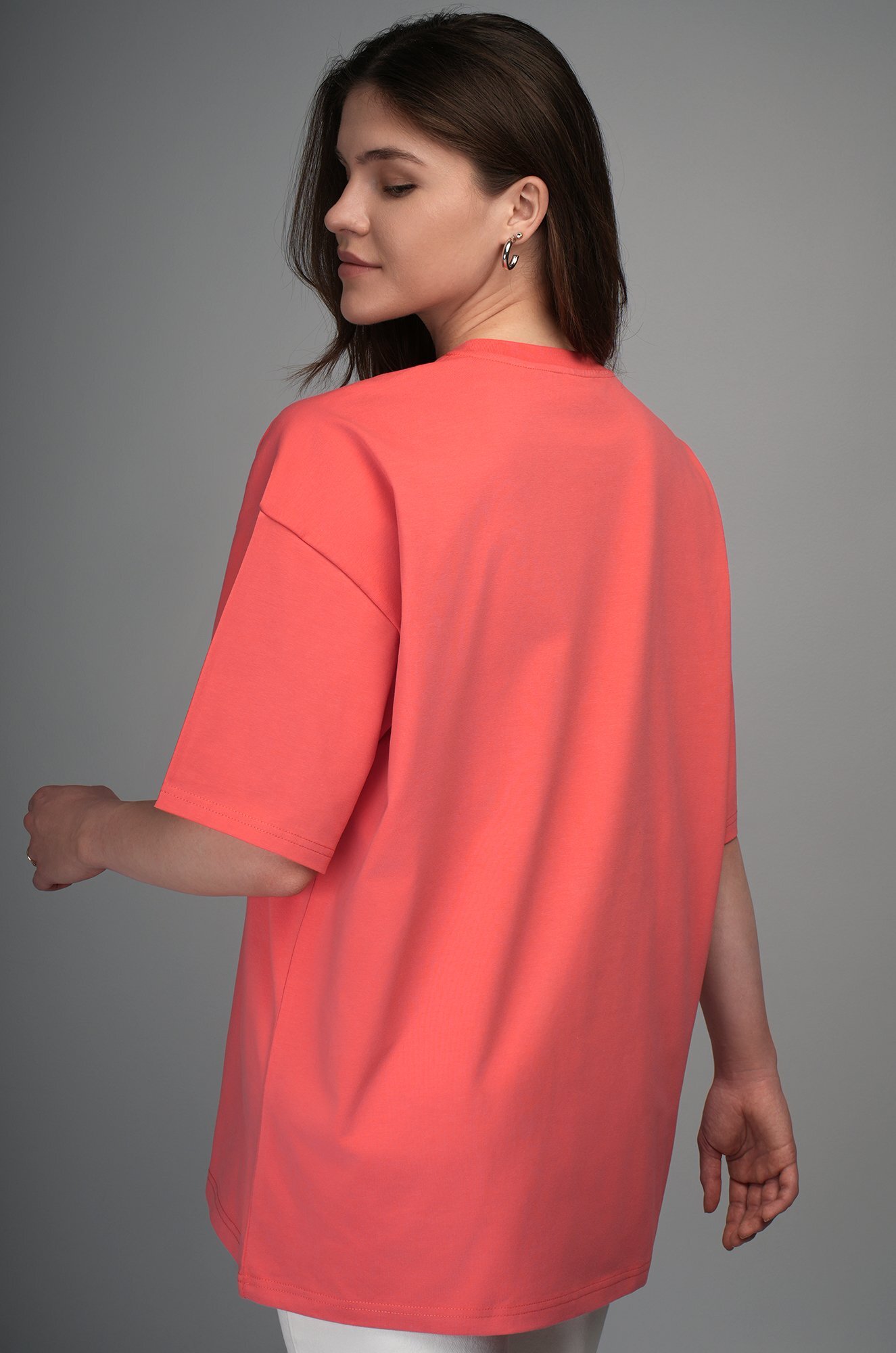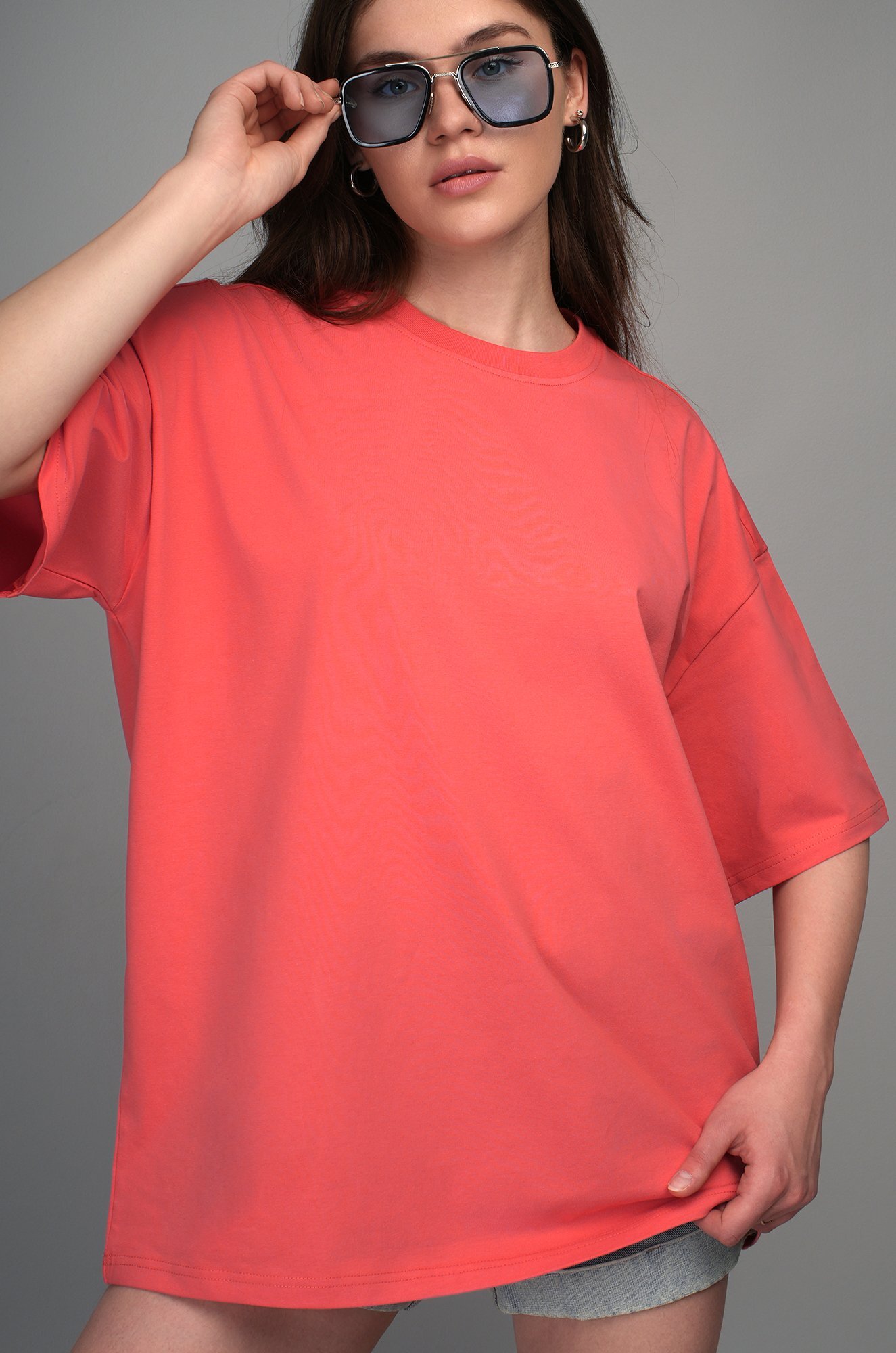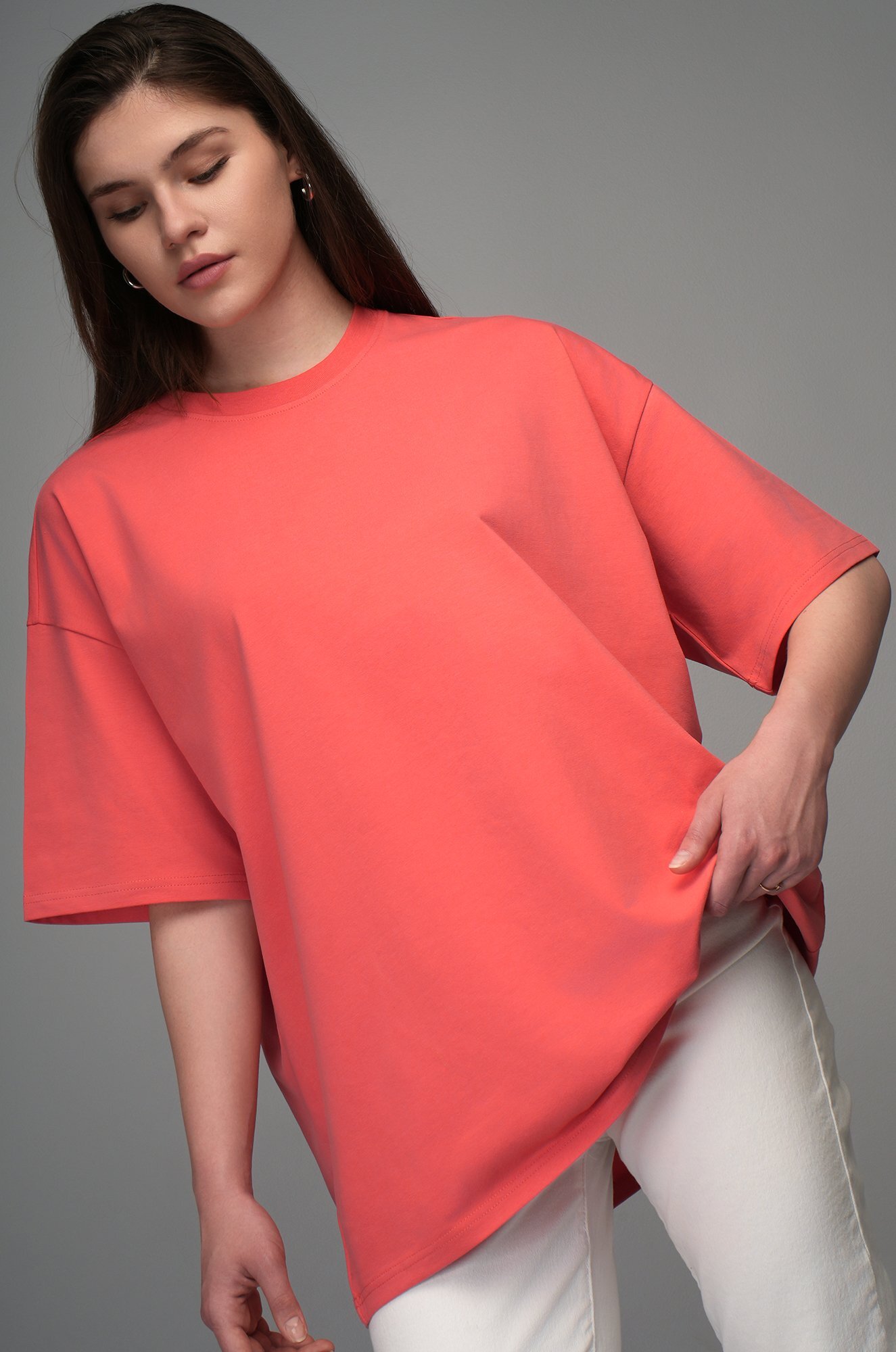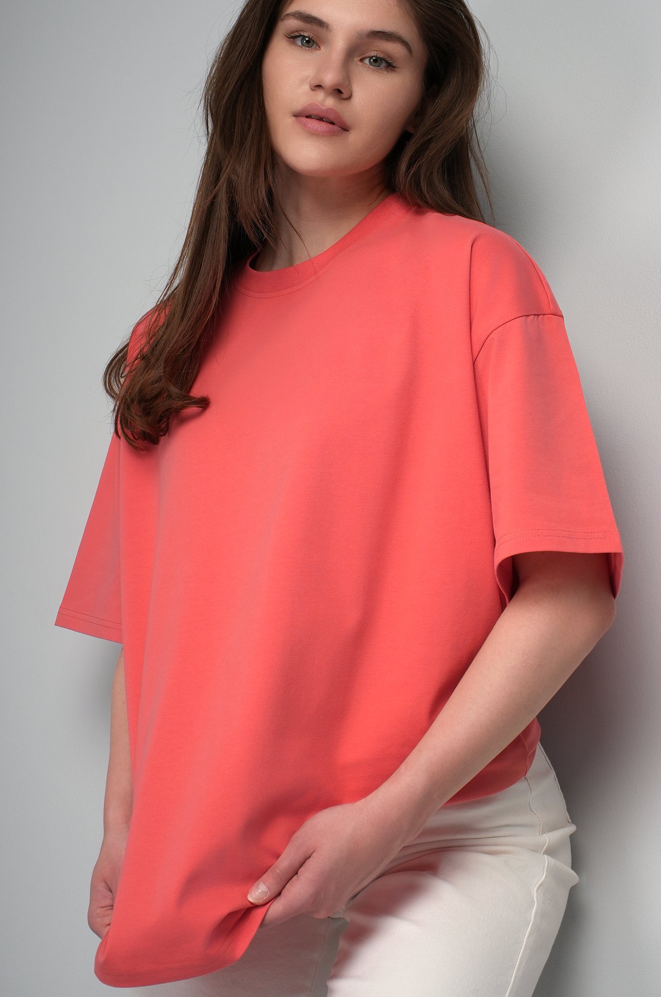 Однотонная женская футболка оверсайз с коротким рукавом выполнена из трикотажа с высоким содержанием хлопка. Стильная футболка кораллового цвета легко сочетается с любым низом. Трендовый крой оверсайз уже не один сезон находится на пике популярности, свободная футболка – это современная база.