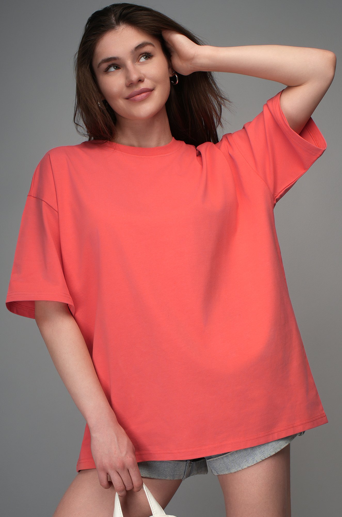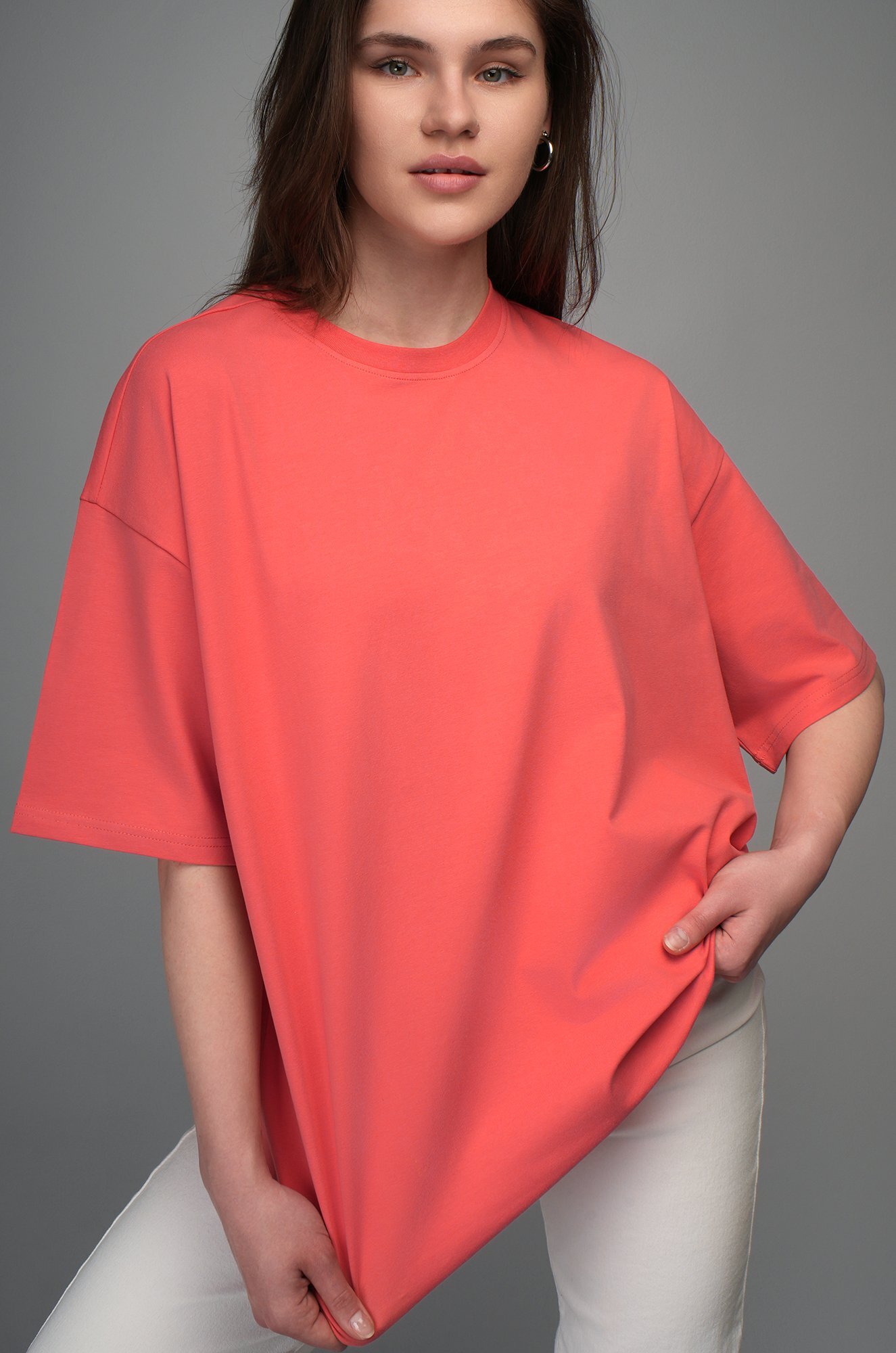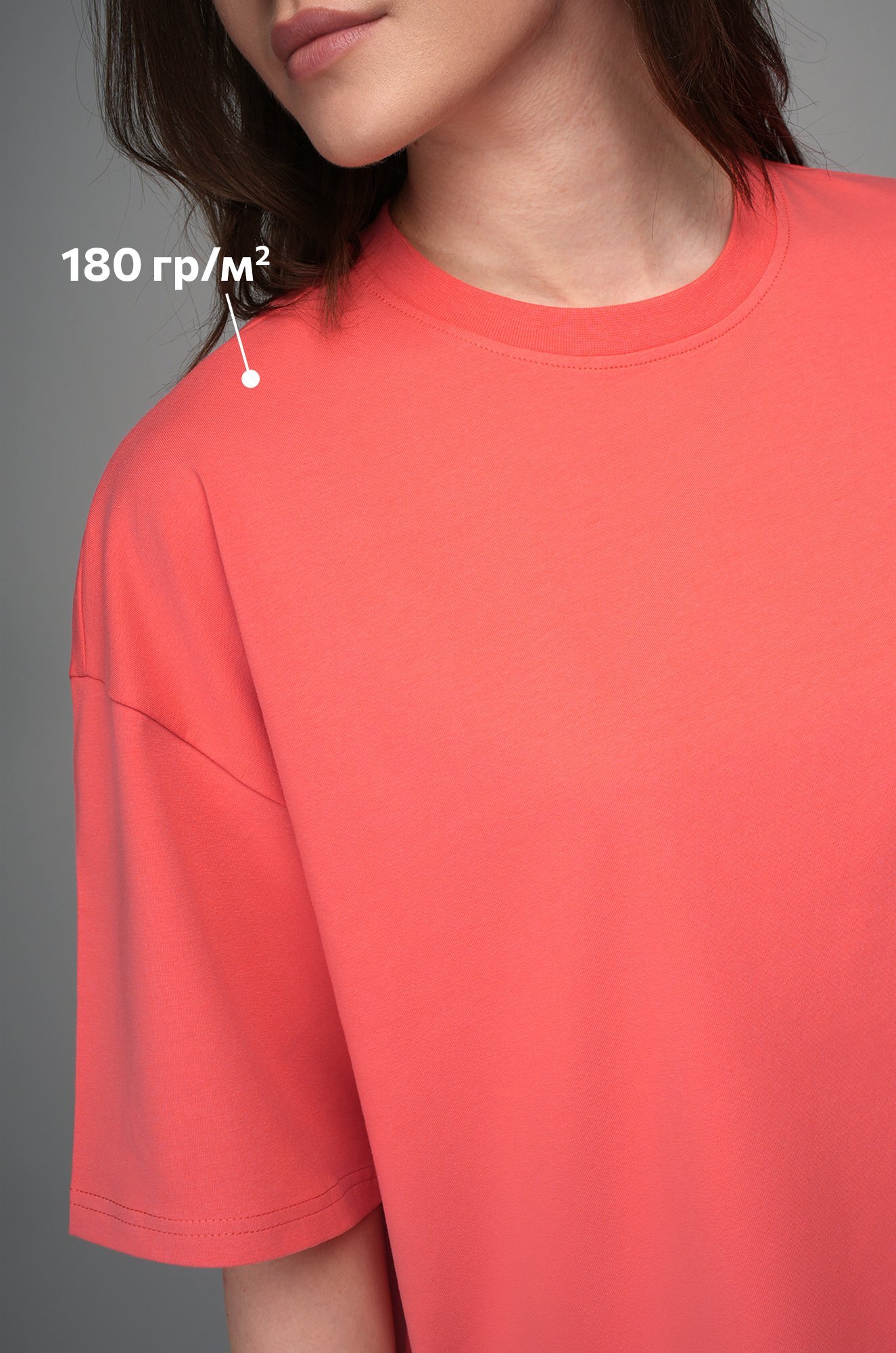 Однотонная женская футболка оверсайз с коротким рукавом выполнена из трикотажа с высоким содержанием хлопка. Стильная футболка кораллового цвета легко сочетается с любым низом. Трендовый крой оверсайз уже не один сезон находится на пике популярности, свободная футболка – это современная база.