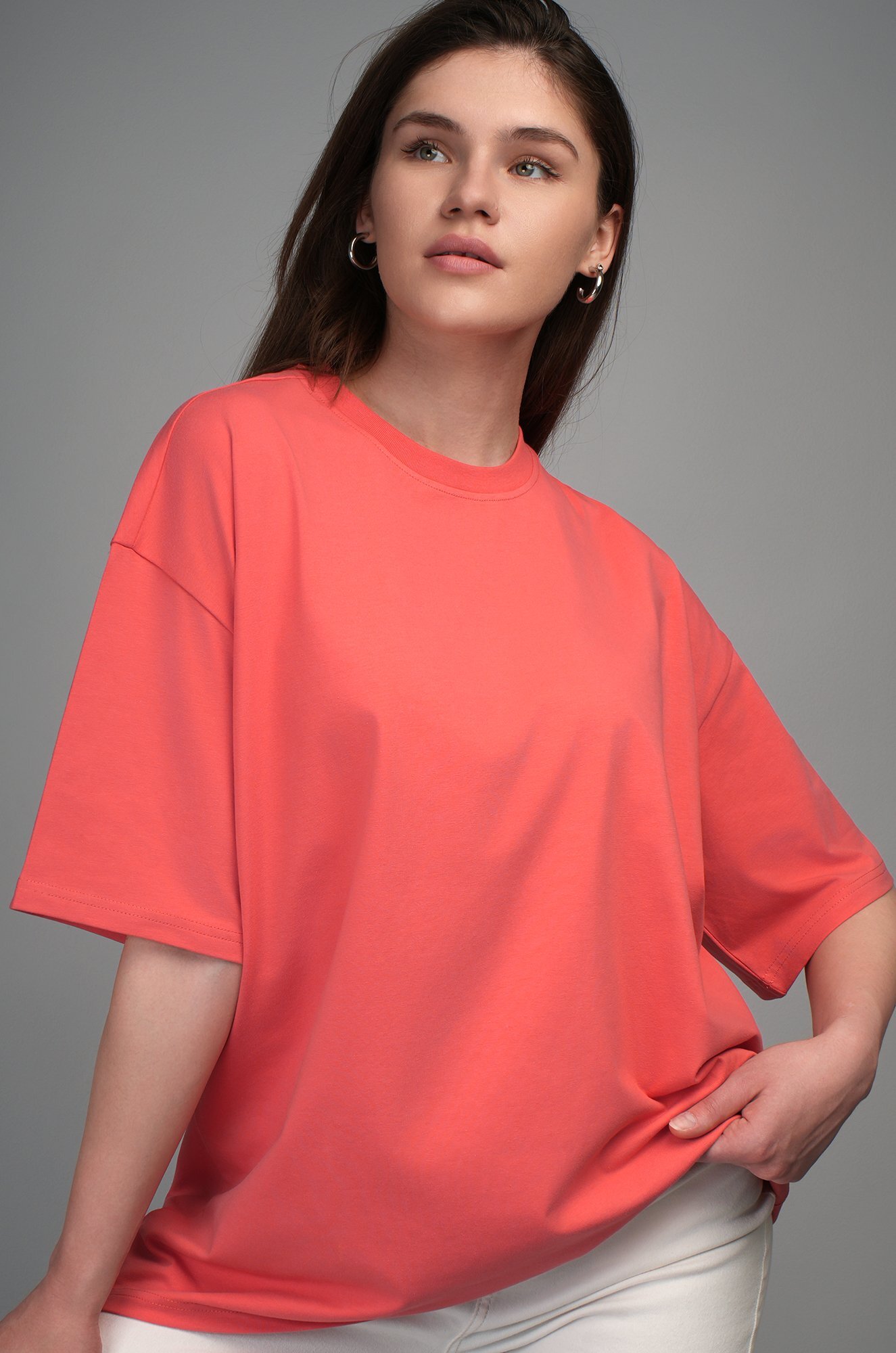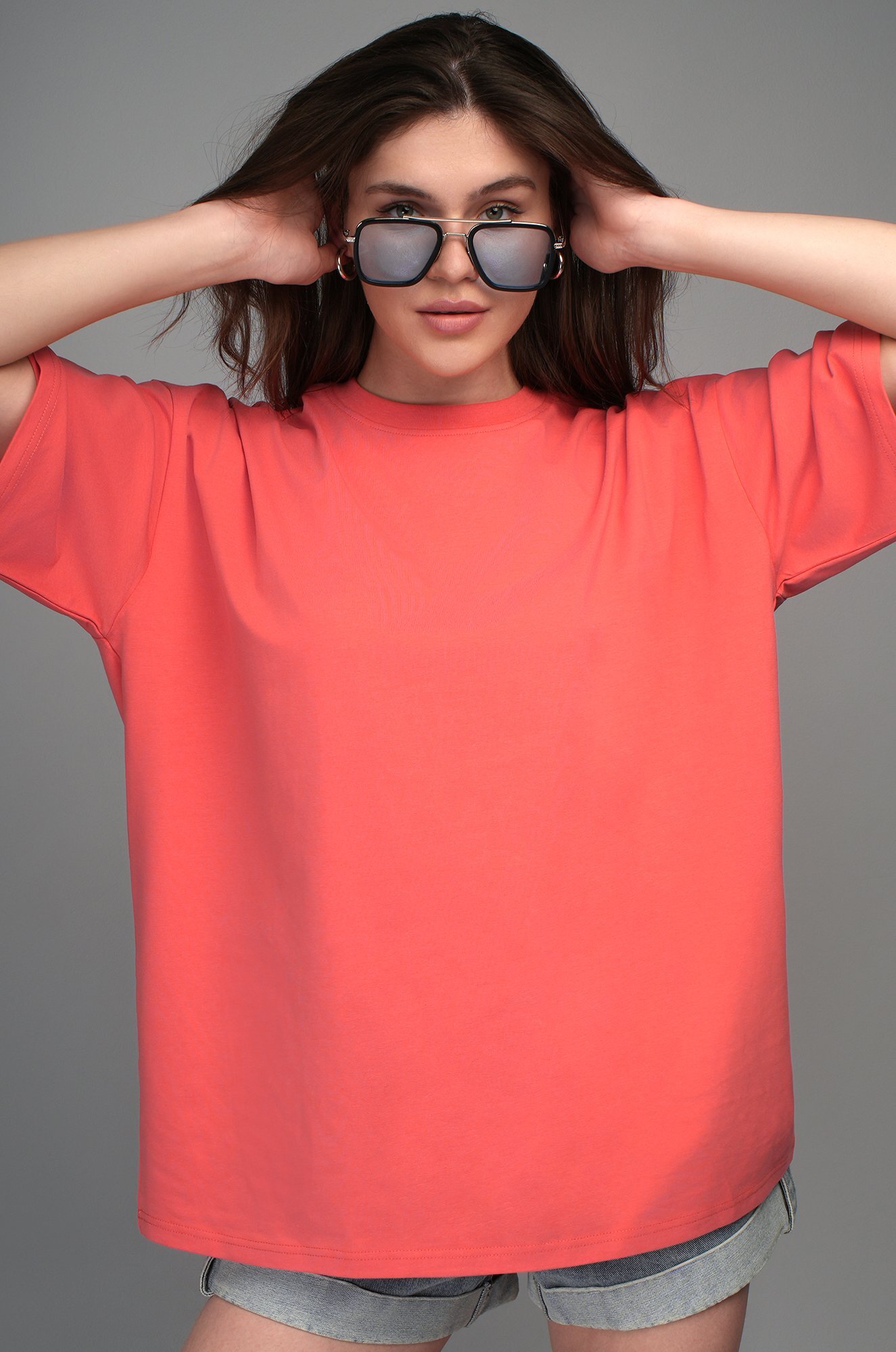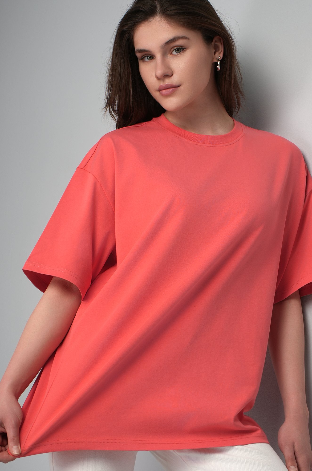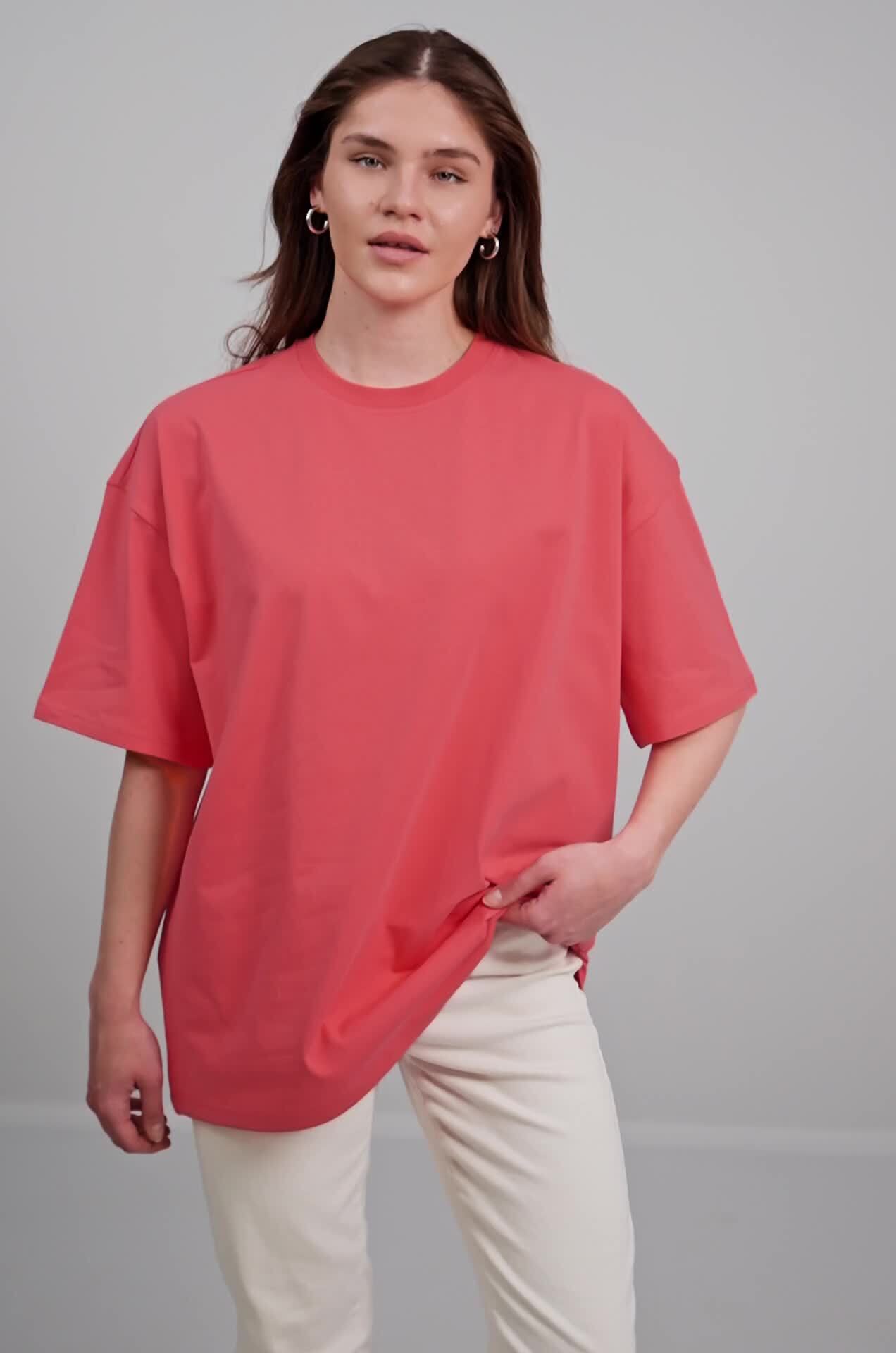 Однотонная женская футболка оверсайз с коротким рукавом выполнена из трикотажа с высоким содержанием хлопка. Стильная футболка кораллового цвета легко сочетается с любым низом. Трендовый крой оверсайз уже не один сезон находится на пике популярности, свободная футболка – это современная база.