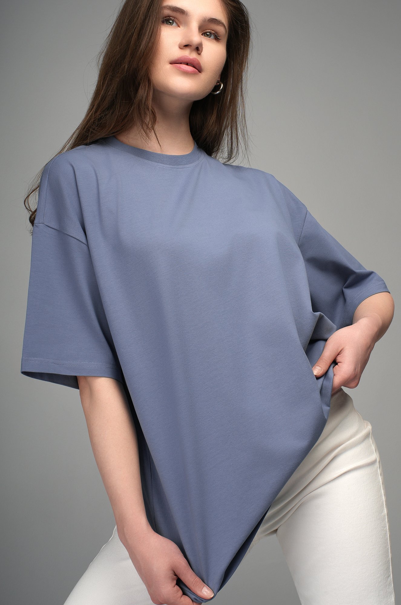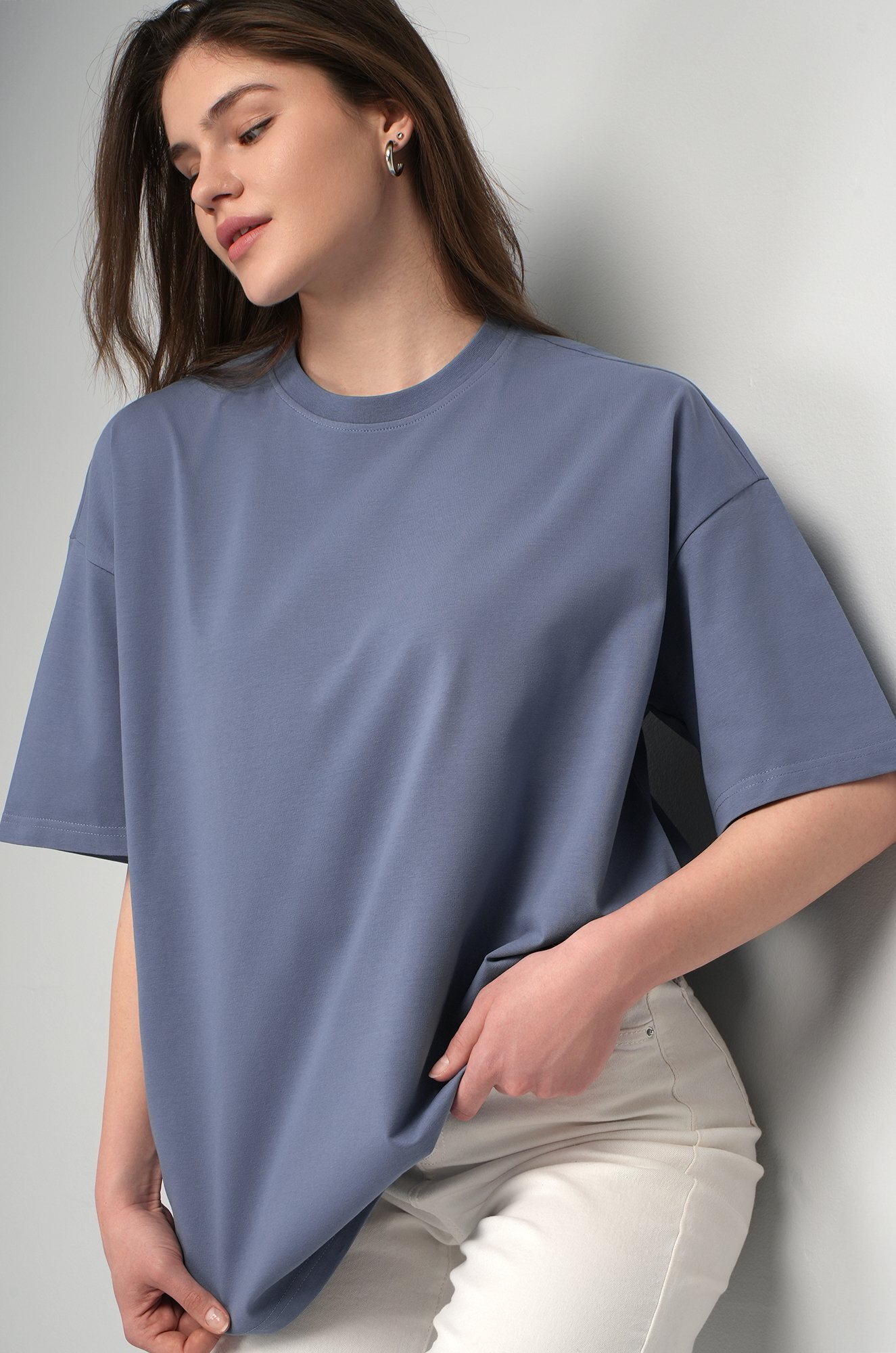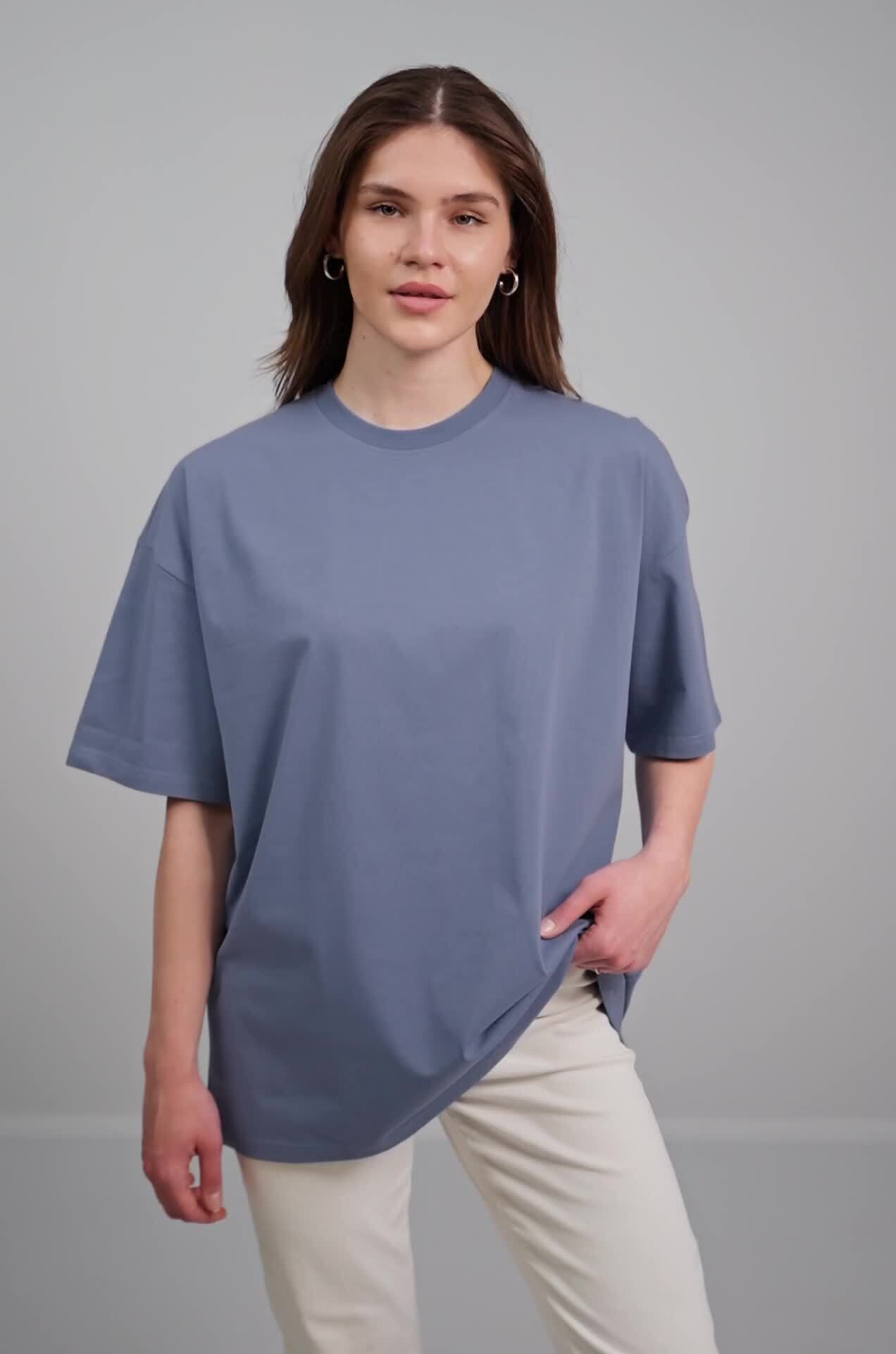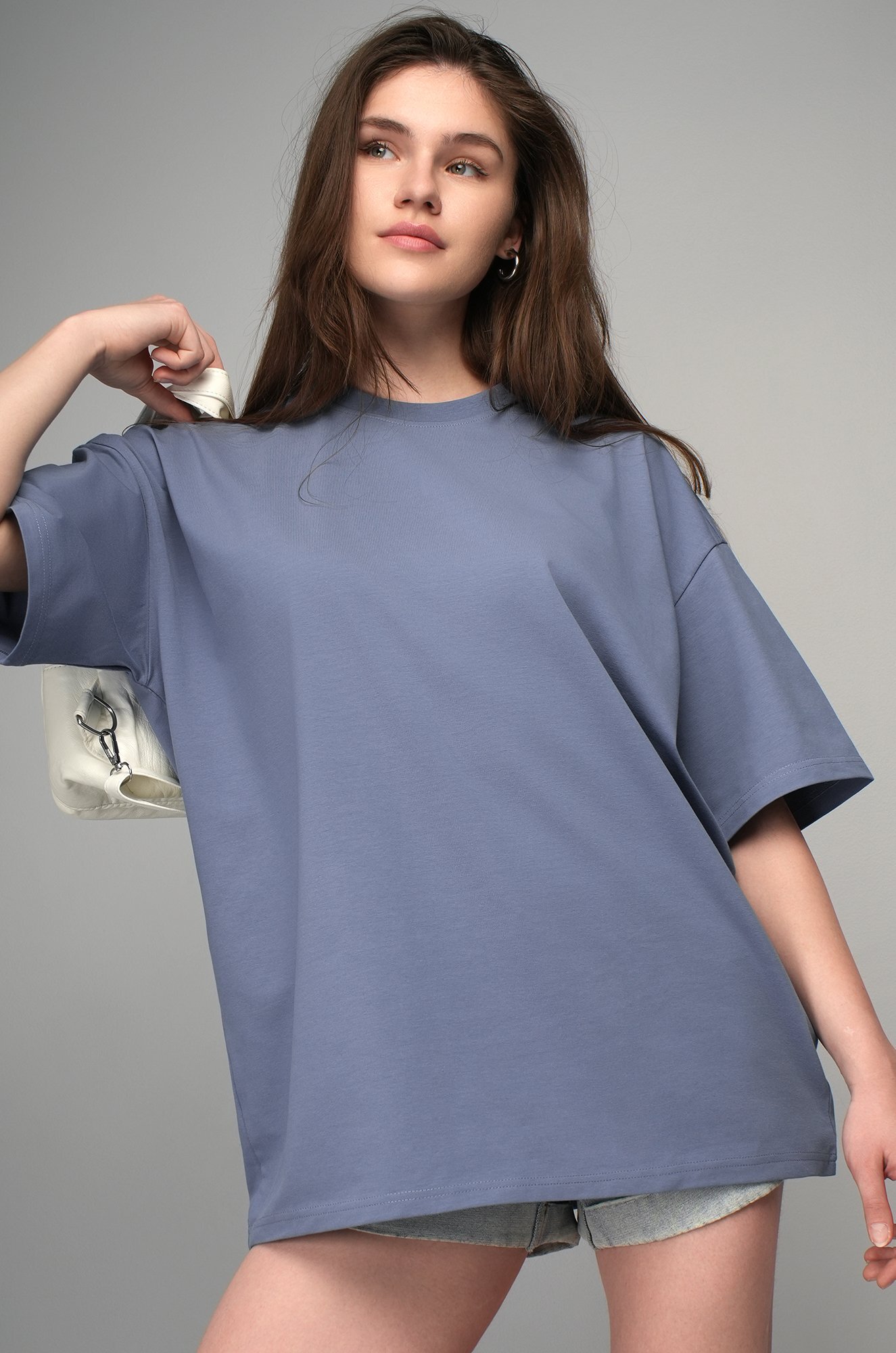 Однотонная женская футболка оверсайз с коротким рукавом выполнена из трикотажа с высоким содержанием хлопка. Стильная футболка серо-голубого цвета легко сочетается с любым низом. Трендовый крой оверсайз уже не один сезон находится на пике популярности, свободная футболка – это современная база.
