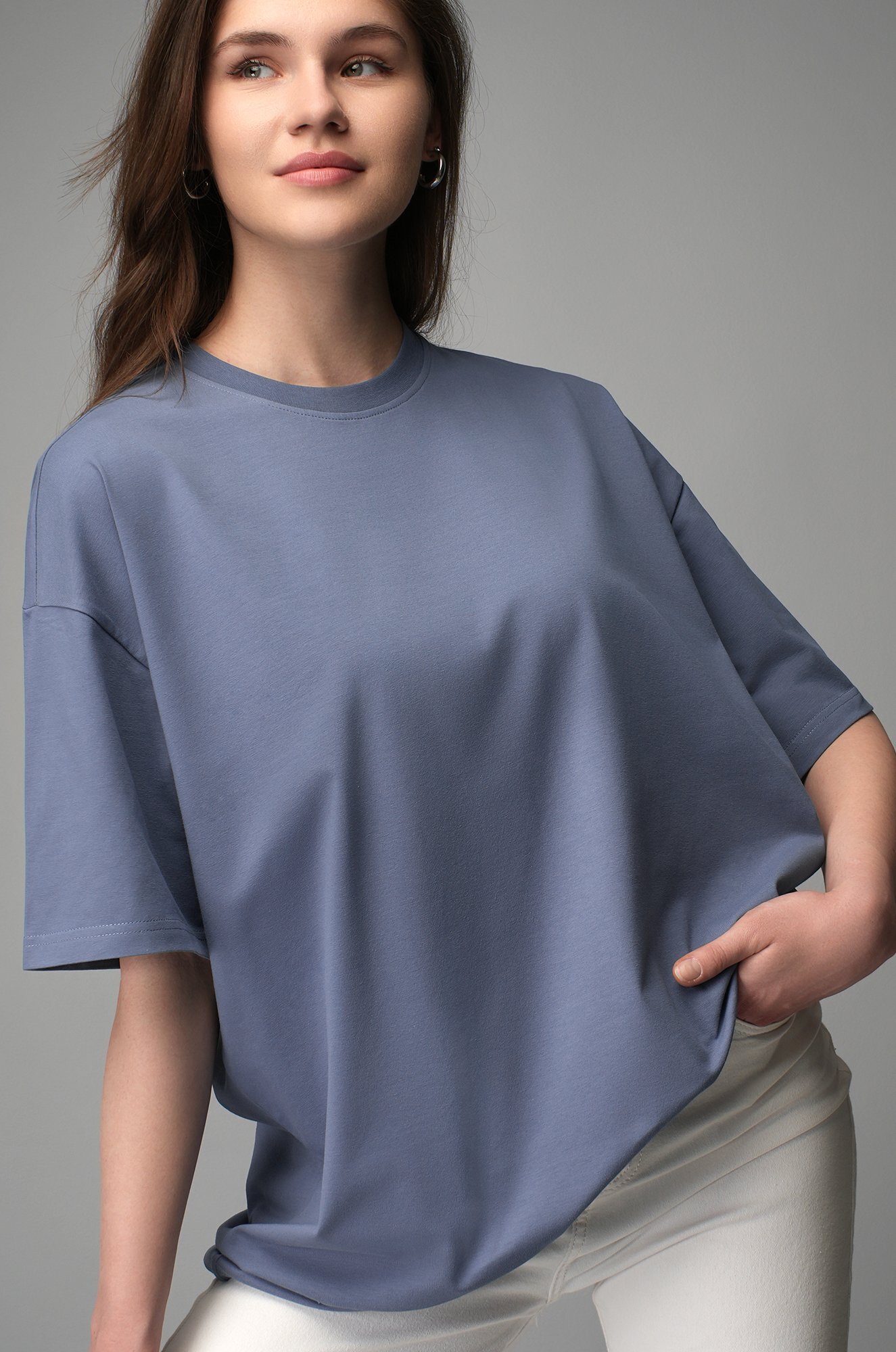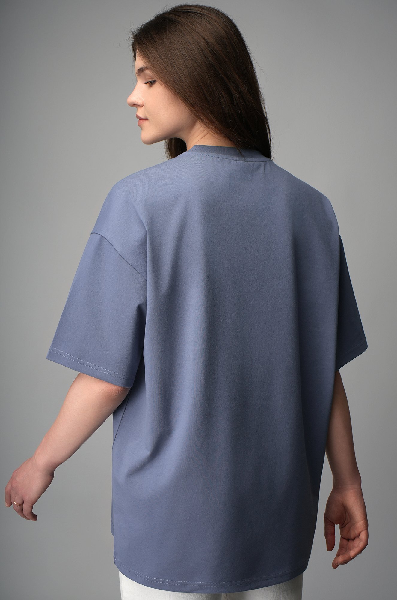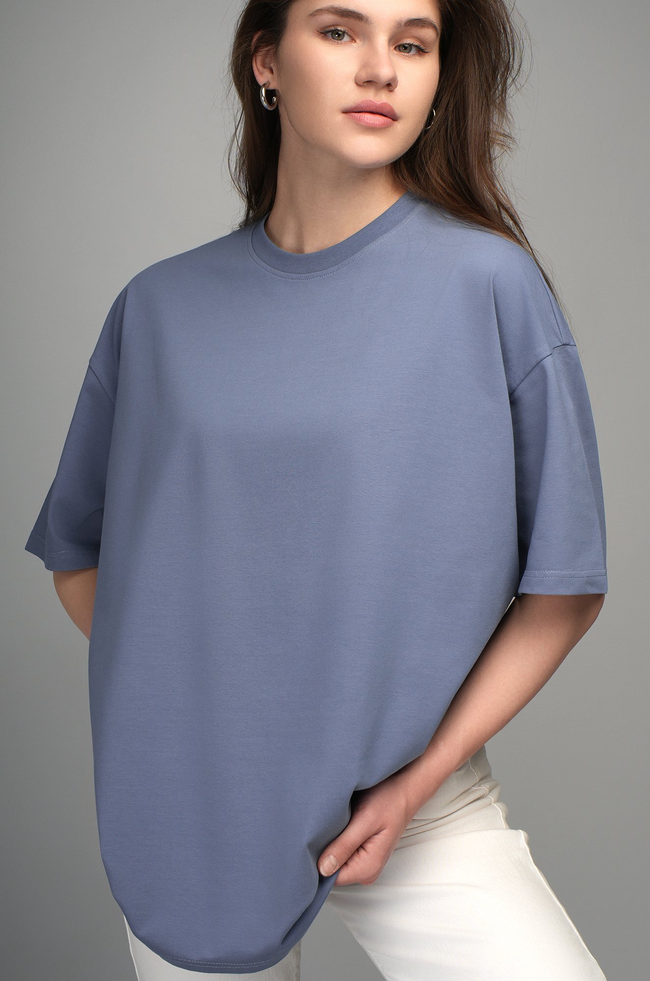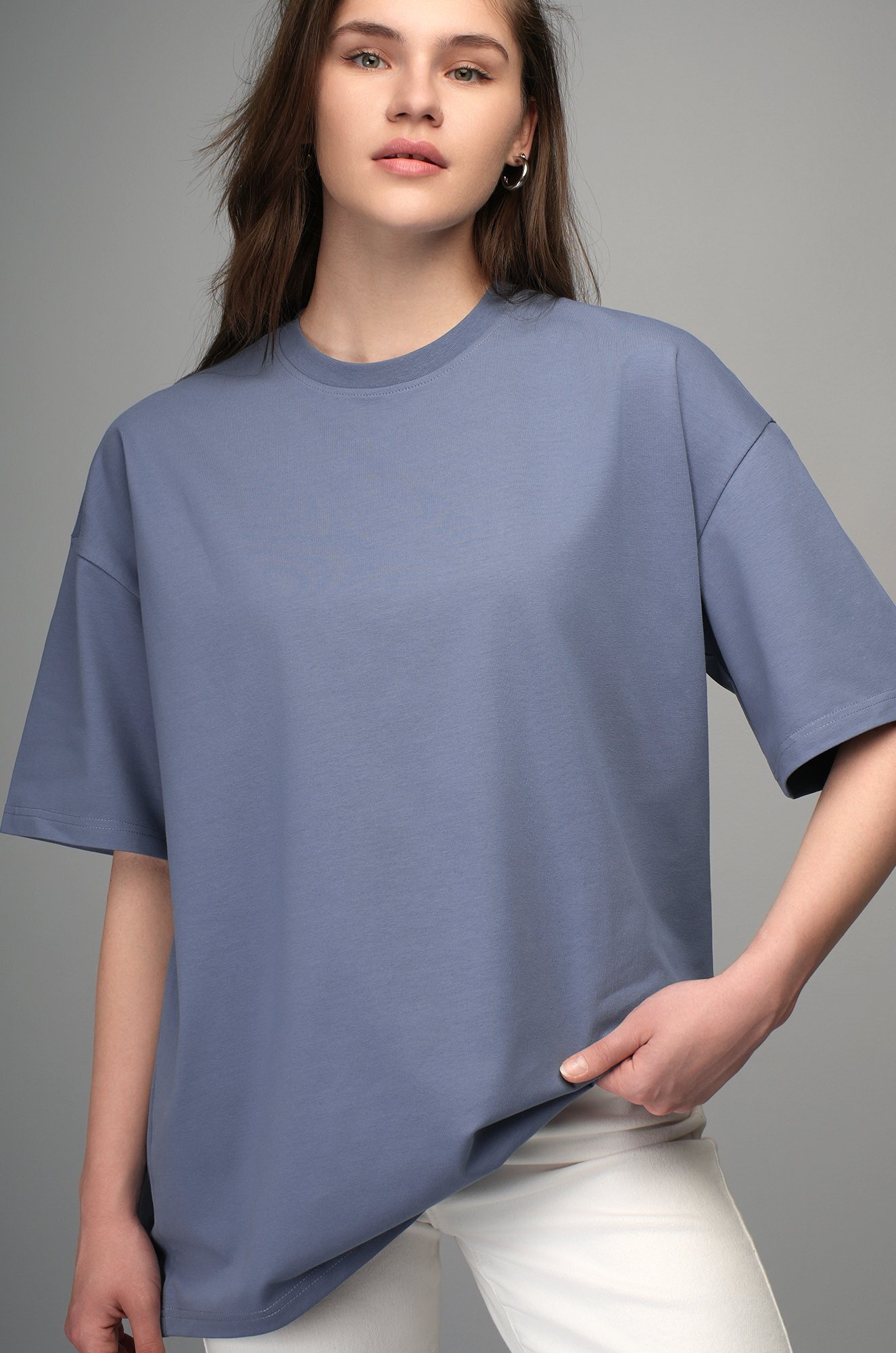 Однотонная женская футболка оверсайз с коротким рукавом выполнена из трикотажа с высоким содержанием хлопка. Стильная футболка серо-голубого цвета легко сочетается с любым низом. Трендовый крой оверсайз уже не один сезон находится на пике популярности, свободная футболка – это современная база.