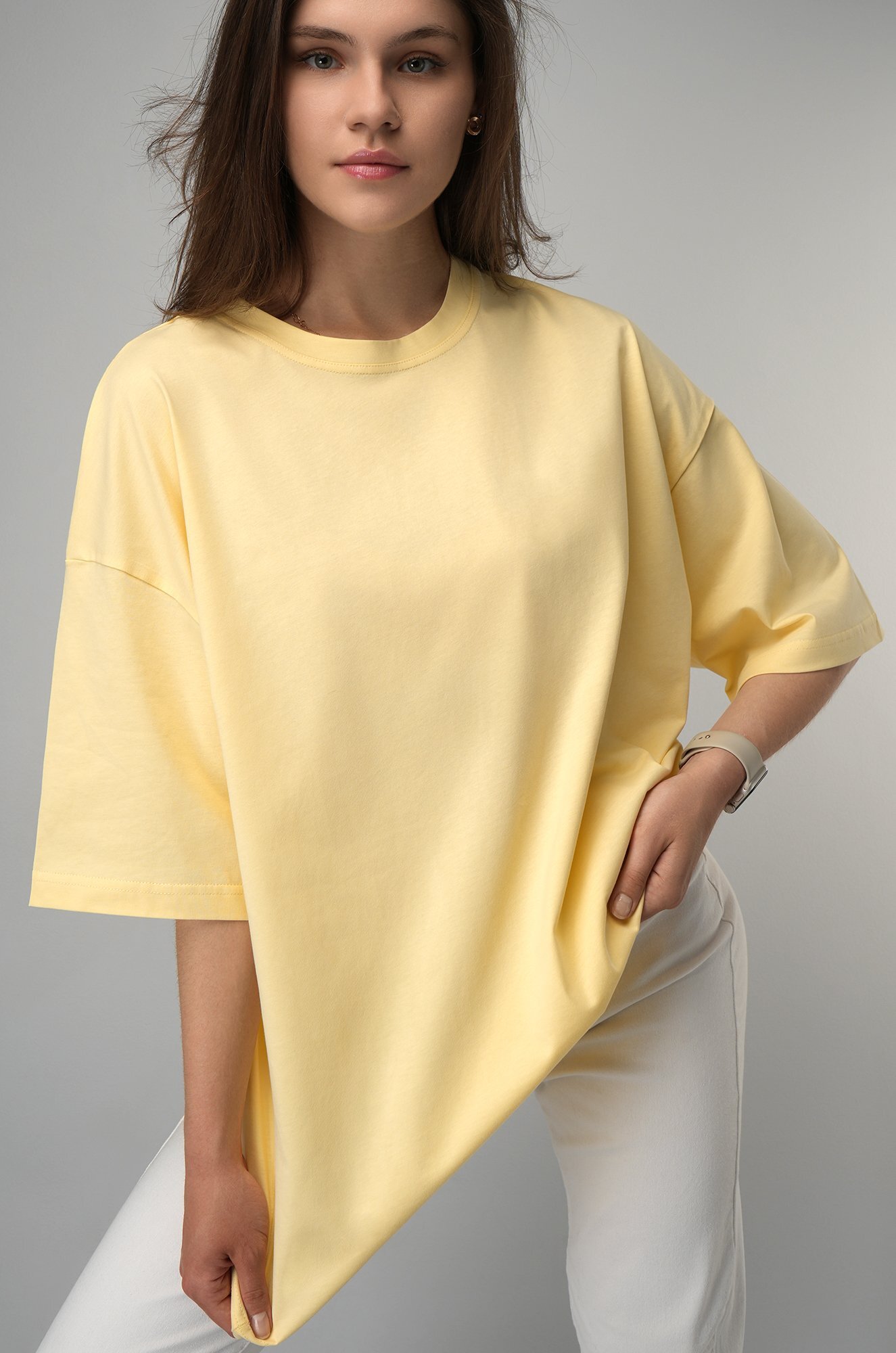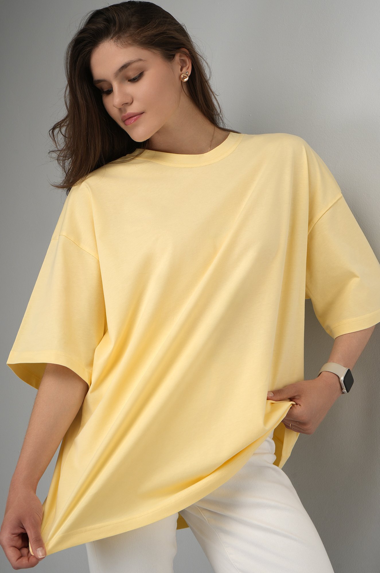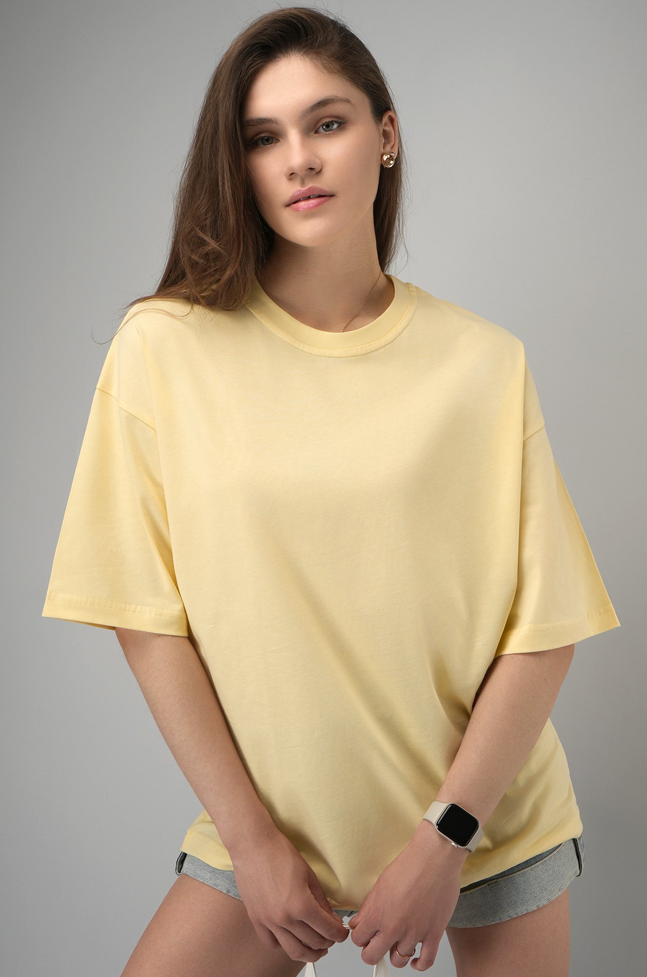 Трикотажная светло-желтая футболка для женщин отлично подойдёт для образов в уличном стиле.