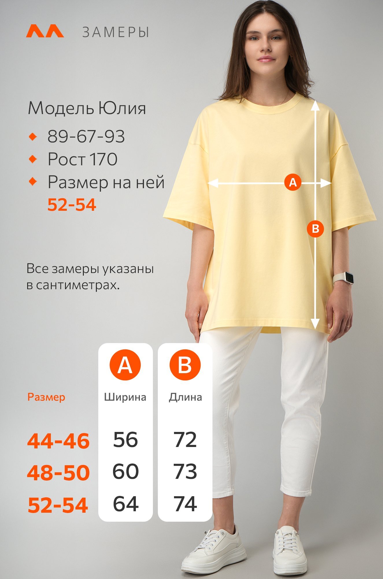 Модель Юлия 170 см. Параметры: 89-67-93. На ней футболка 52-54 размера.