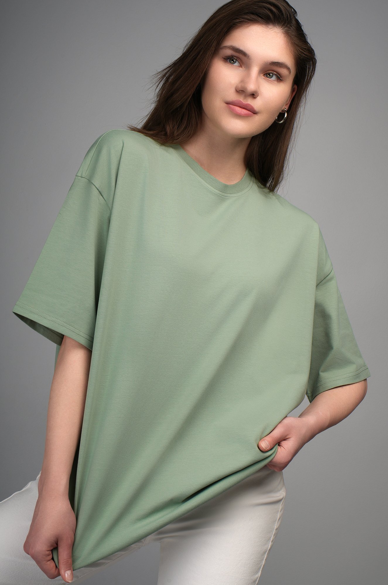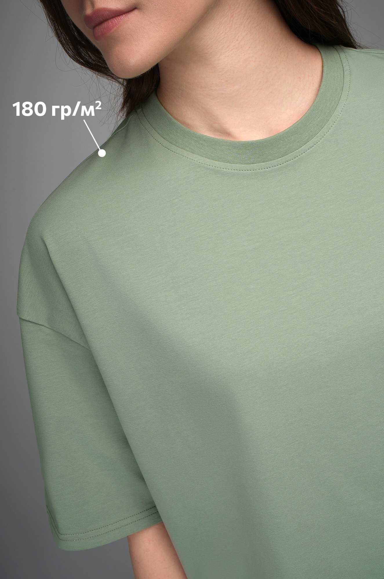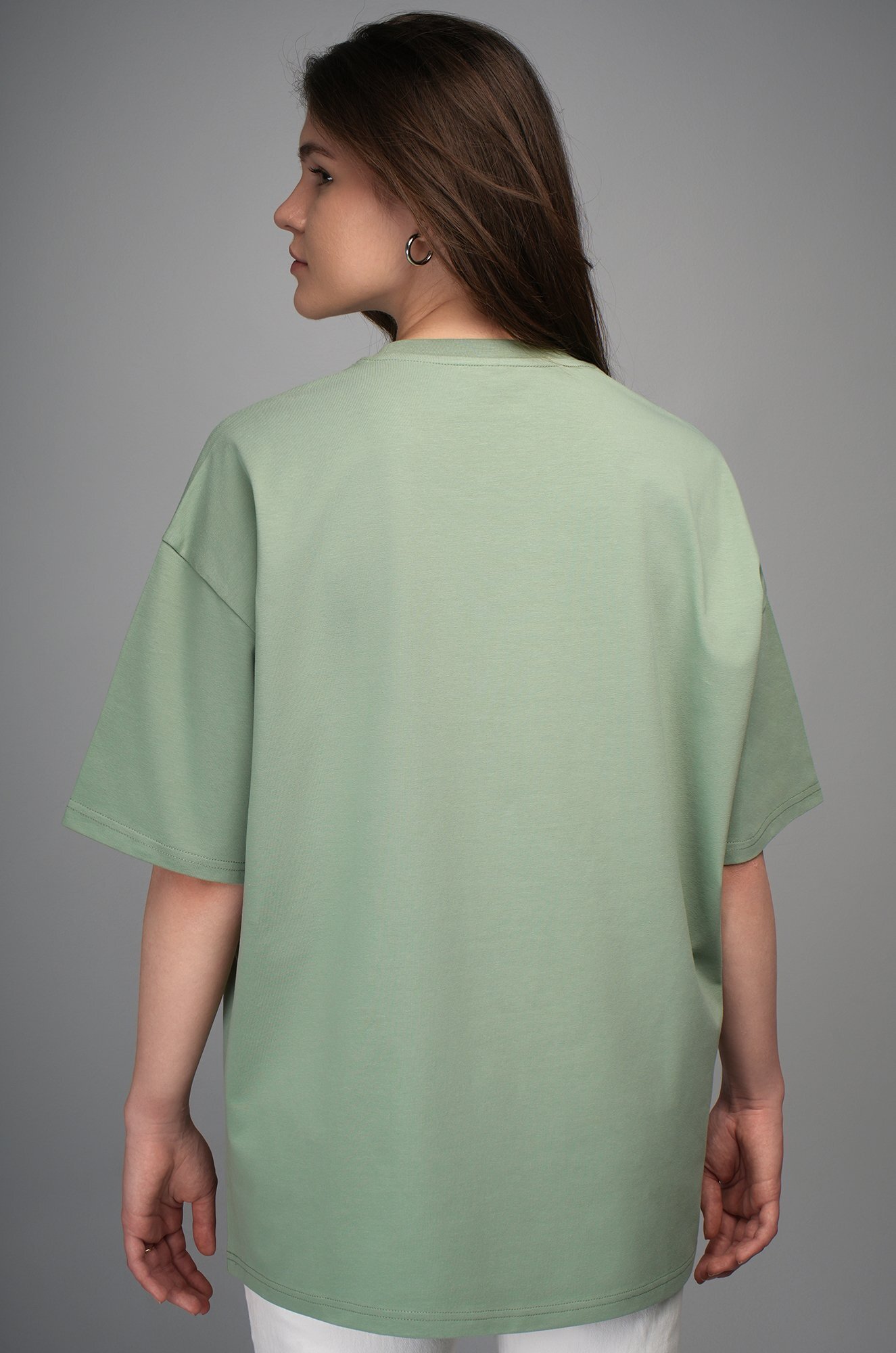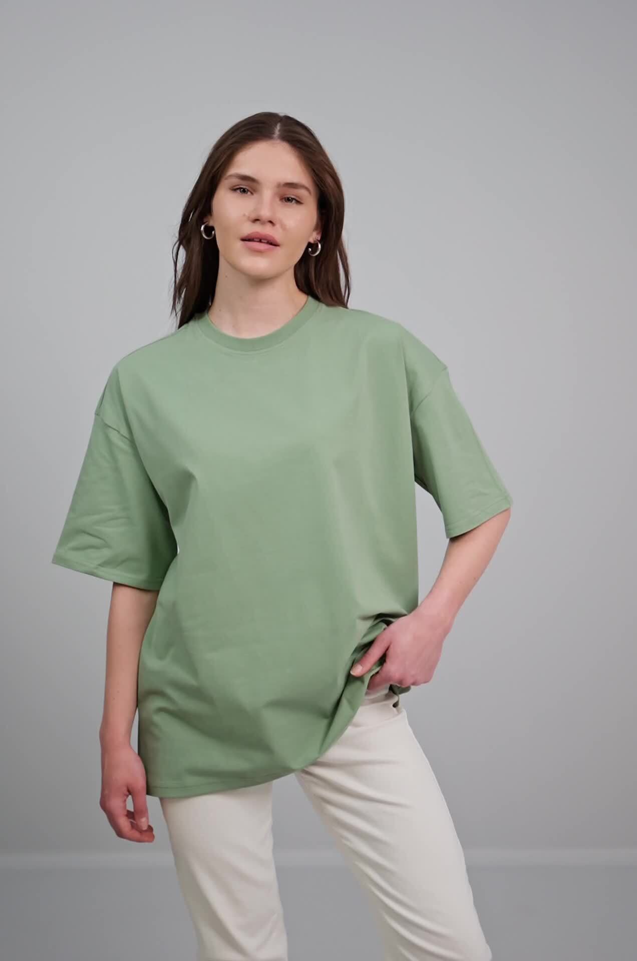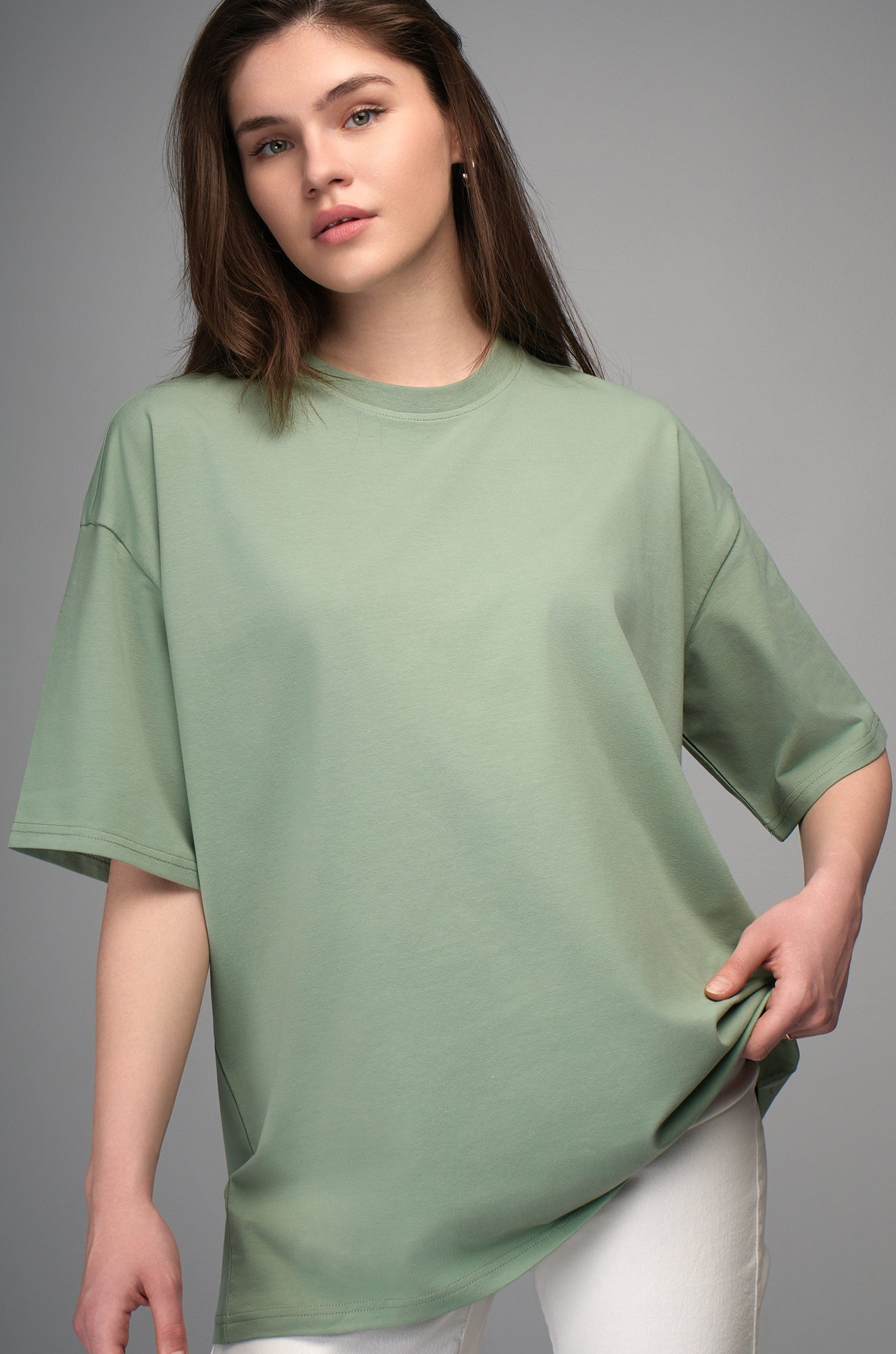 Однотонная женская футболка оверсайз с коротким рукавом выполнена из трикотажа с высоким содержанием хлопка. Стильная футболка светло-зеленого цвета легко сочетается с любым низом. Трендовый крой оверсайз уже не один сезон находится на пике популярности, свободная футболка – это современная база.