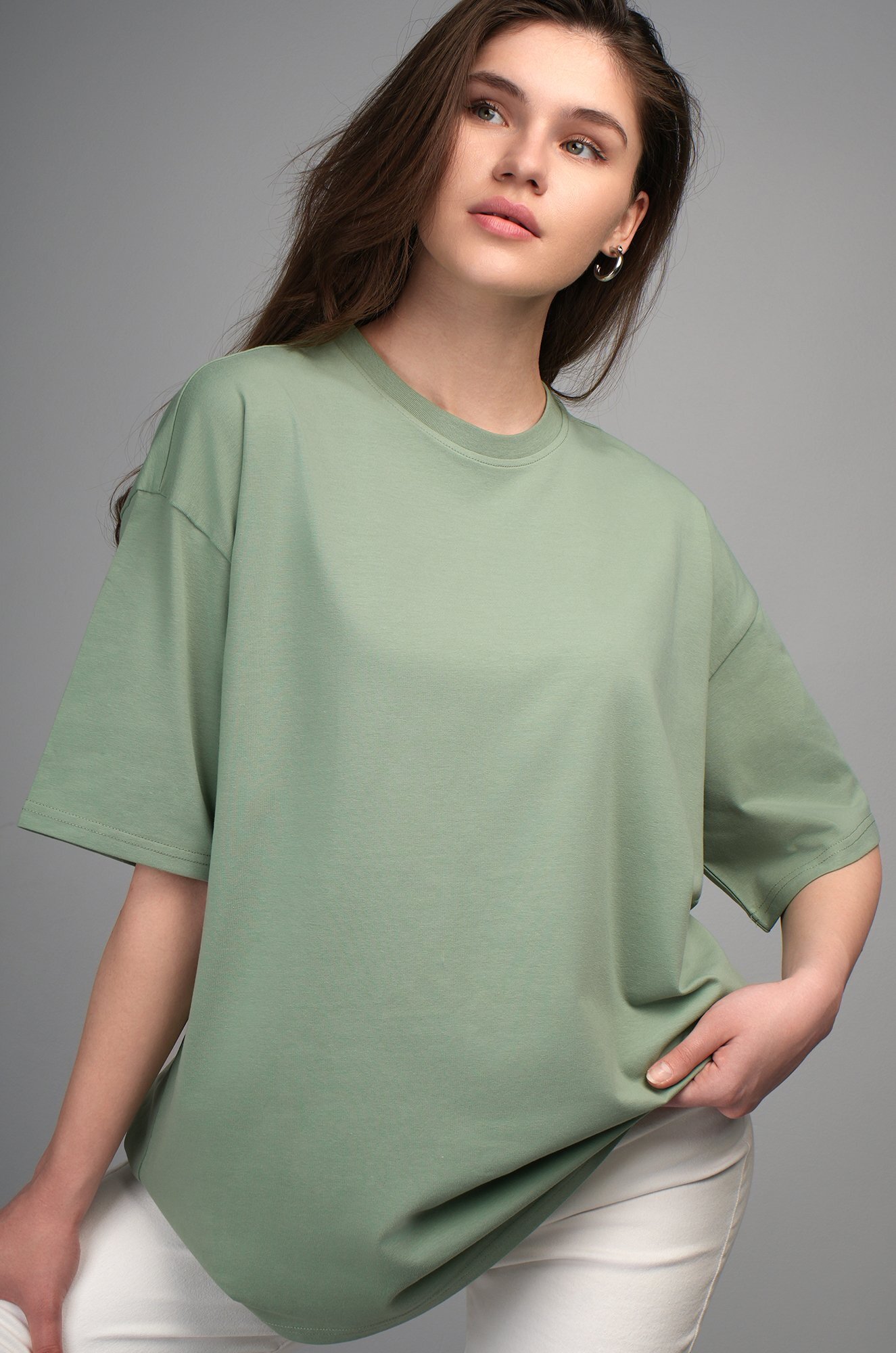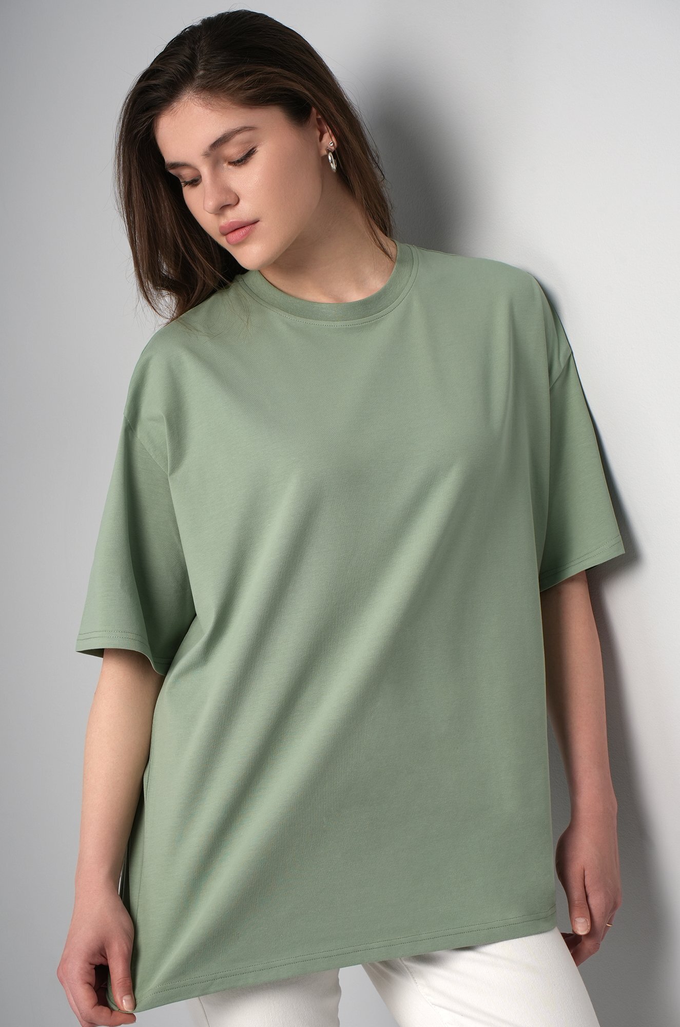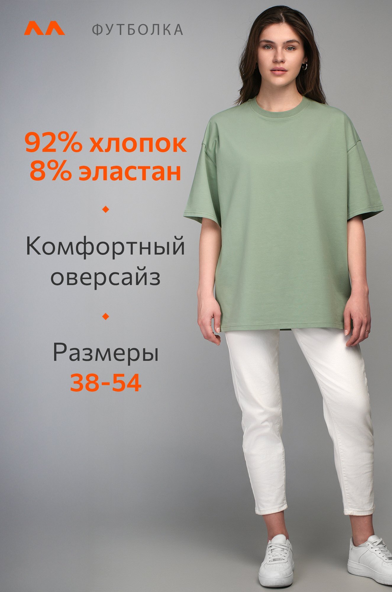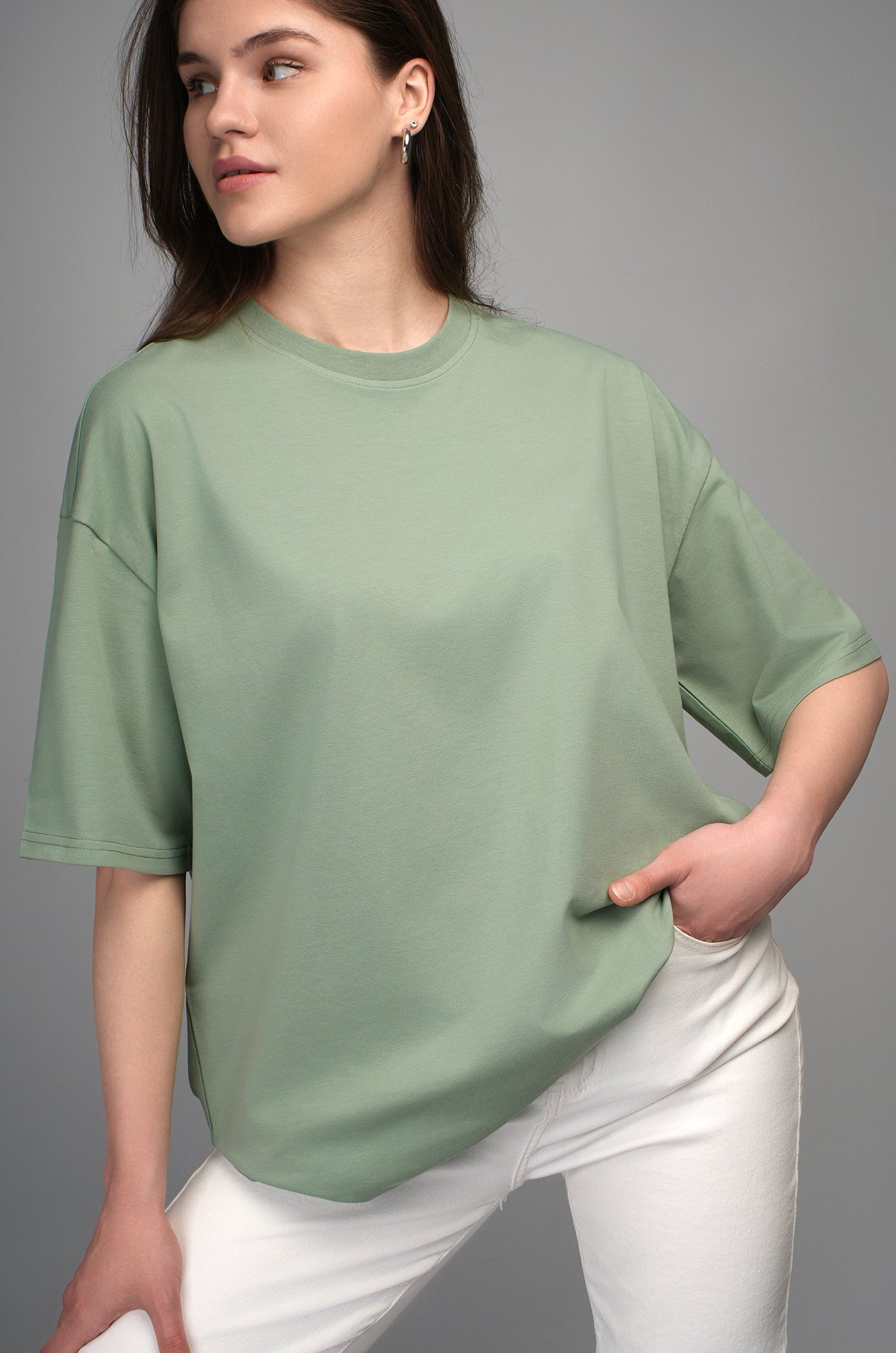 Однотонная женская футболка оверсайз с коротким рукавом выполнена из трикотажа с высоким содержанием хлопка. Стильная футболка светло-зеленого цвета легко сочетается с любым низом. Трендовый крой оверсайз уже не один сезон находится на пике популярности, свободная футболка – это современная база.