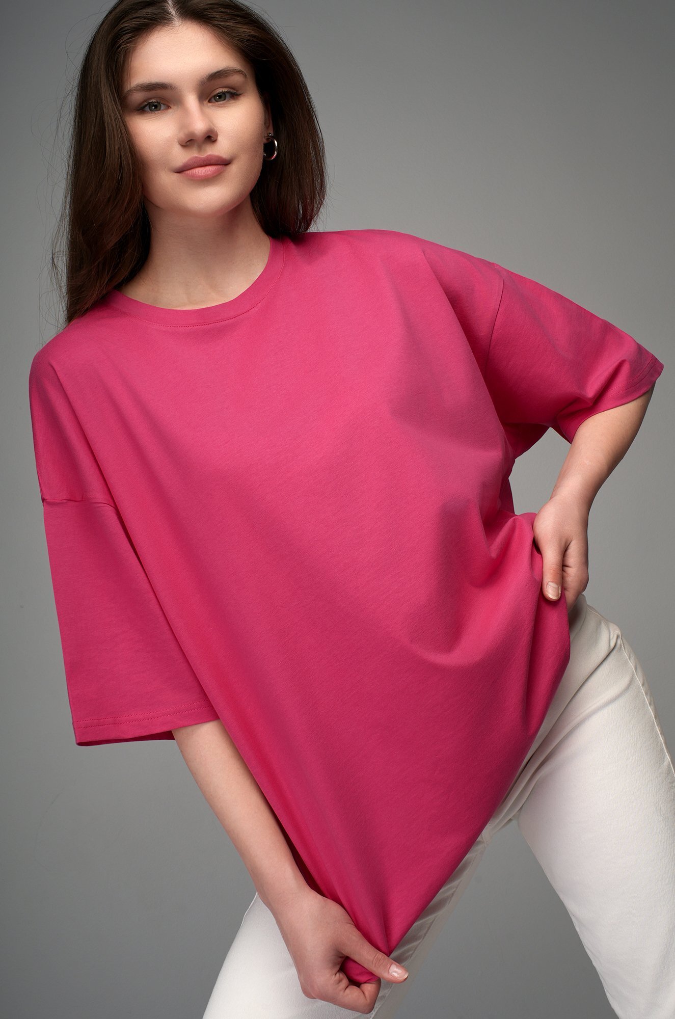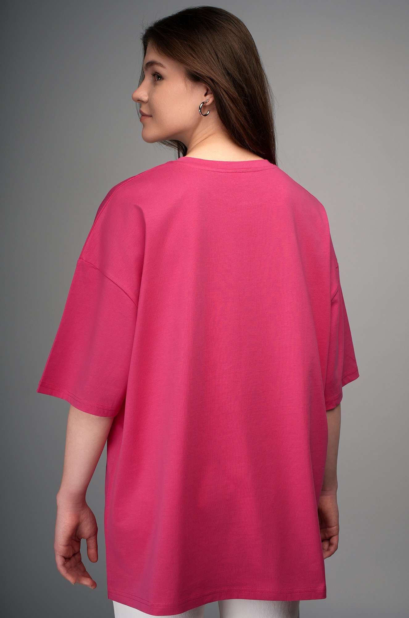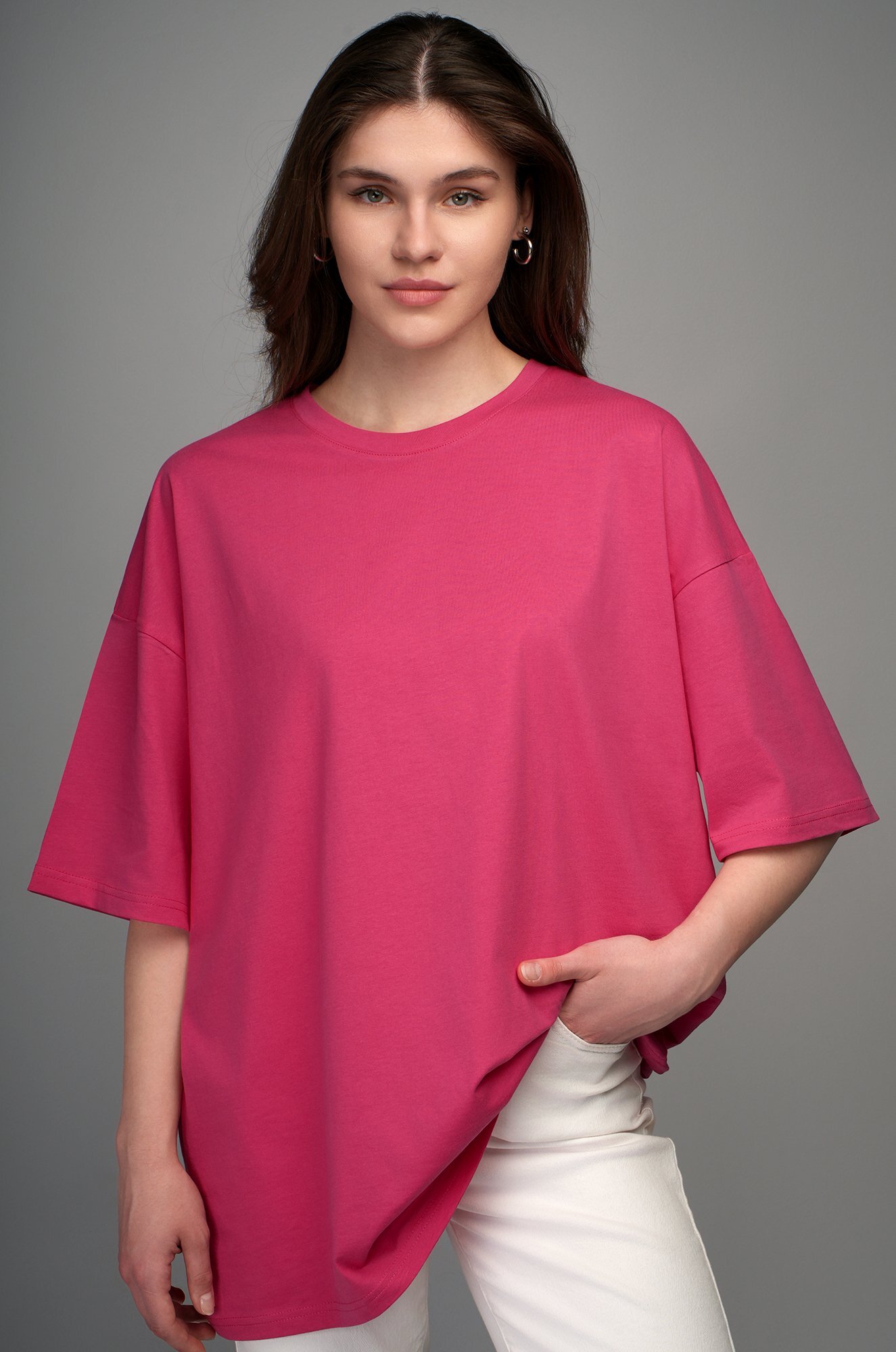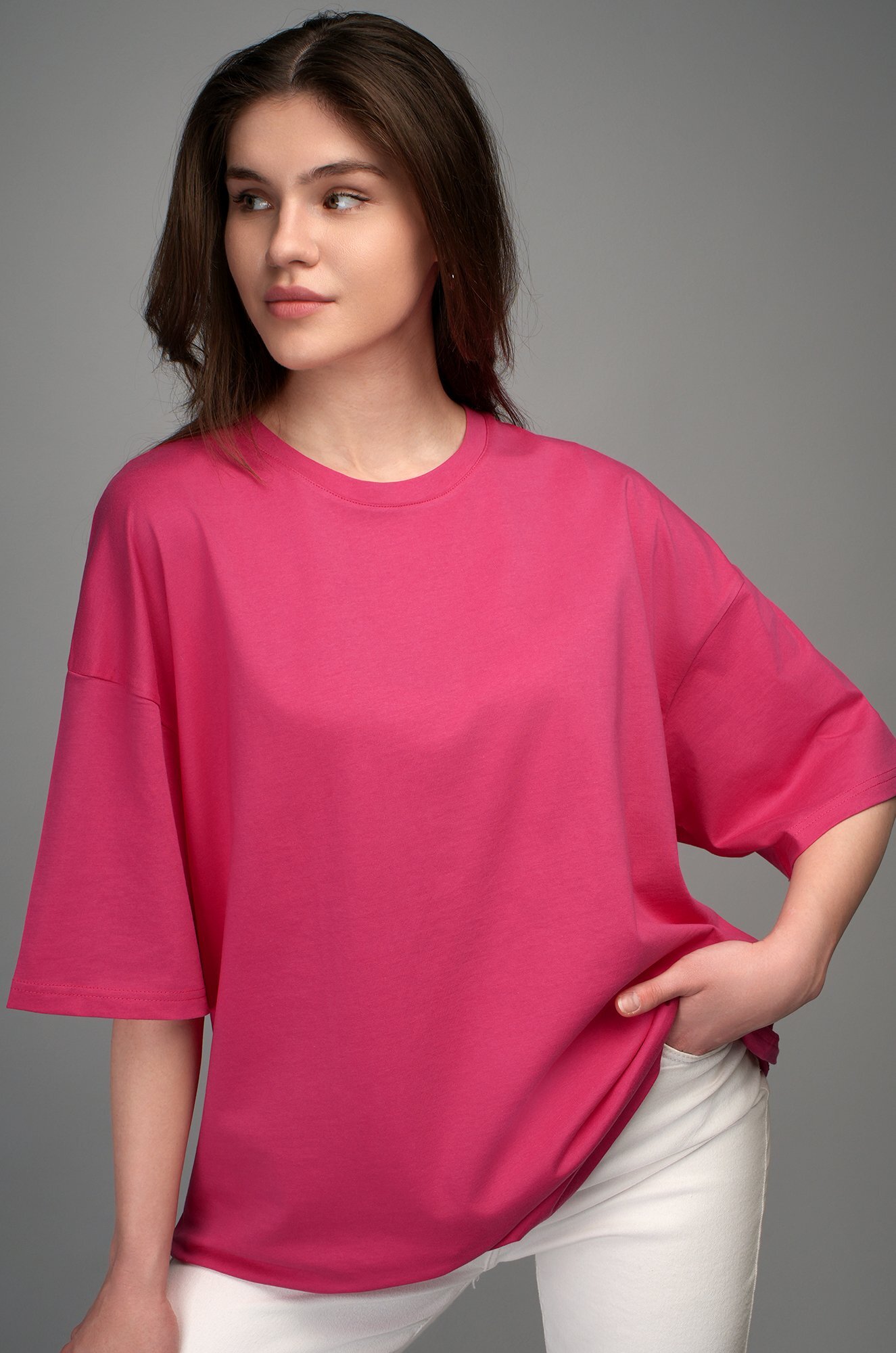 Трикотажная ярко-розовая футболка для женщин отлично подойдёт для образов в уличном стиле.