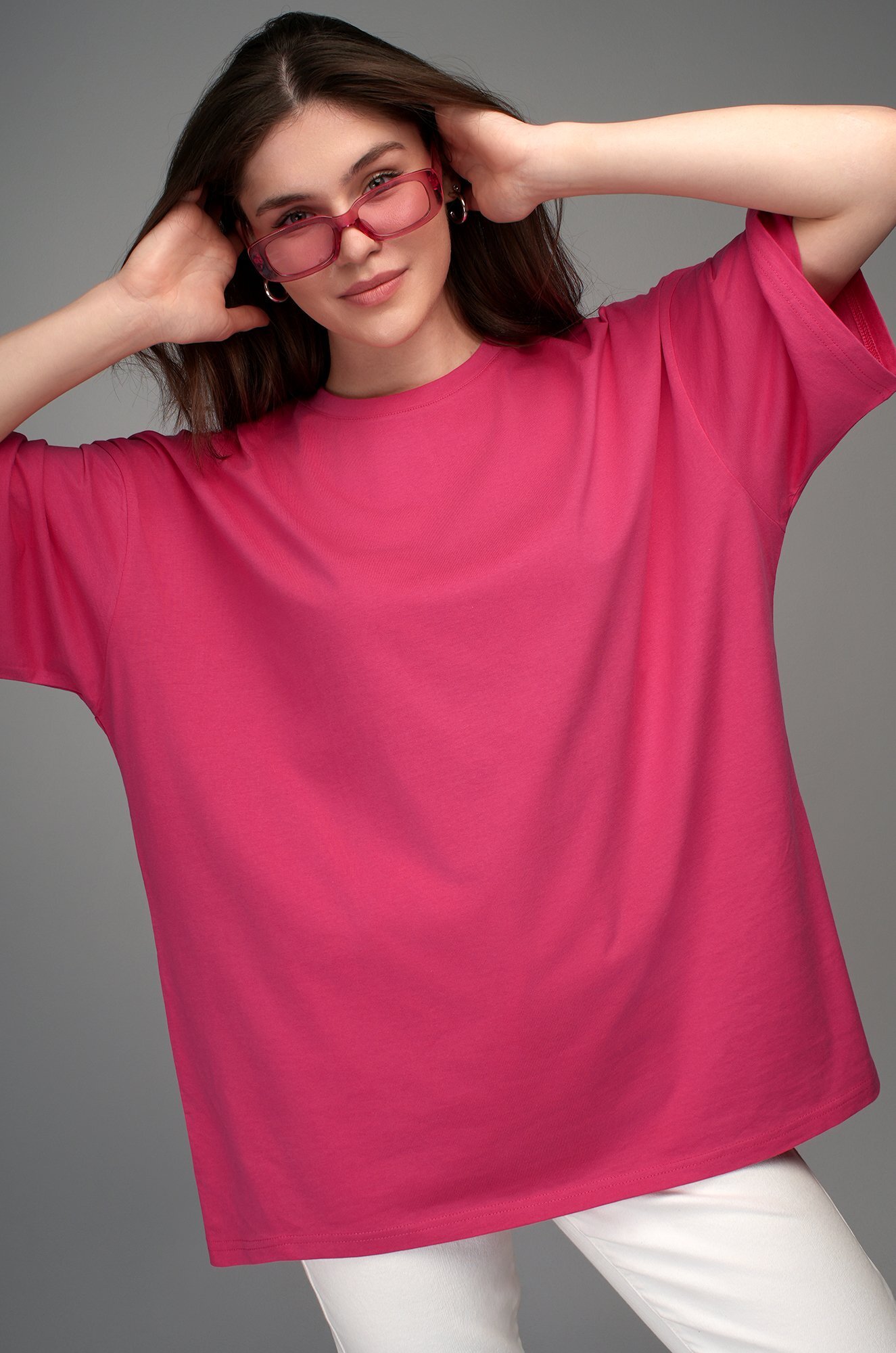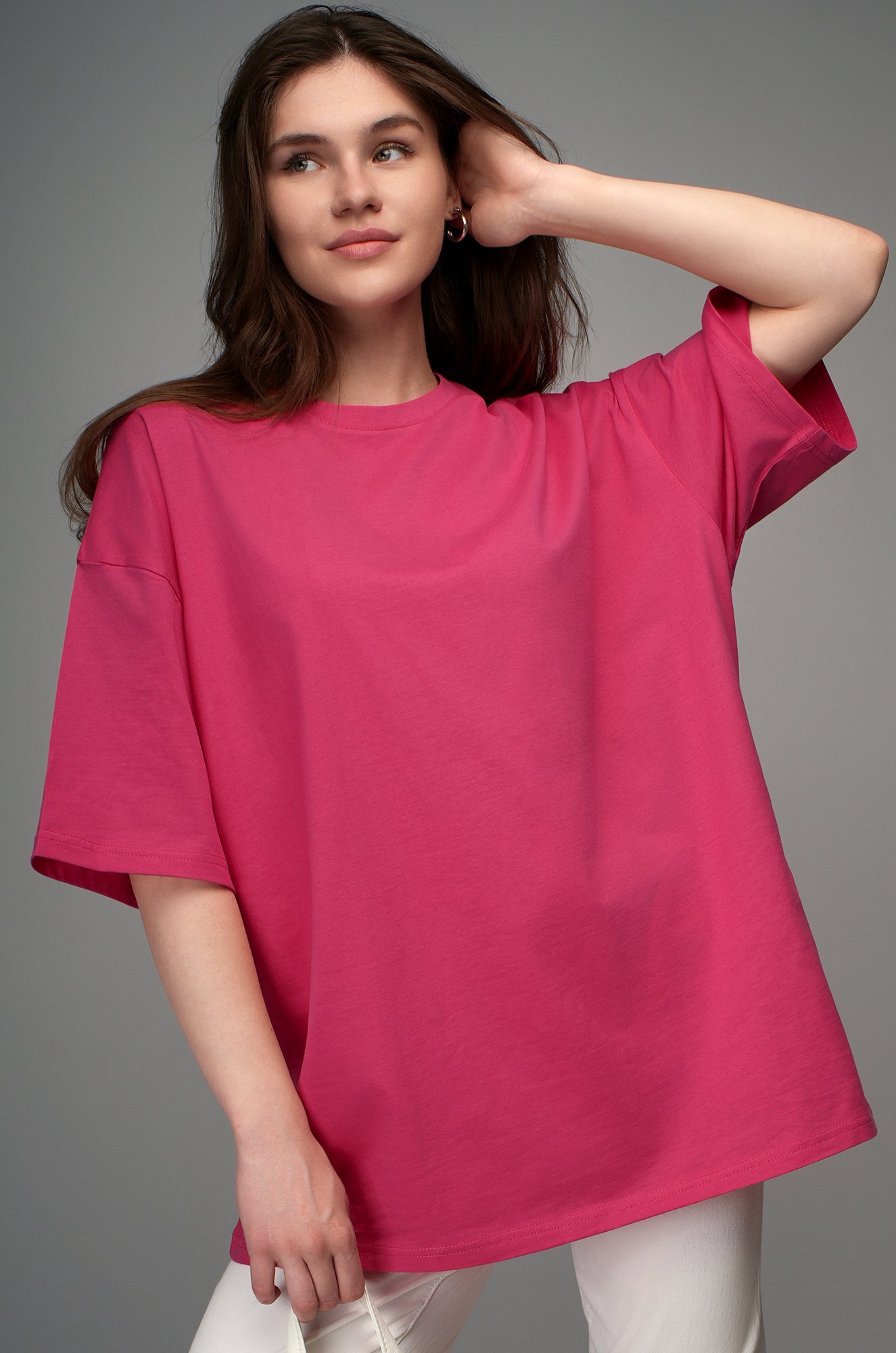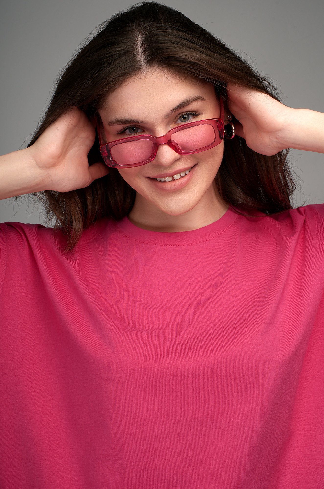 Трикотажная ярко-розовая футболка для женщин отлично подойдёт для образов в уличном стиле.